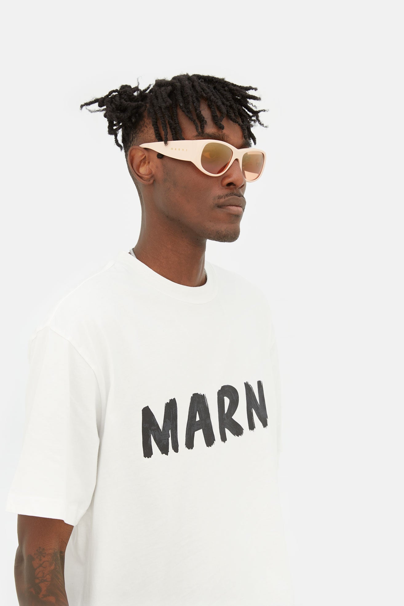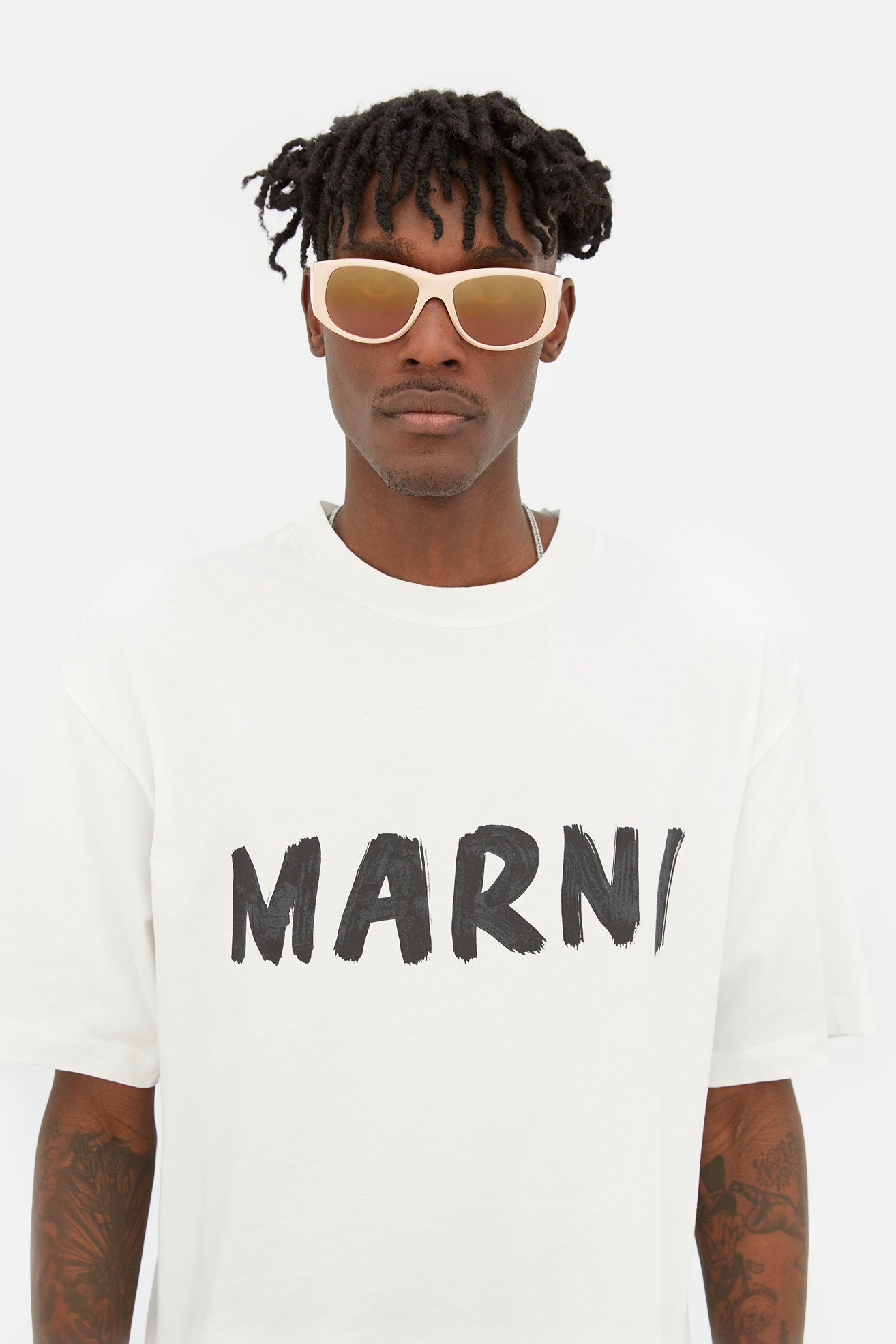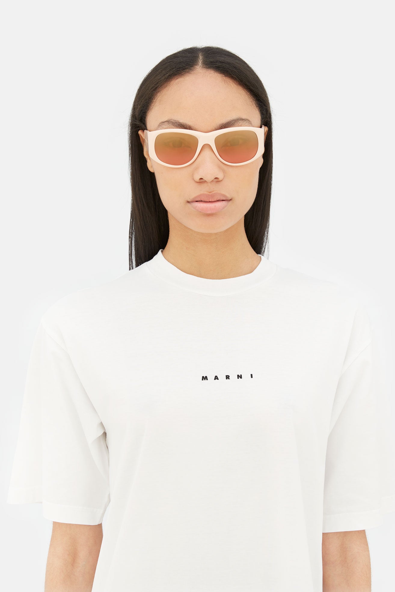 Designed exclusively for Marni, Orinoco River is an oversized shape that re-imagines 1990s grunge aesthetics for a fluid vision of contemporary style. The silhouette features a wide, horizontal geometry characterized by thick temples and broad rounded lenses. The upper line forms a distinctive V-shape, constructing a compact nose-bridge for a perfect fit. This model blends the boundaries between Marni’s eclectic style and an uncompromising modern aesthetics. This version comes with a light peach acetate and orange tinted lenses.