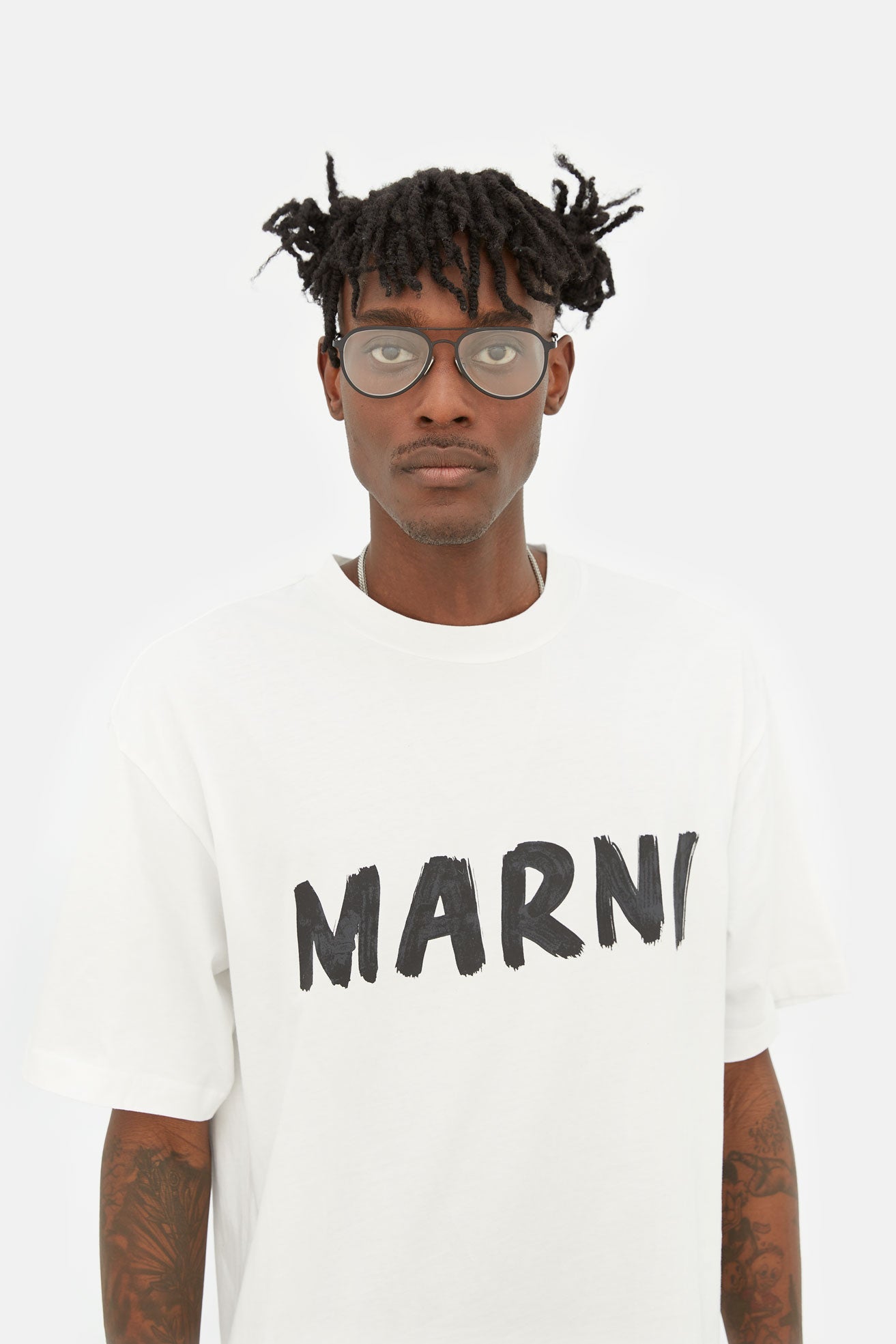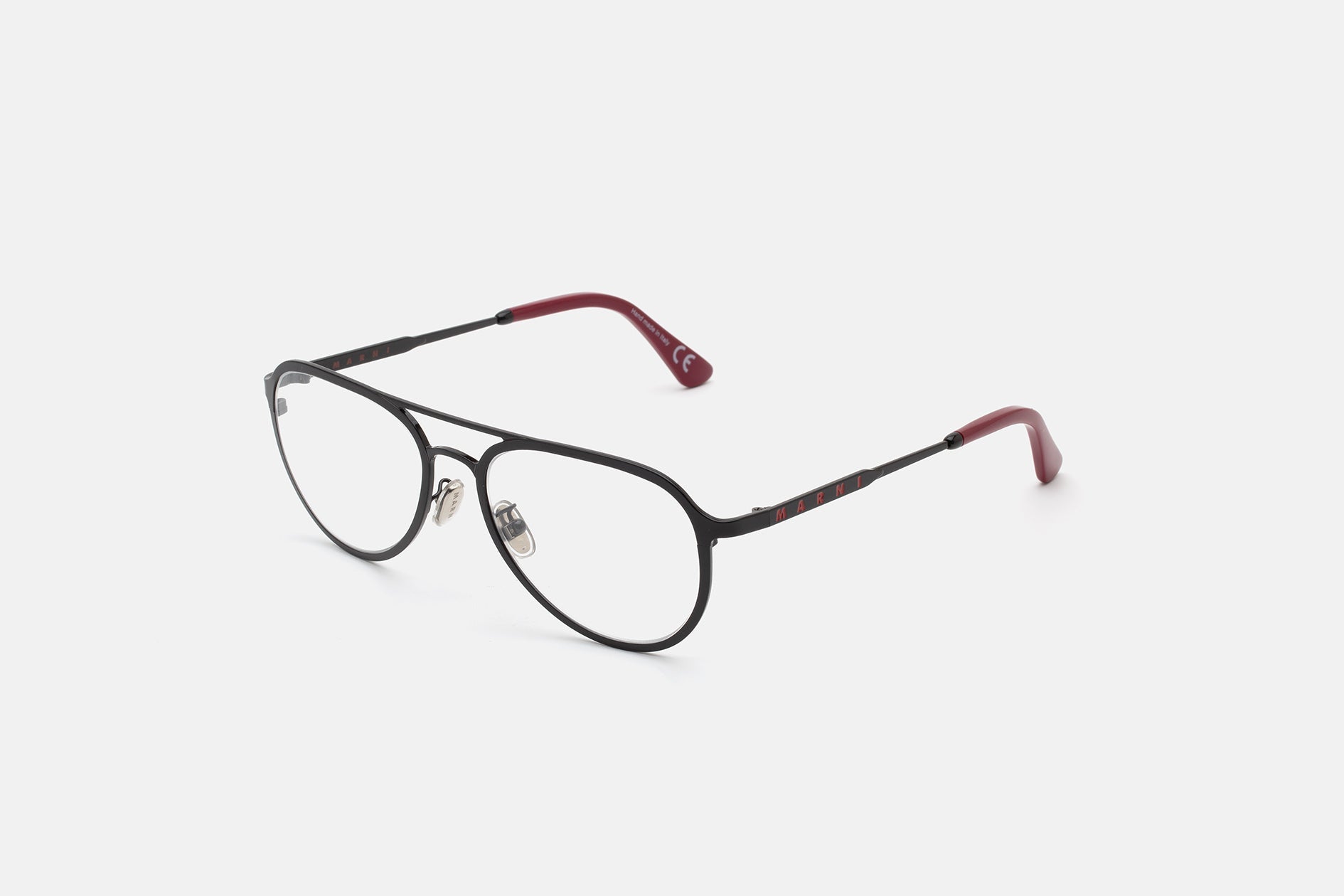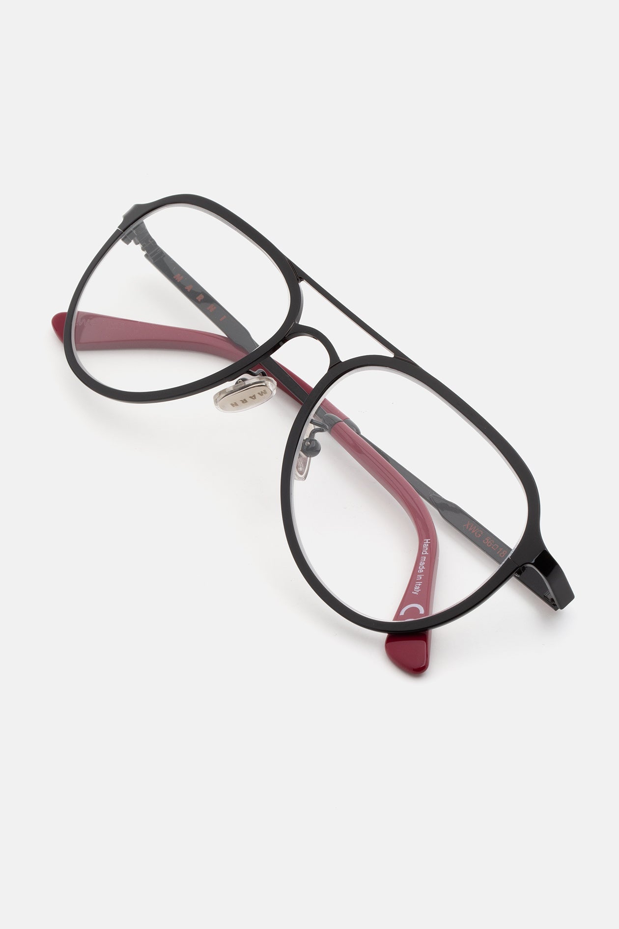 Designed exclusively for Marni, Palawan Island is an edgy optical frame conceived as an eclectic interpretation of pear-shaped aviator silhouettes. The model features thick metal rims that give it a unique bold character, capturing the distinctive flair of 1970s aesthetics. This model comes in a dark black finish with burgundy temples.