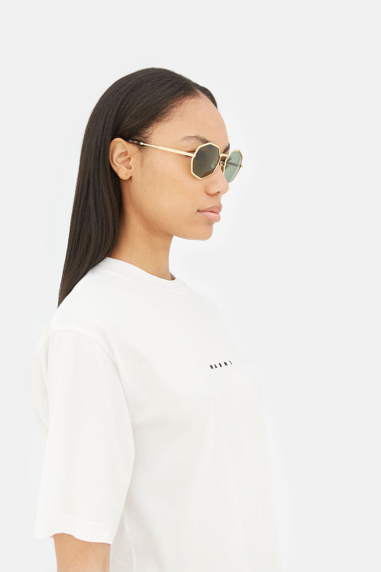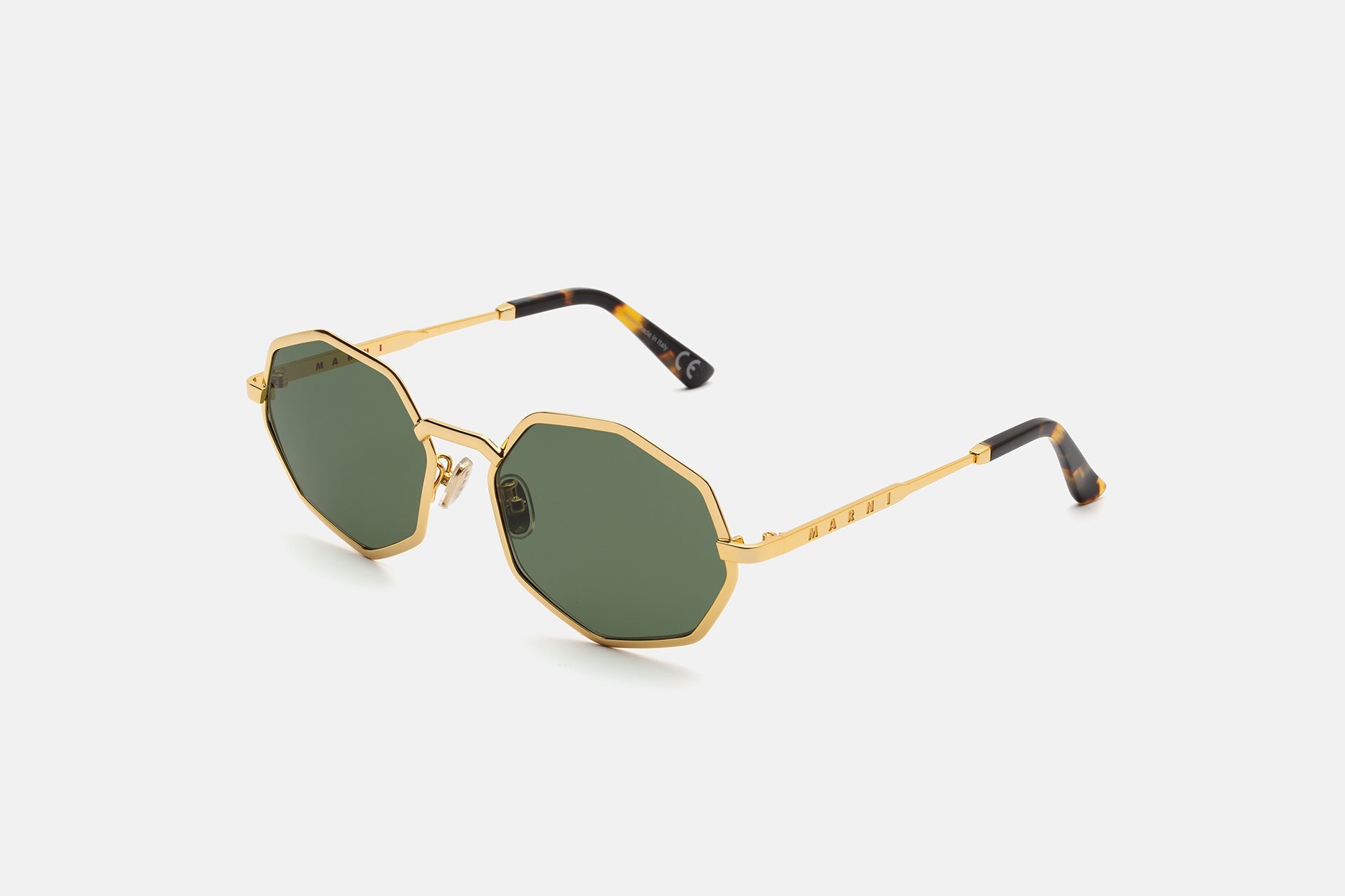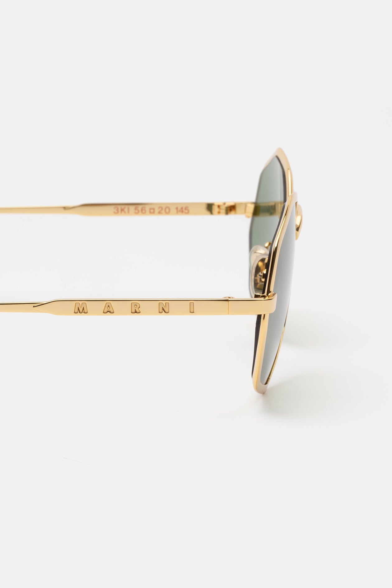 Pulpit Rock is an exclusive silhouette designed for Marni that features an all-metal construction. An edgy, innovative shape Pulpit Rock is an oversized model designed with reference to 1970s eclecticism, updated for a fresh contemporary aesthetics. Its oversized lenses are encased within angular, octagonal rims elevating the classic metal designs. This model comes in gold metal finish and green tinted lenses.