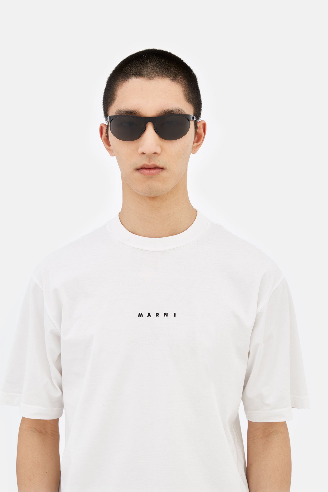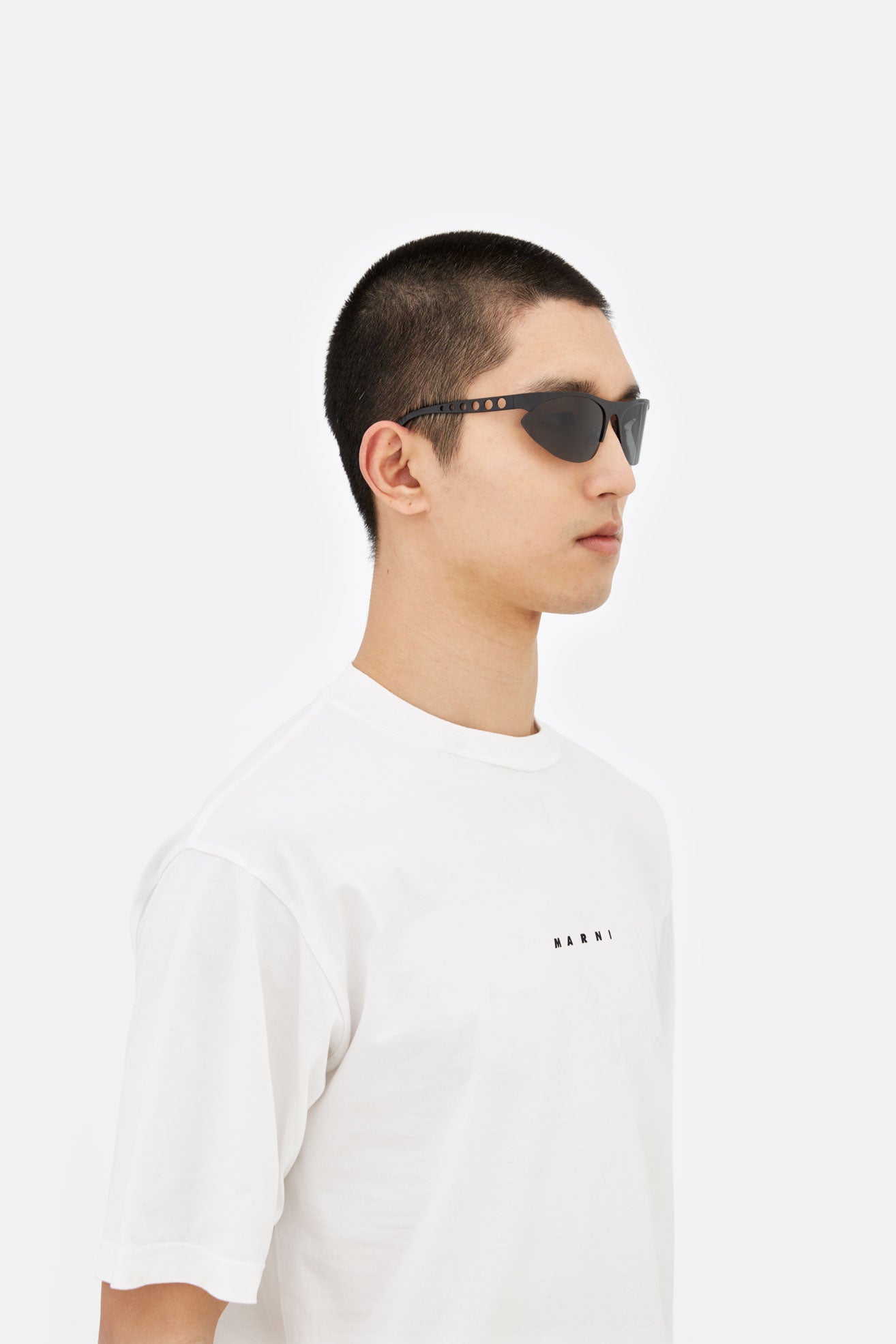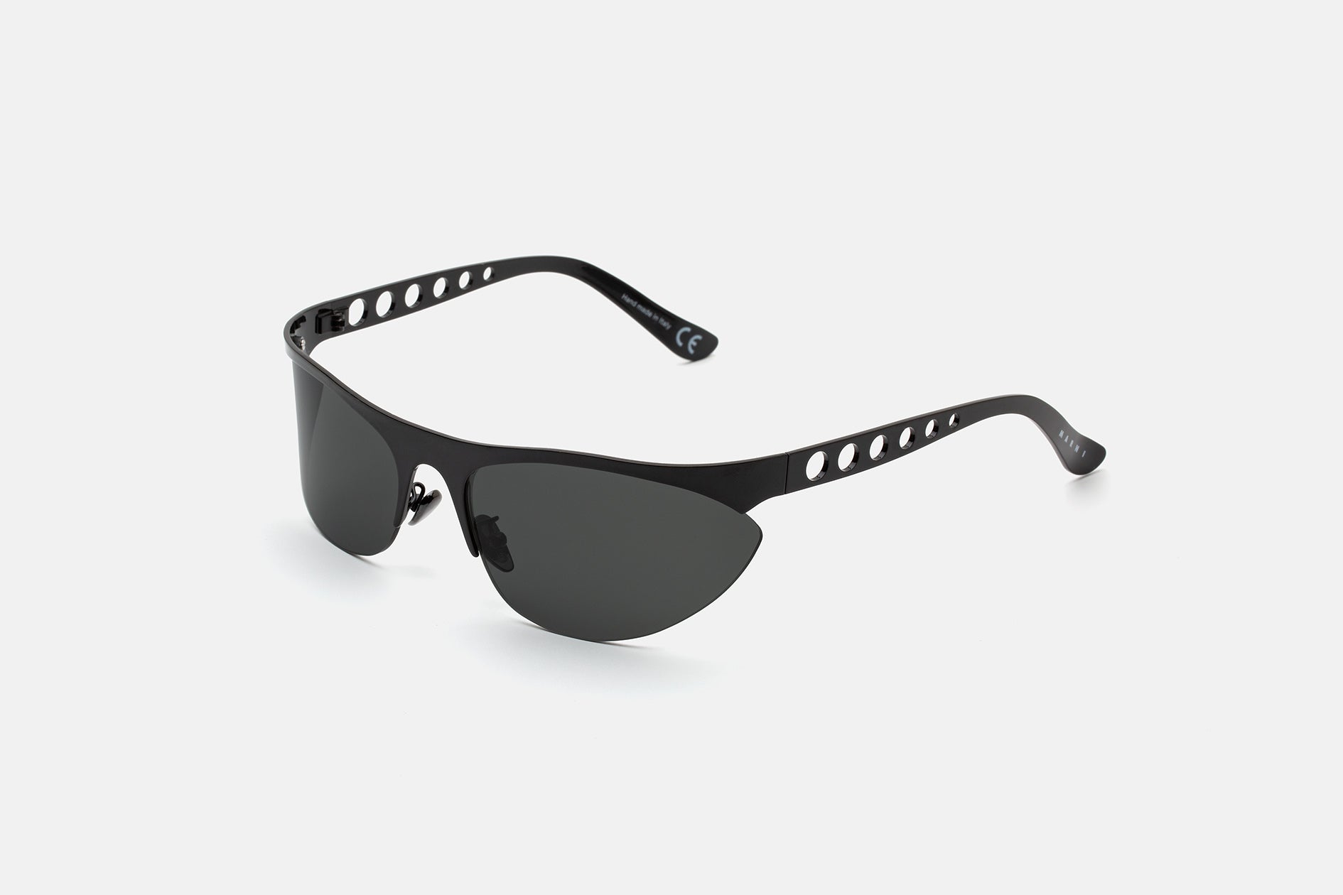Designed exclusively for Marni, Salar De Uyuni is an iconic silhouette that pushes the boundaries of contemporary style. Embracing a fluid modern aesthetic, this model sits at the intersection of streamlined sportswear and high-end fashion, past visionary designs and sharp 21st century geometries. It features almond-shaped lenses encased with a straight, linear brow-line and temples with laser-cut round shapes. This version comes in a shiny black metal finish with smoky grey lenses.