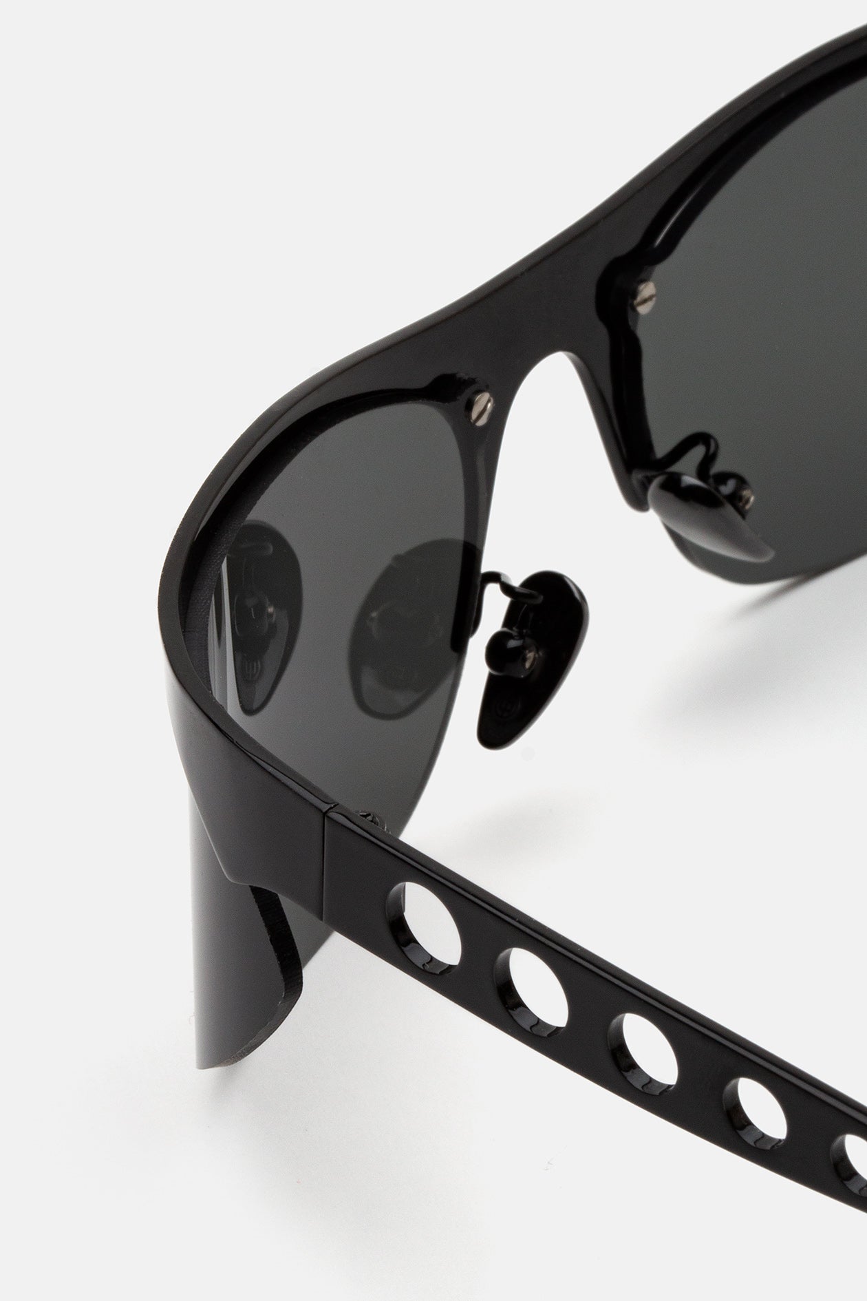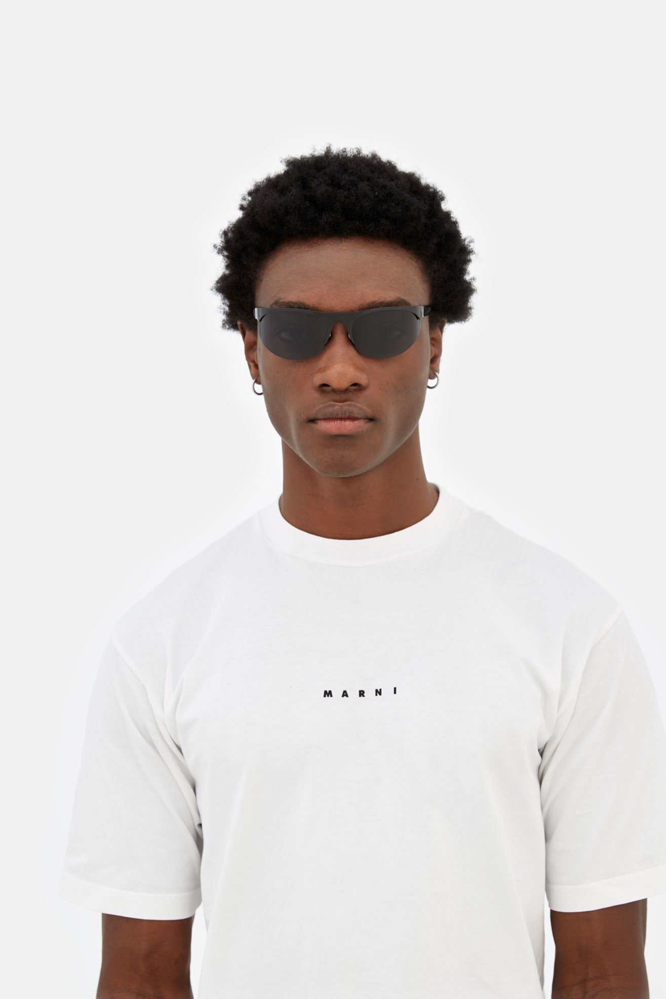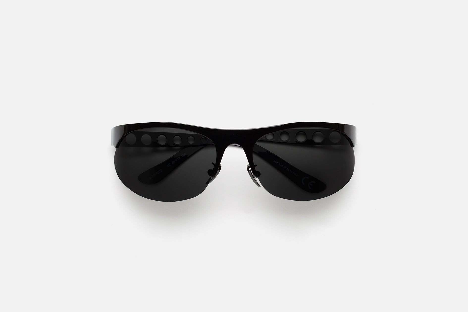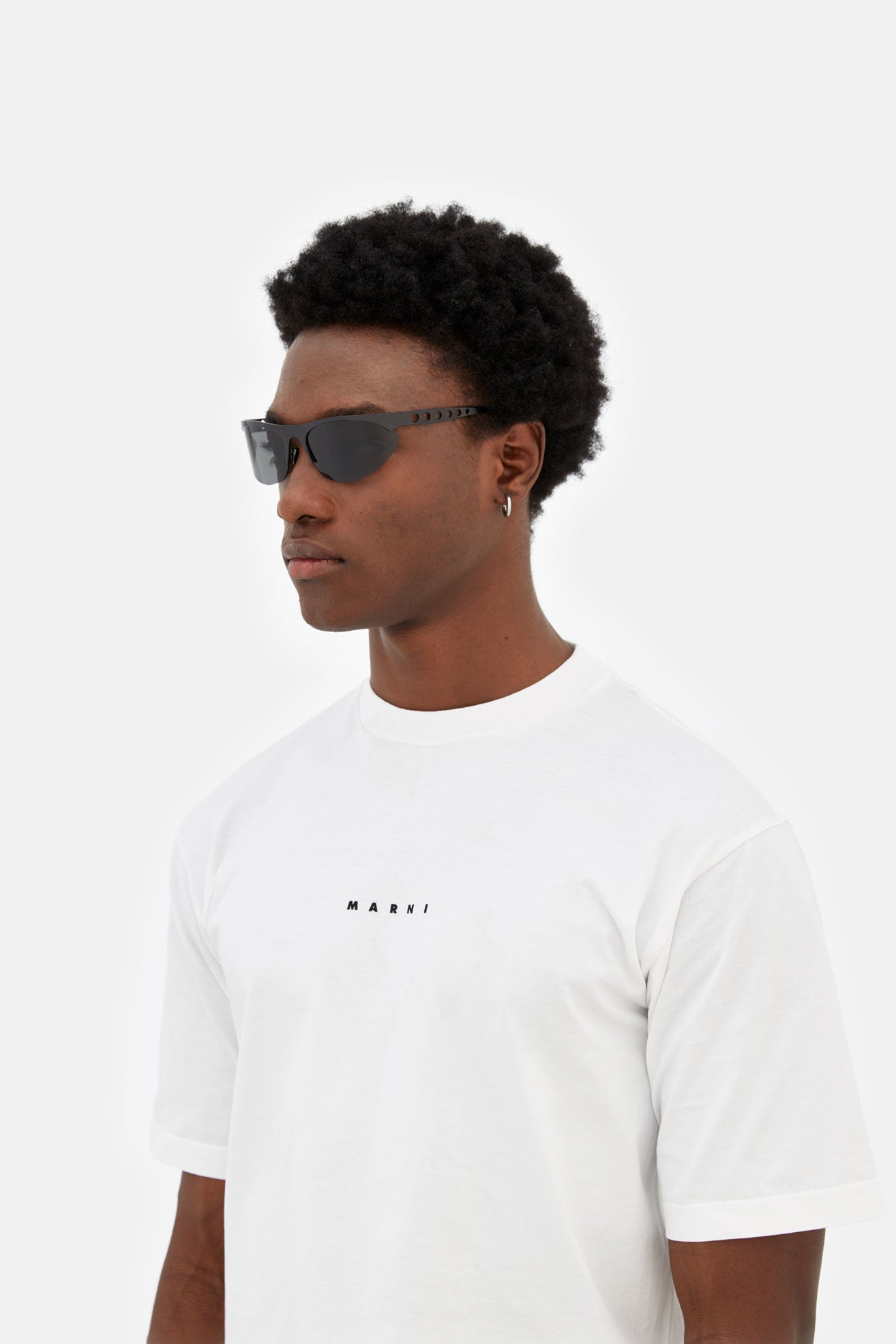 Designed exclusively for Marni, Salar De Uyuni is an iconic silhouette that pushes the boundaries of contemporary style. Embracing a fluid modern aesthetic, this model sits at the intersection of streamlined sportswear and high-end fashion, past visionary designs and sharp 21st century geometries. It features almond-shaped lenses encased with a straight, linear brow-line and temples with laser-cut round shapes. This version comes in a shiny black metal finish with smoky grey lenses.