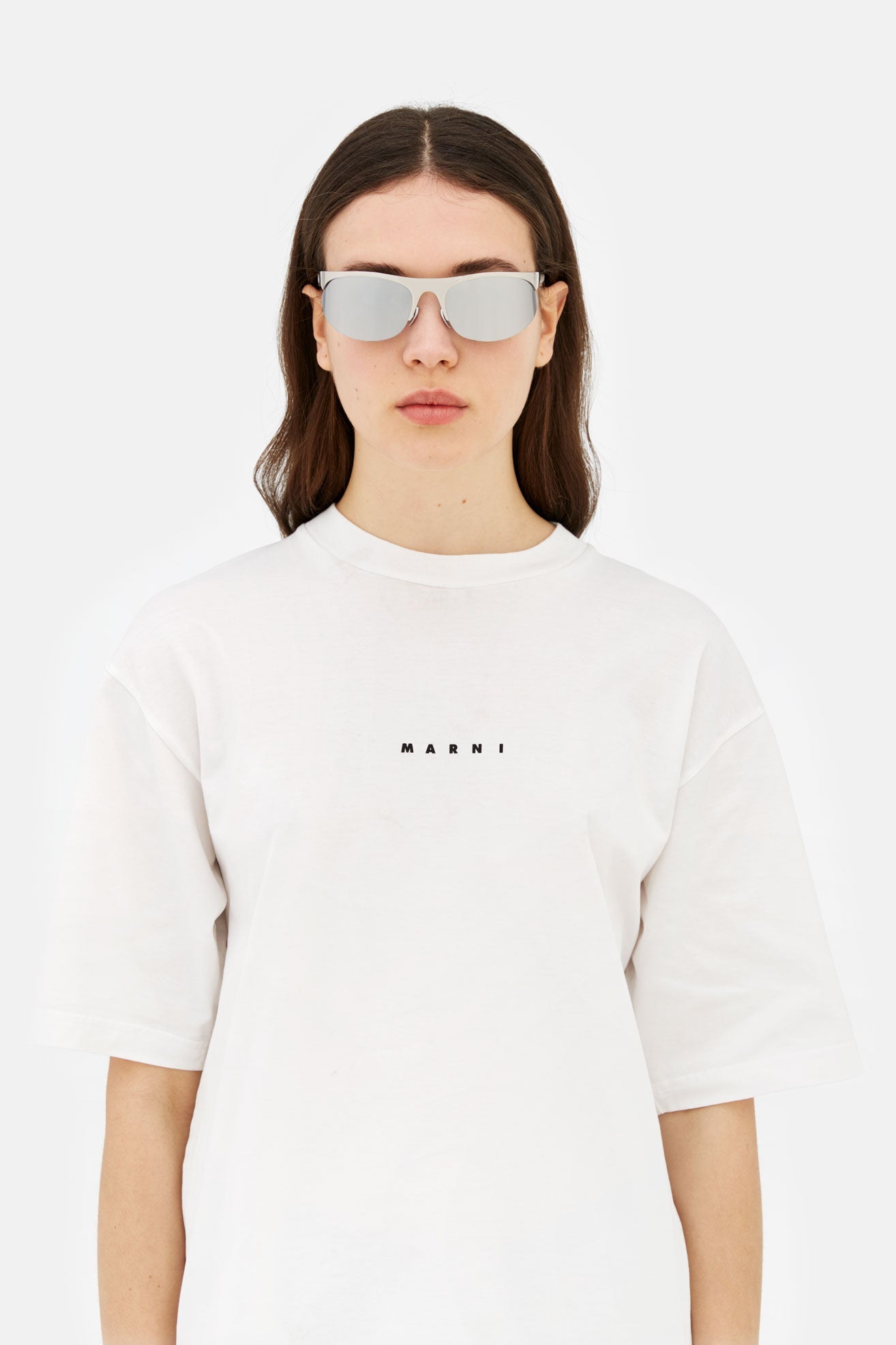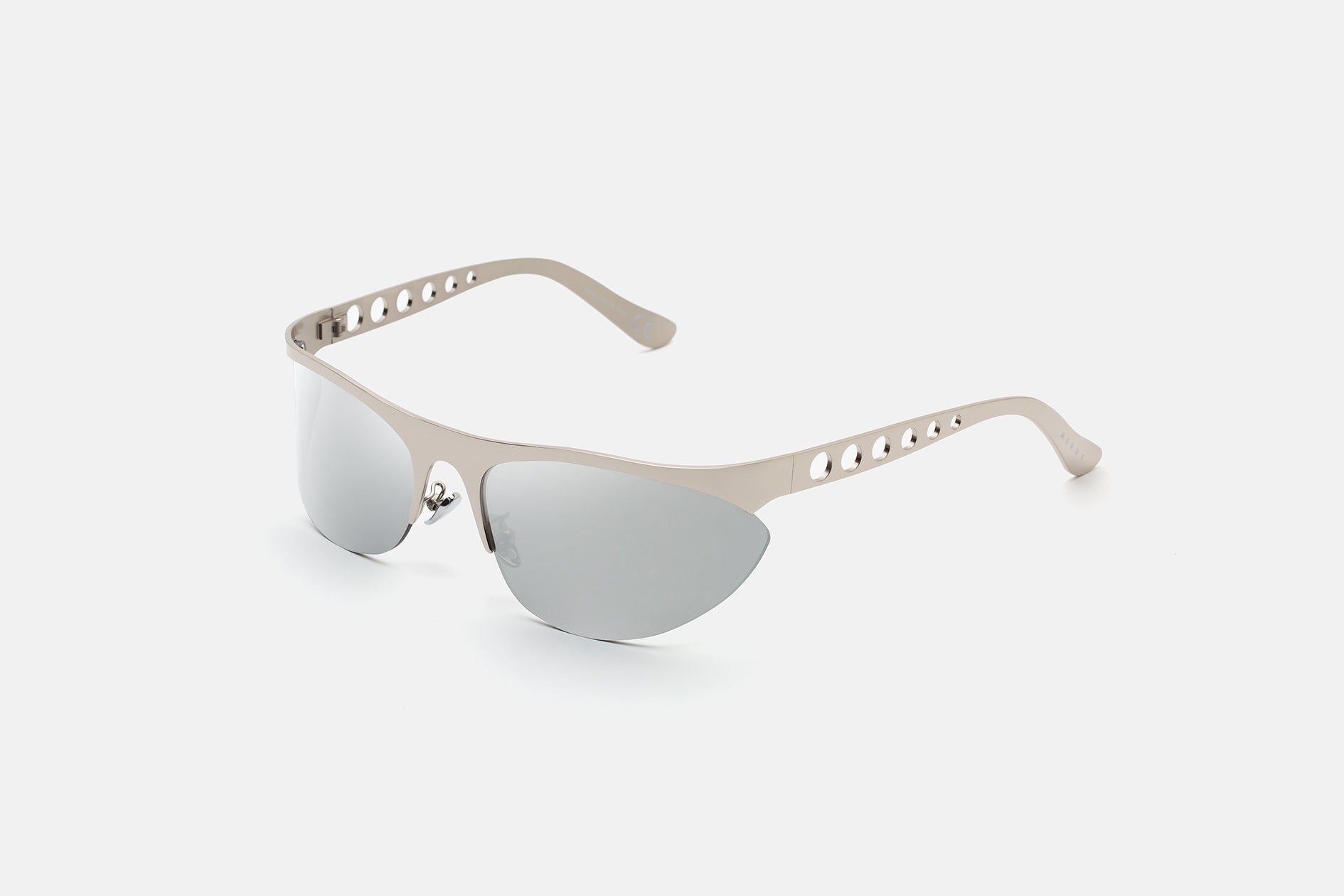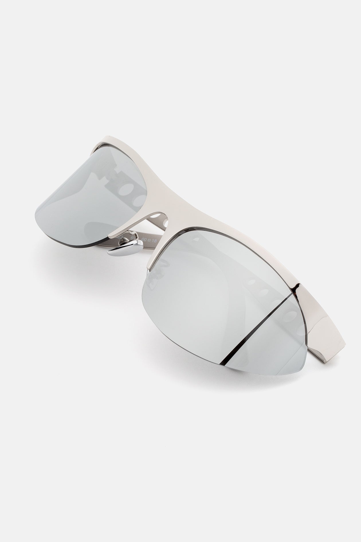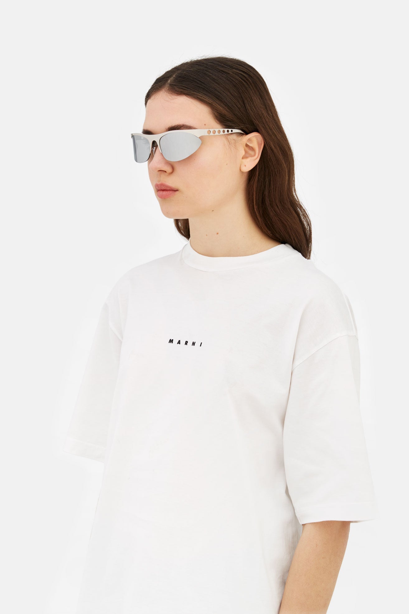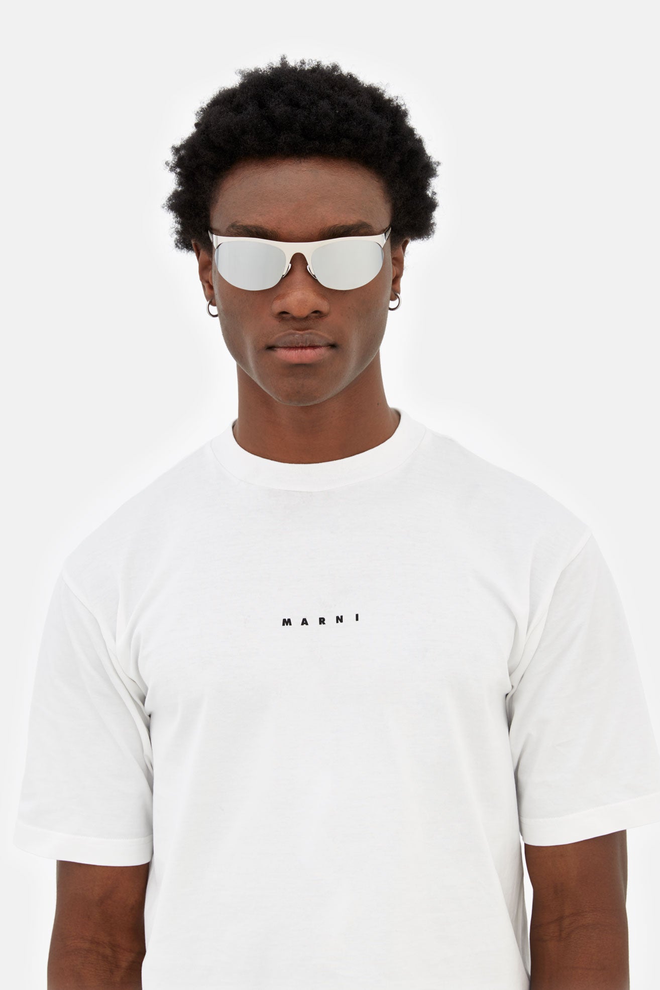 Designed exclusively for Marni, Salar De Uyuni is an iconic silhouette that pushes the boundaries of contemporary style. Embracing a fluid modern aesthetic, this model sits at the intersection of streamlined sportswear and high-end fashion, past visionary designs and sharp 21st century geometries. It features almond-shaped lenses encased with a straight, linear brow-line and temples with laser-cut round shapes. This version comes in a silver metal finish with matching lenses.