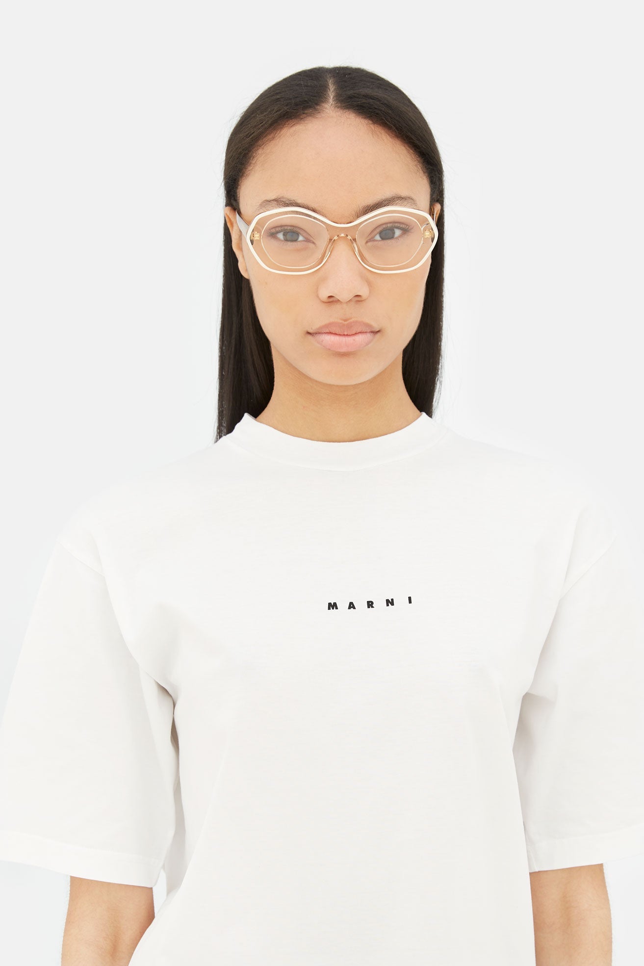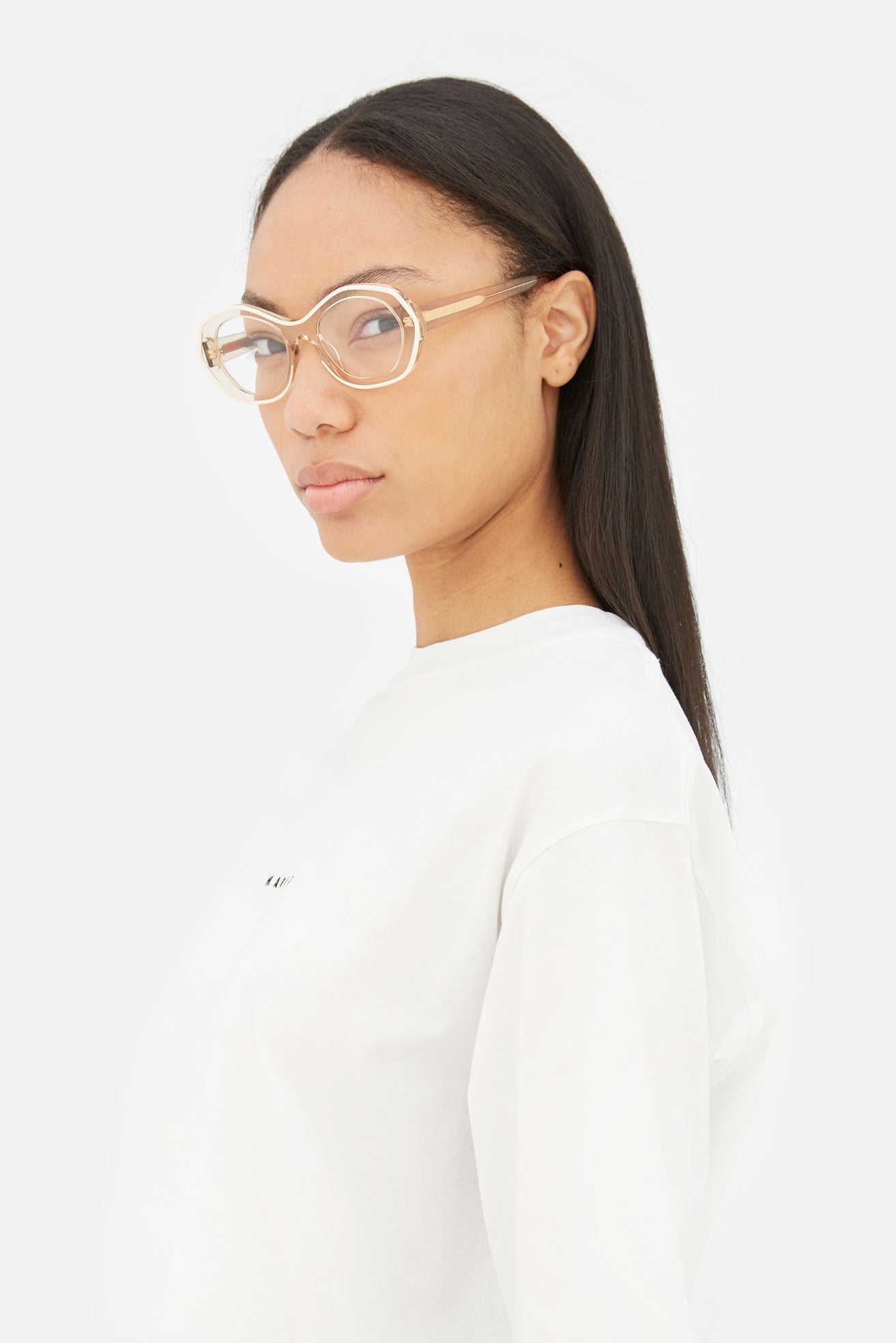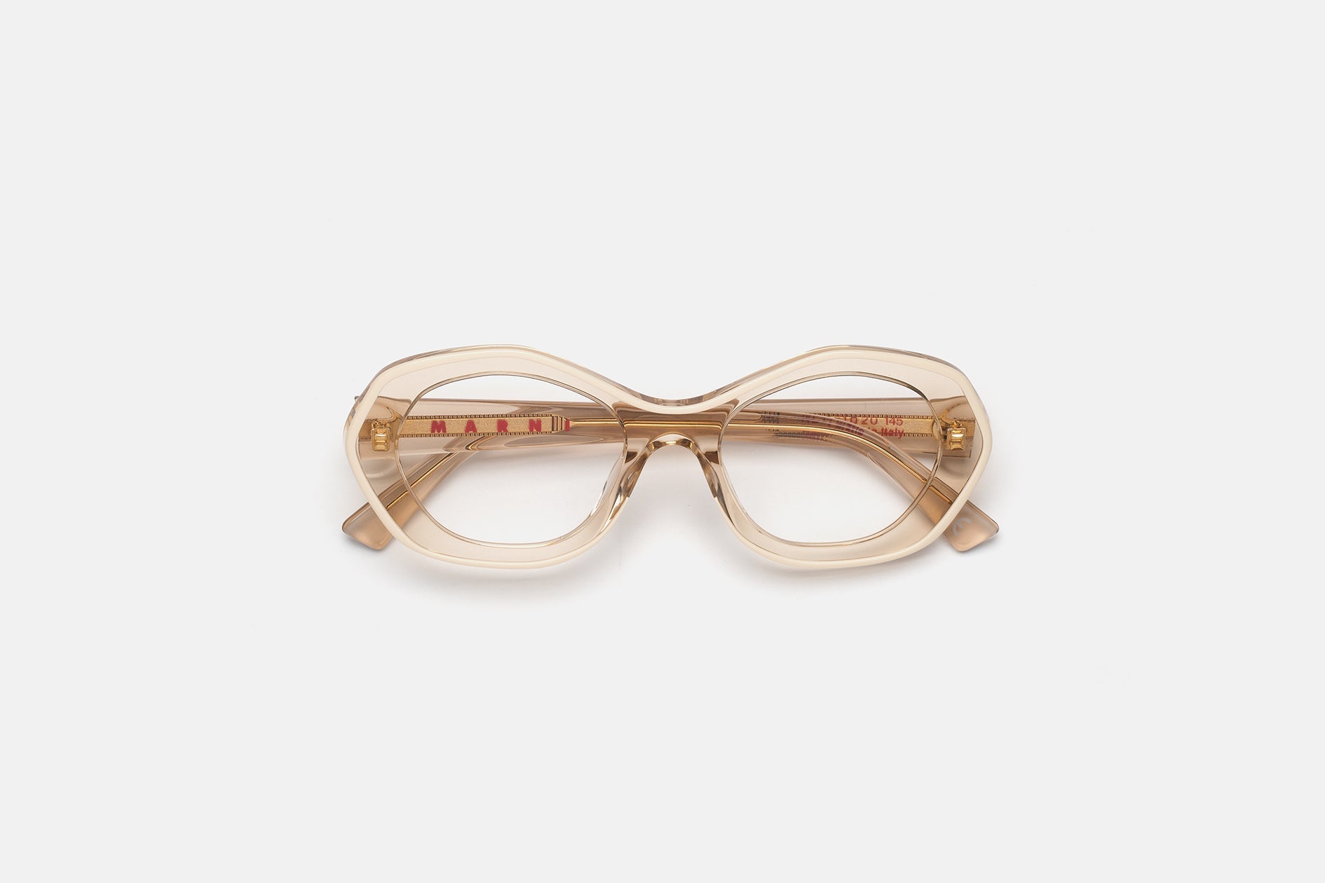Designed exclusively for Marni, Ulawun Volcano is an eclectic silhouette characterised by oversized lenses and octagonal rims. Inspired by vintage 1960s aesthetics, these chunky glasses are a playful addition to everyday style. The acetate has been chiselled on the sides for lightness and comfort, while a lowered nose-bridge ensures a compact fit. This model comes in a light creamy acetate.