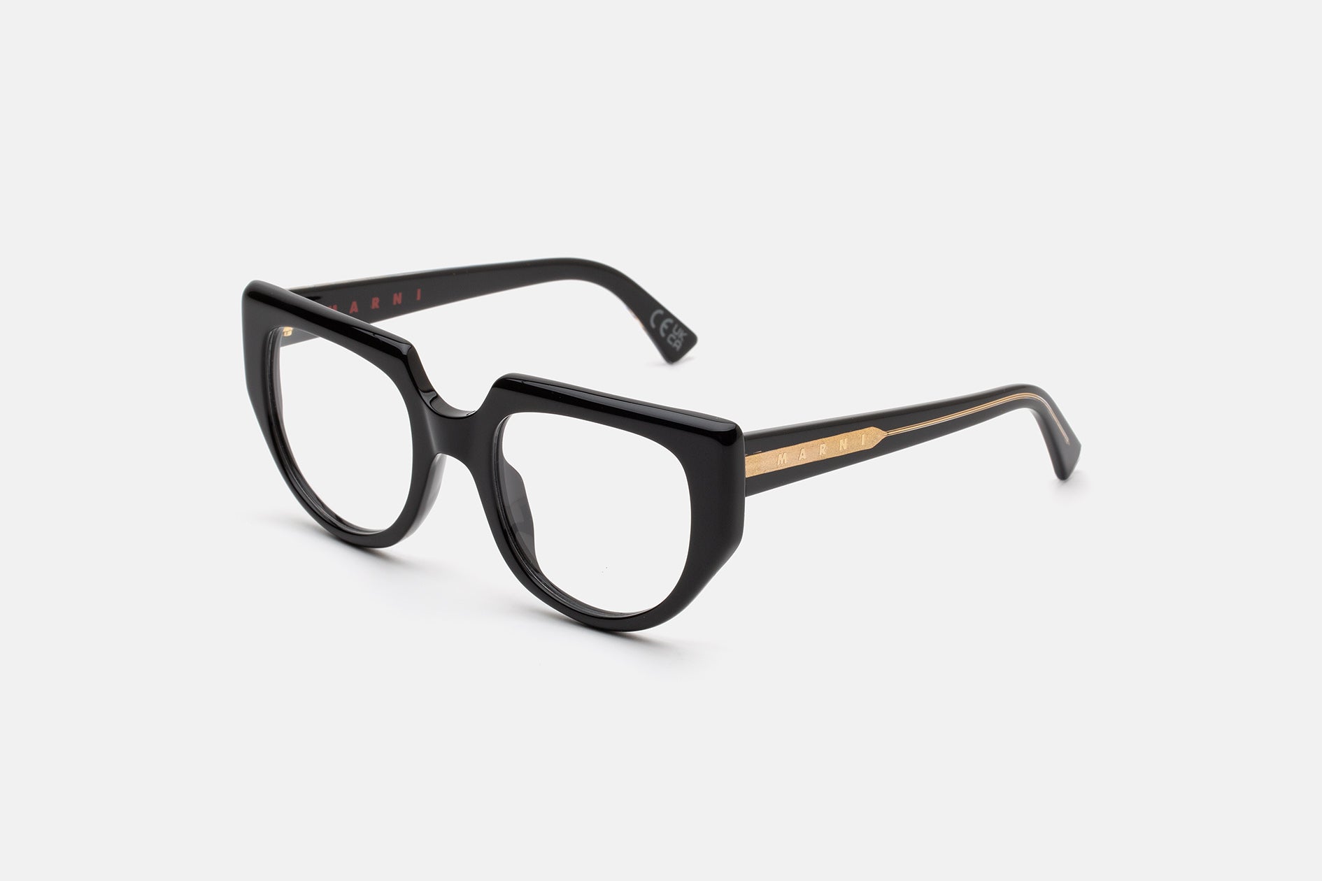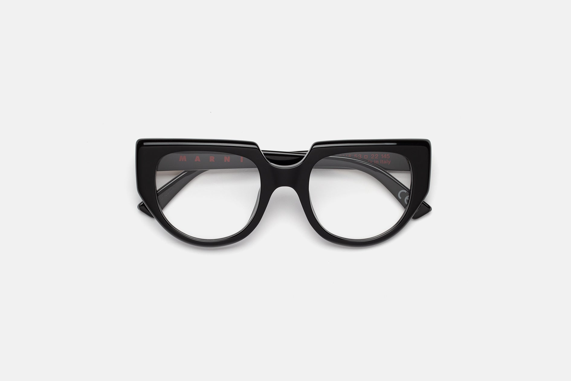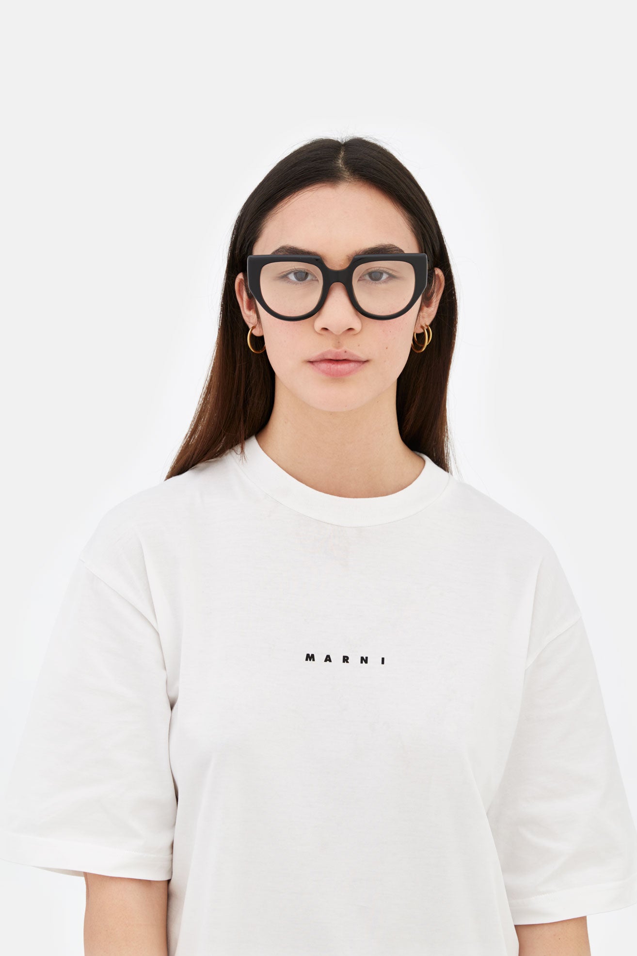 Designed exclusively for Marni, Uluru is a sturdy Optical silhouette characterised by unique geometries and asymmetrical design features. The model blends squared detailing with carefully rounded curves for an innovative aesthetics. Different thicknesses are placed in strategic areas for extra strength, a strong brow-piece is matched by slender rims on the lower part of the frame. This is a sophisticated model that captures Marni’s quirky approach to style. This version is available in shiny black acetate.