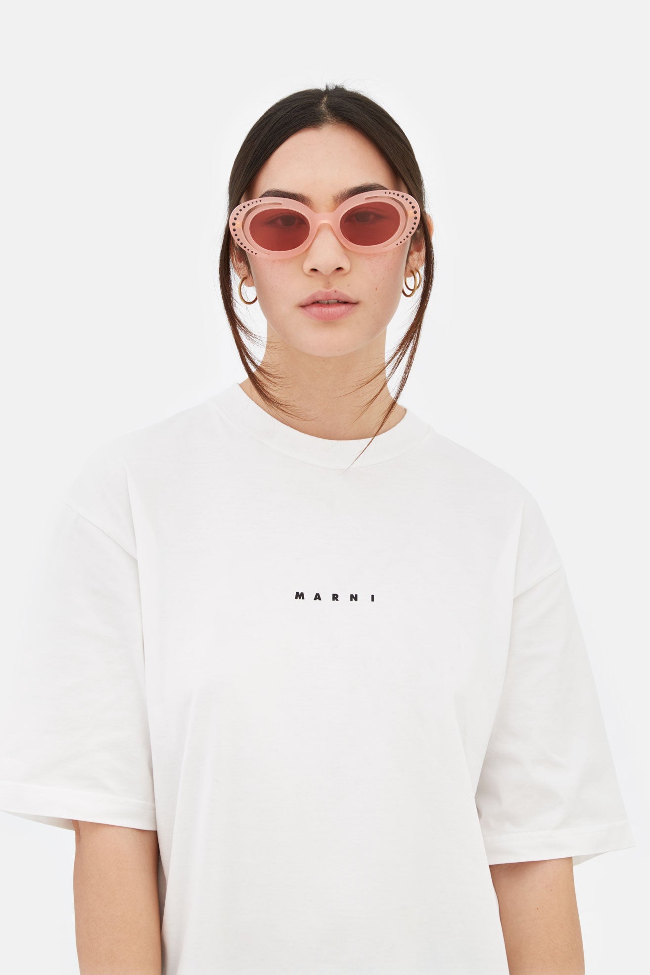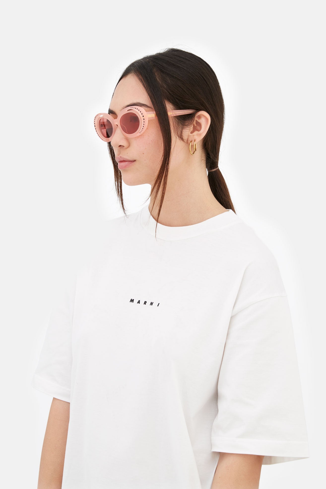 Designed exclusively for Marni, Zion Canyon is a unique silhouette characterised by an innovative, unexpected design and construction that elevates the oval frame. The model’s curvaceous and space-like rims have been completely carved out to form a half-moon shape on the outer edge. Sophisticated gems encased within the external acetate rings further elevate the piece’s shape while showcasing exceptional craftmanship and know-how of the made in Italy. This model is available in a pale pink acetate with bordeaux lenses.