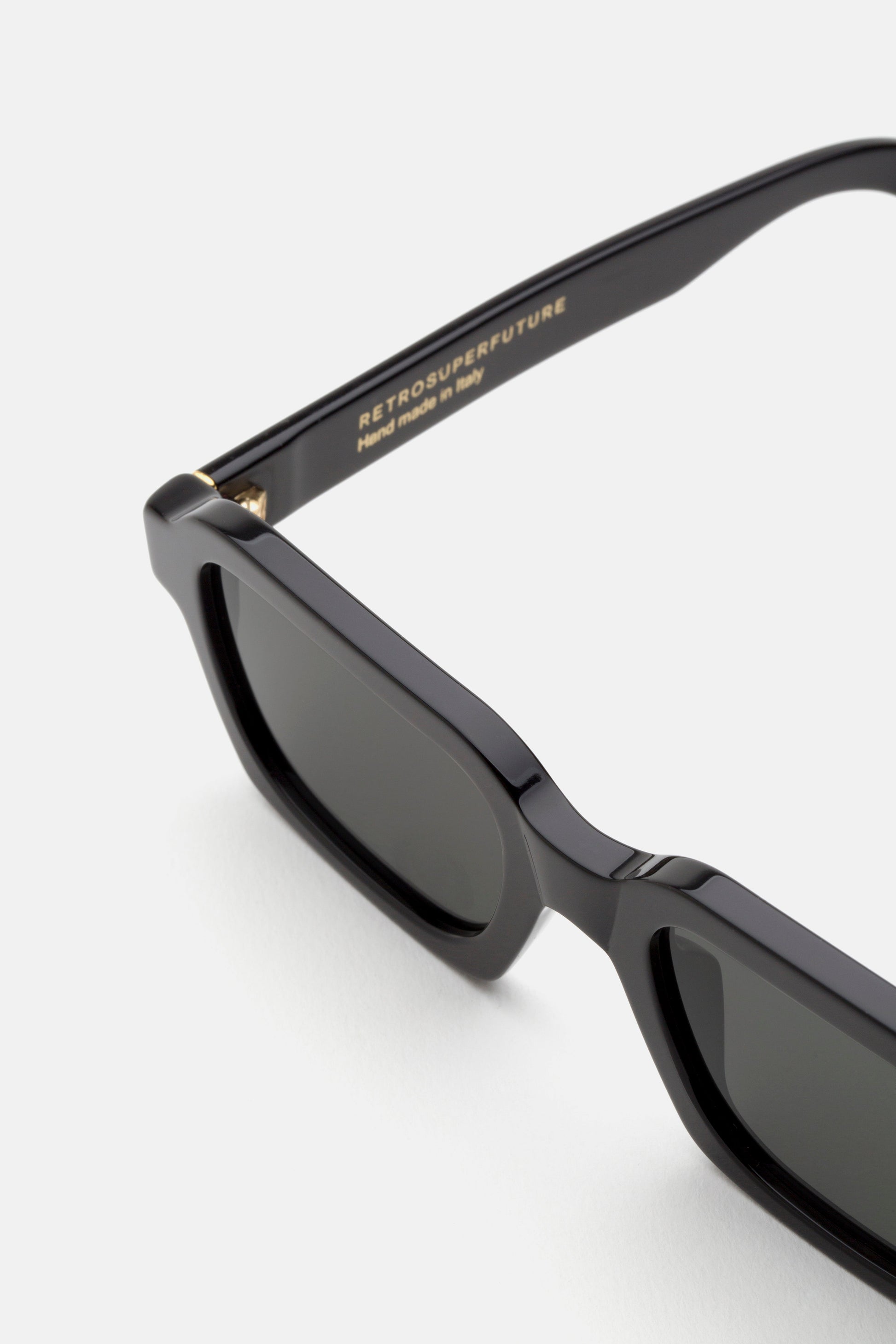 Caro is a wide, geometric silhouette that blends 1960s Italian classicism with 1990s grunge aesthetic. The model features a well-rounded design with a thick, sturdy acetate structure, squared temple tips and angular rims on the lower half of the frame. This version of Caro comes with black acetate and light brown lenses.