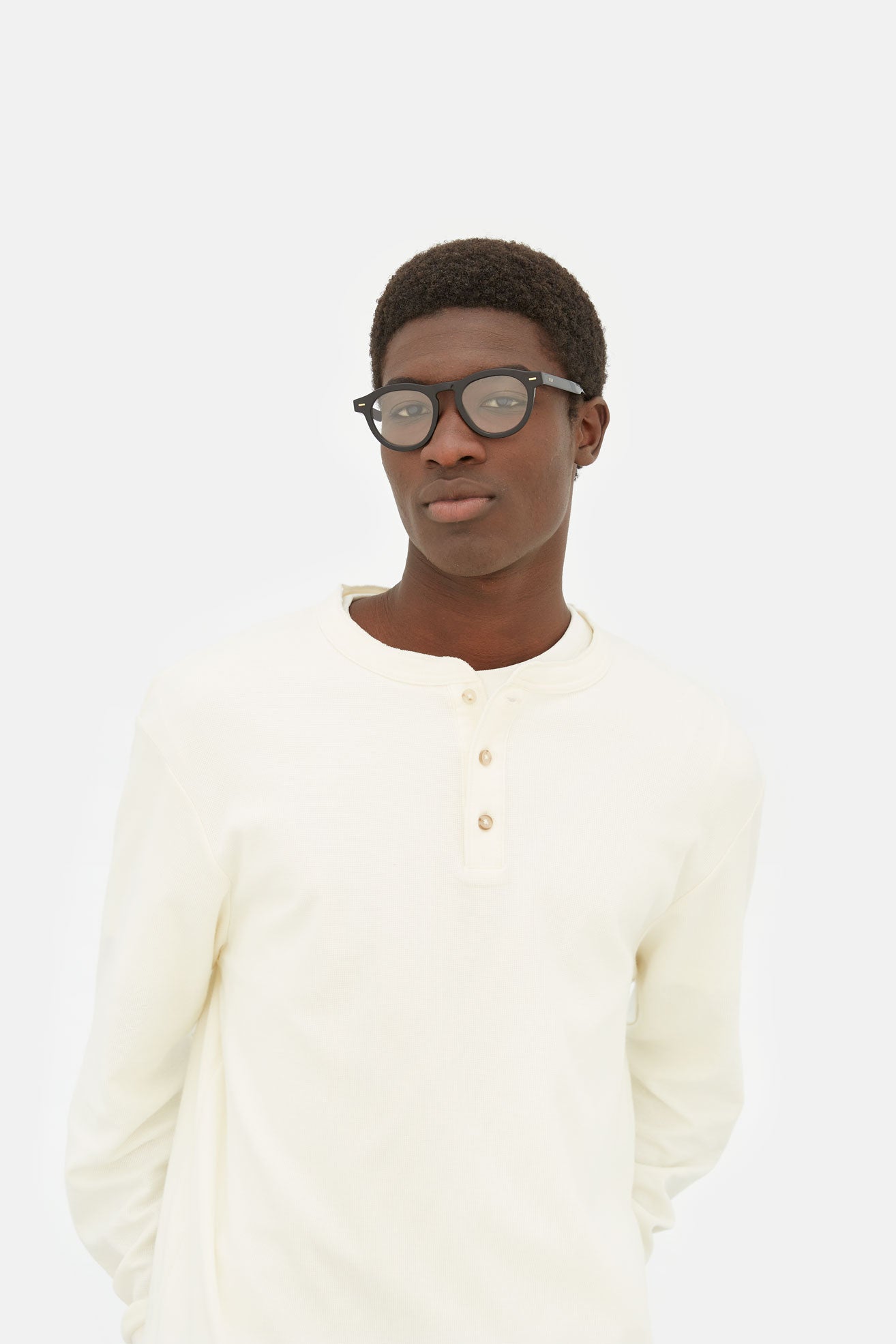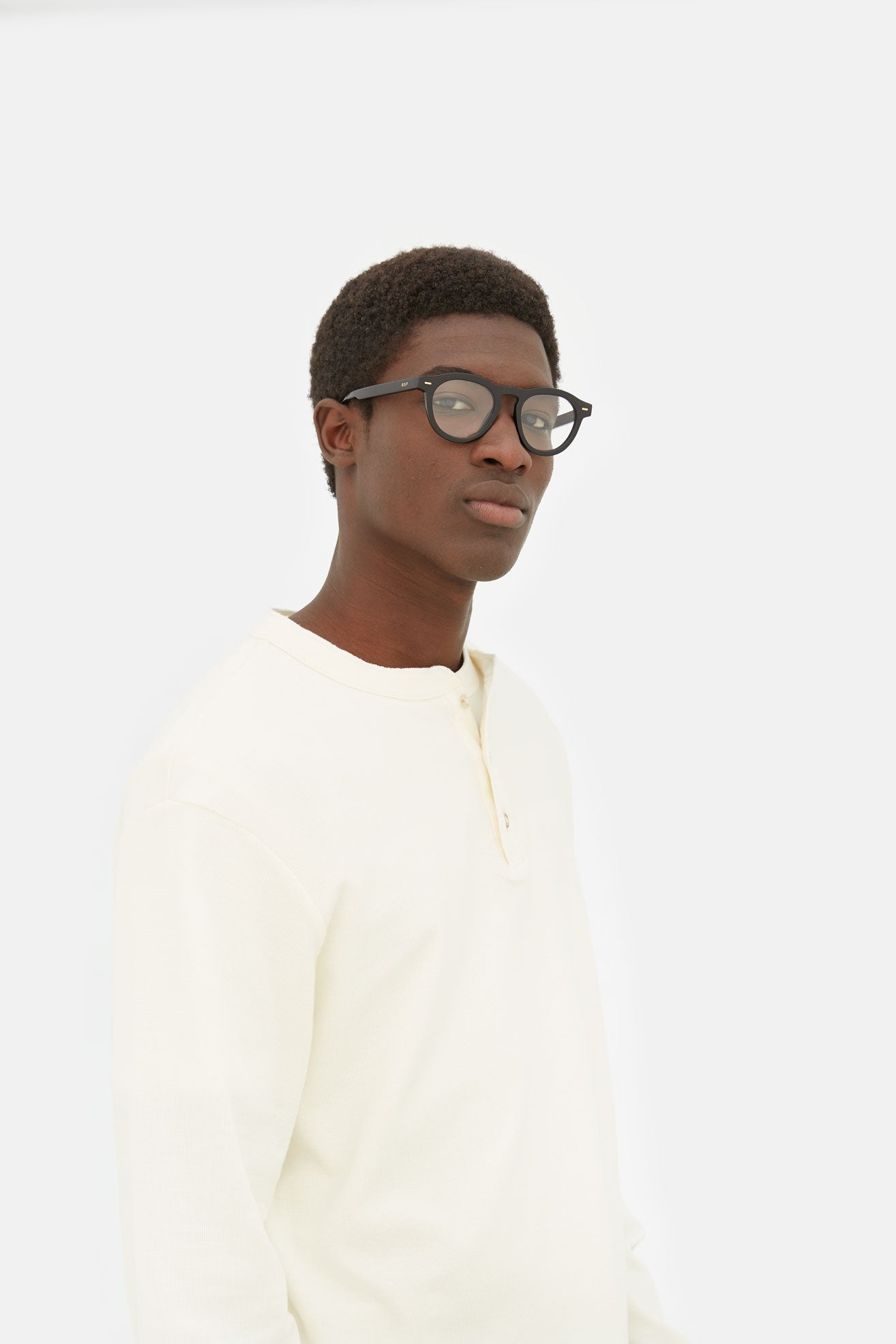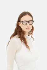 Numero 102 is a playful and casual rounded silhouette designed to be worn all-day, everyday. Characterized by its higher, extra comfy nose bridge design and RSF signature sturdy acetate rims. This shape is a slightly larger version of familiar rounded models: a reinterpretation of classic more fitted frames. To boost its character, Numero 102 was equipped with sophisticated geometric metal studs and linear temples. This version comes in black acetate.