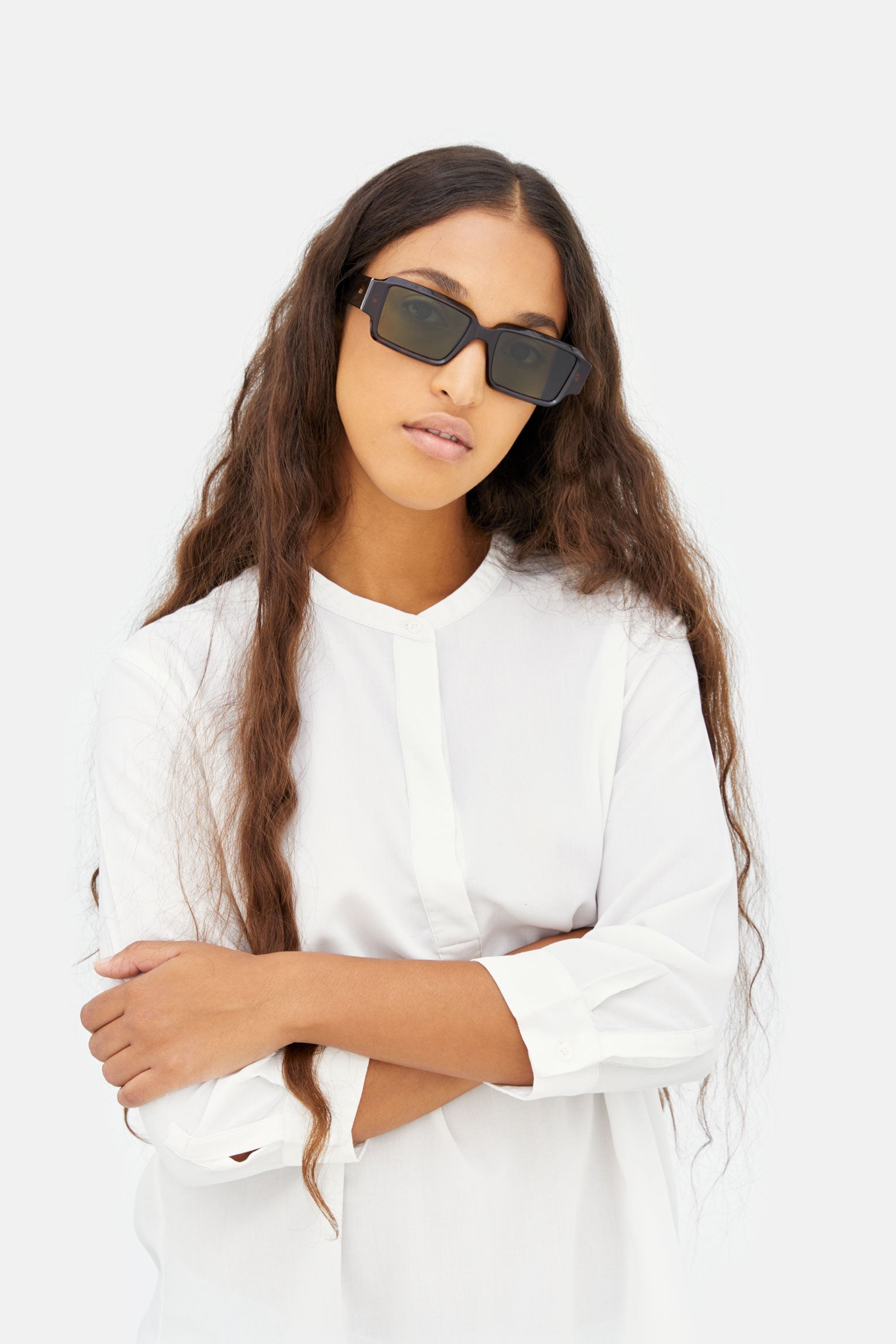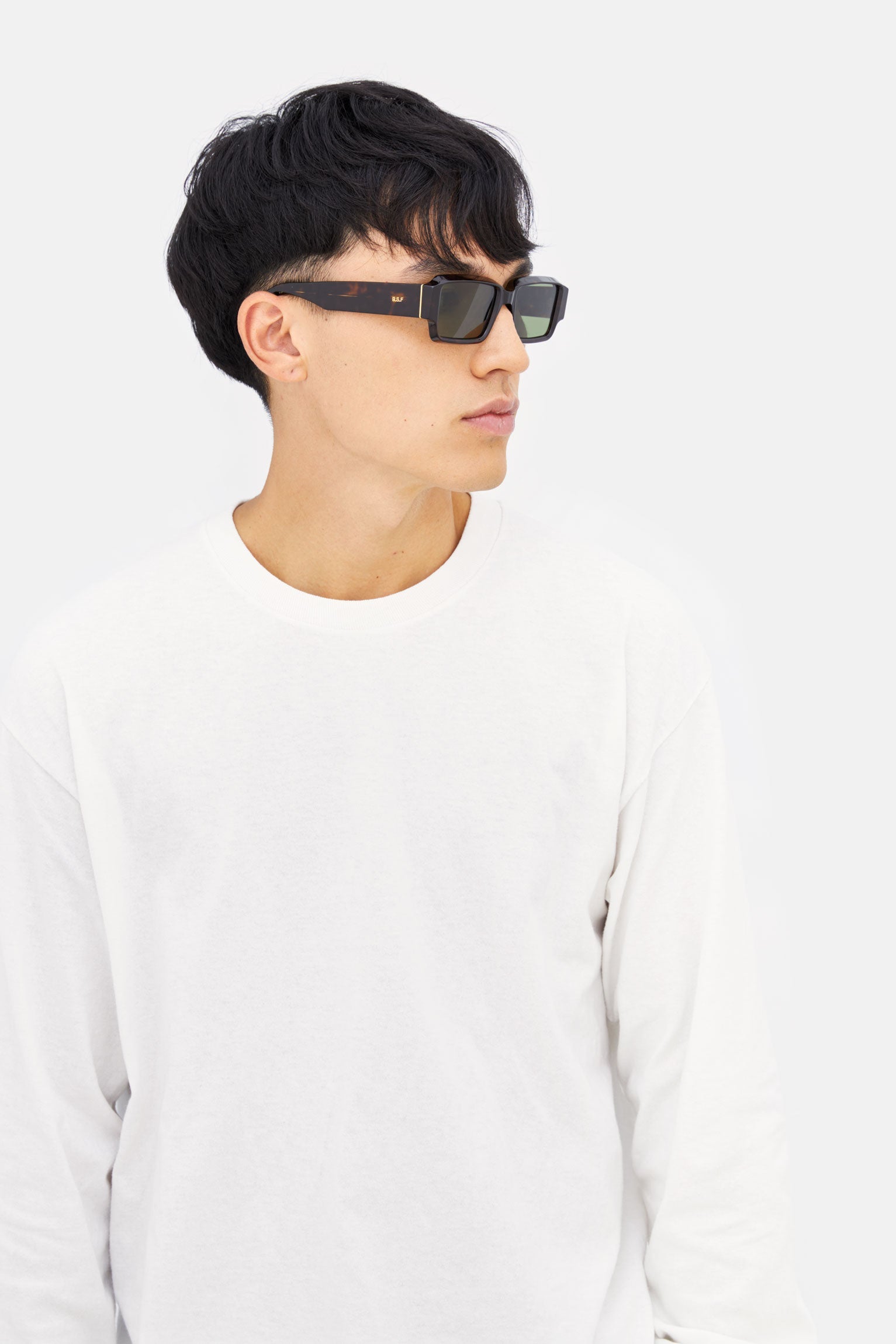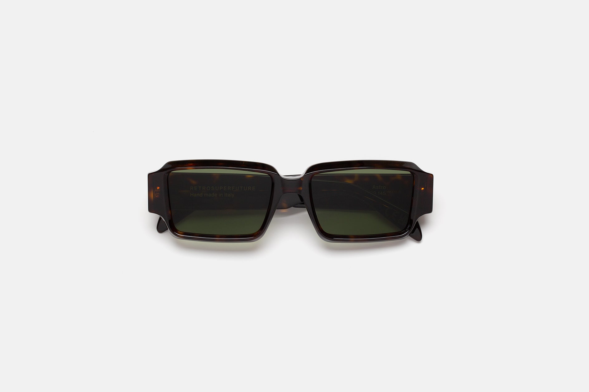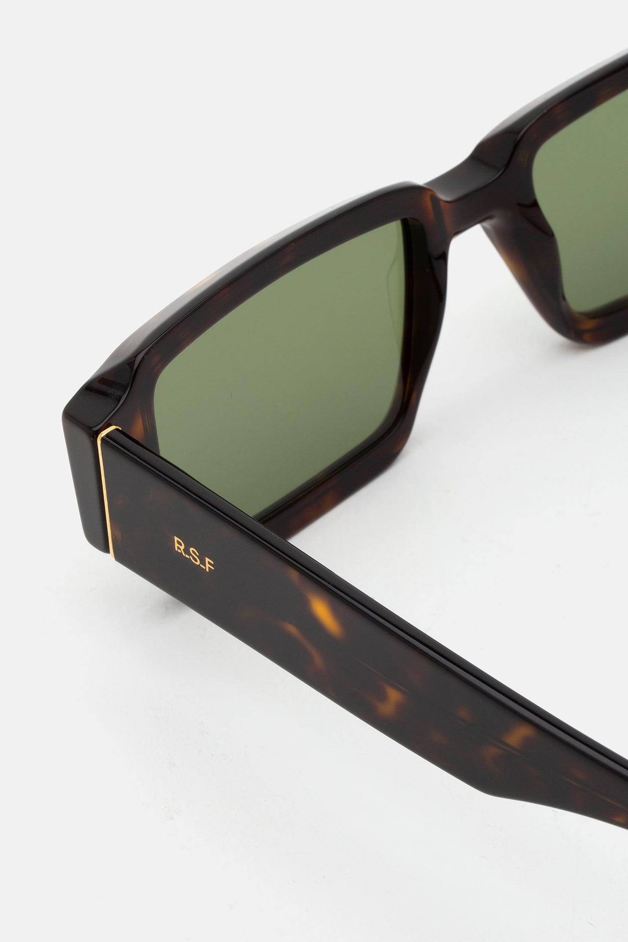 Iconic pieces of eyewear, reimagined for contemporary urban lifestyle: a 1970s silhouette has been redesigned to create Astro, a bold and playful shape. Astro is a squared frame with thick temples and a low nose-bridge, characterised by sculpted rims to form a distinctive slanted, architectural profile. Exceptional Italian acetate in a spotted 3627 Havana and bottle green lenses make this an exquisite high-end design.