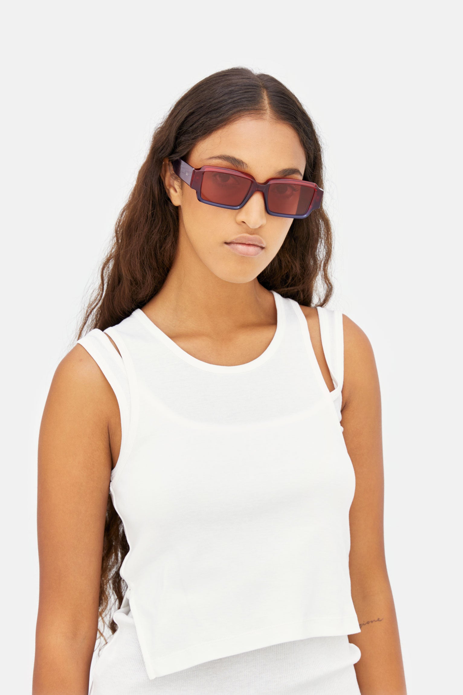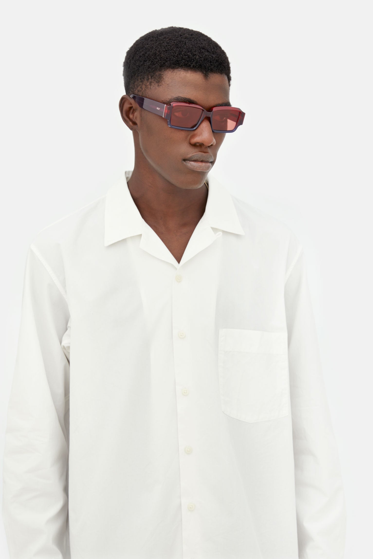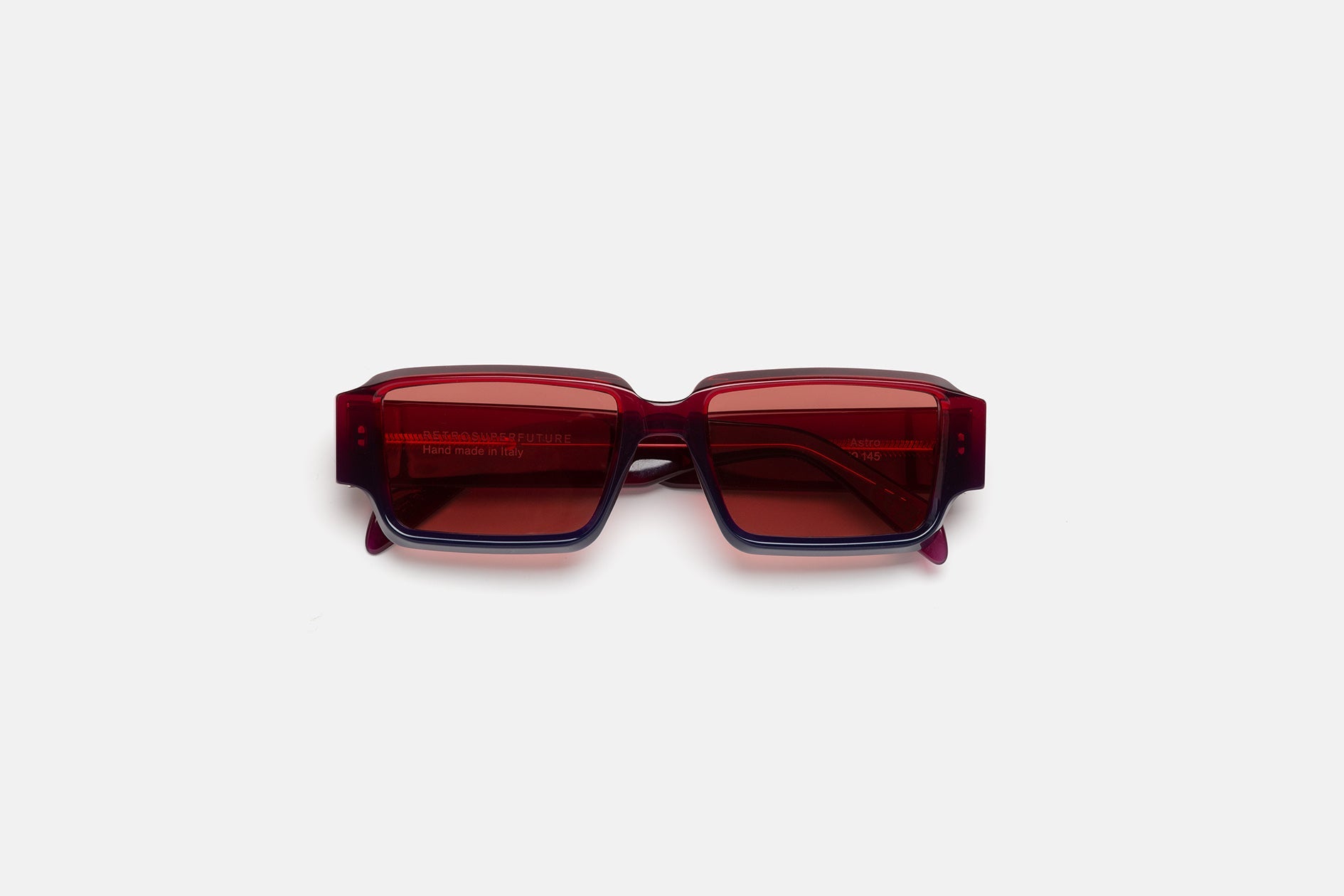 Iconic pieces of eyewear, reimagined for contemporary urban lifestyle: a 1970s silhouette has been redesigned to create Astro, a bold and playful shape. Astro is a squared frame with thick temples and a low nose-bridge, characterised by sculpted rims to form a distinctive slanted, architectural profile. Exceptional Italian acetate in a colorful fading acetate and matching burgundy lenses make this an exquisite high-end design.