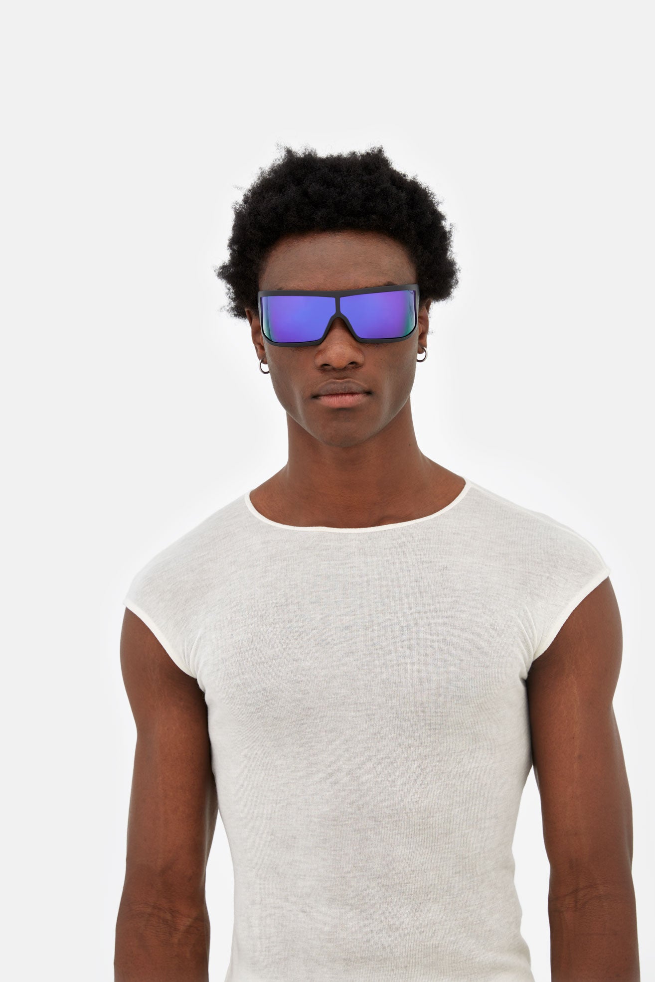Bones is a unique hybrid between an oversized embracing sports shield, a unique high fashion frame and a raver’s dream. Bones’ thick yet functionally lightweight structure is composed of TR90 material. This thermoplastic material is commonly used in technical performance eyewear due to its ultra-resistant and ultra-lightweight properties. Bones is an eyewear piece of many strong characteristics, from the TR90 as a choice of material, the oversized wrap around design with its fresh curvy details to the selection of the lens. The lens is always s key player in RSF’s game, balancing aesthetic with function. Bones mounts an extra special, extra large Carl Zeiss wrap around ‘toric’ shield in a selection of astounding colored mirror finishes. Available in black matte TR90 with faded multicoloured mirrored lenses and silver details.