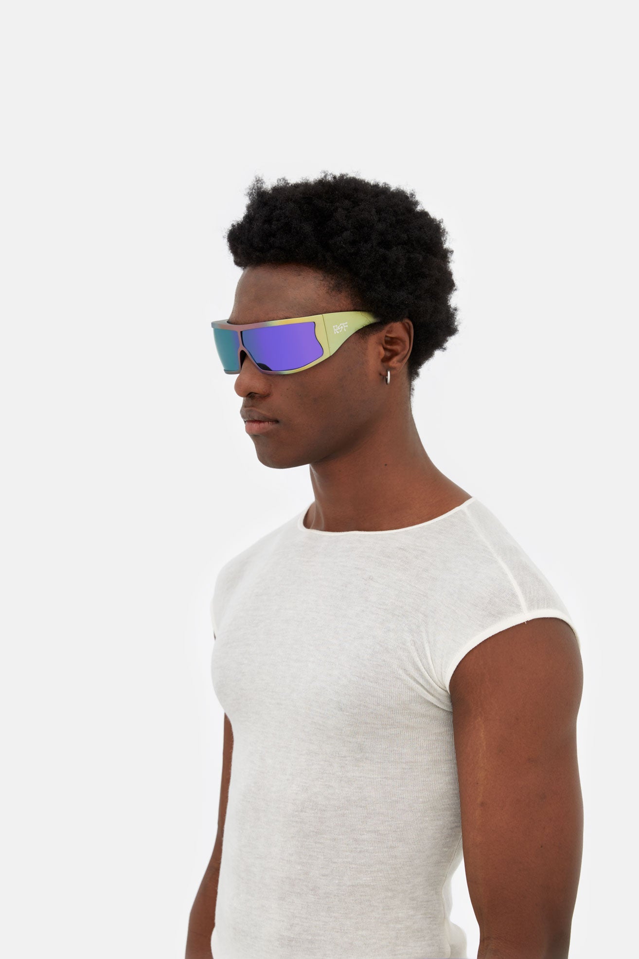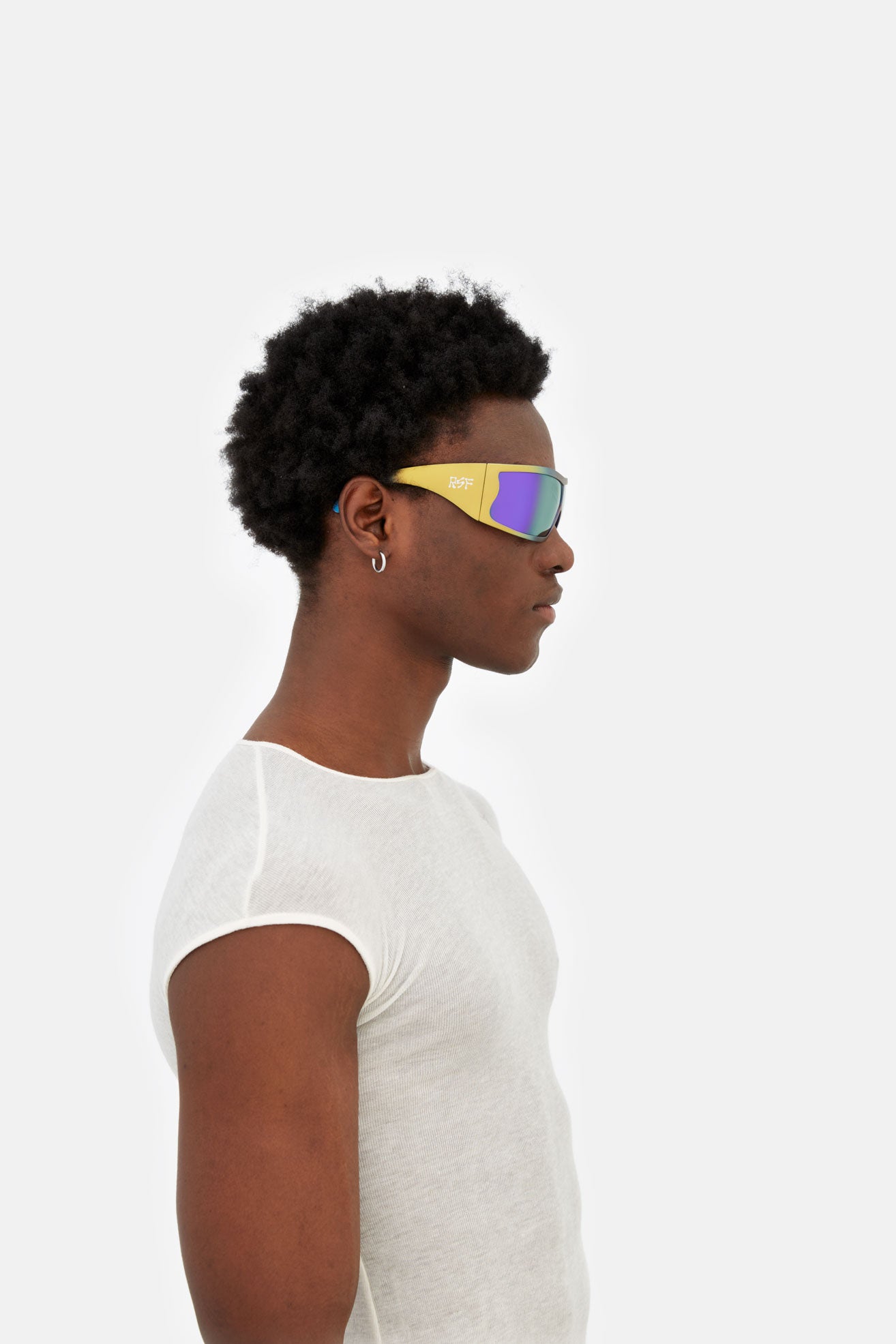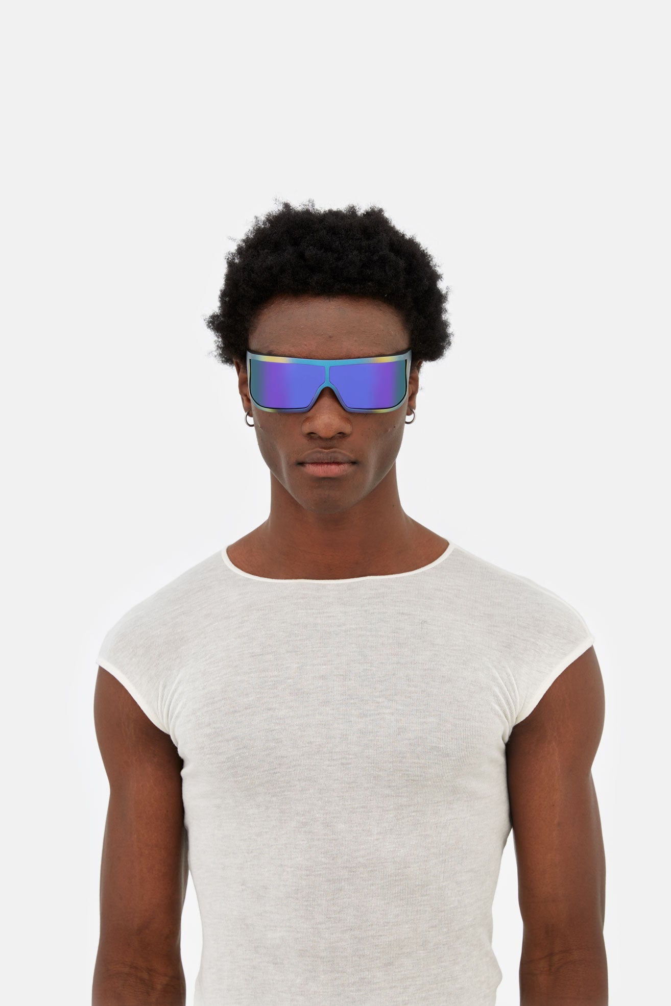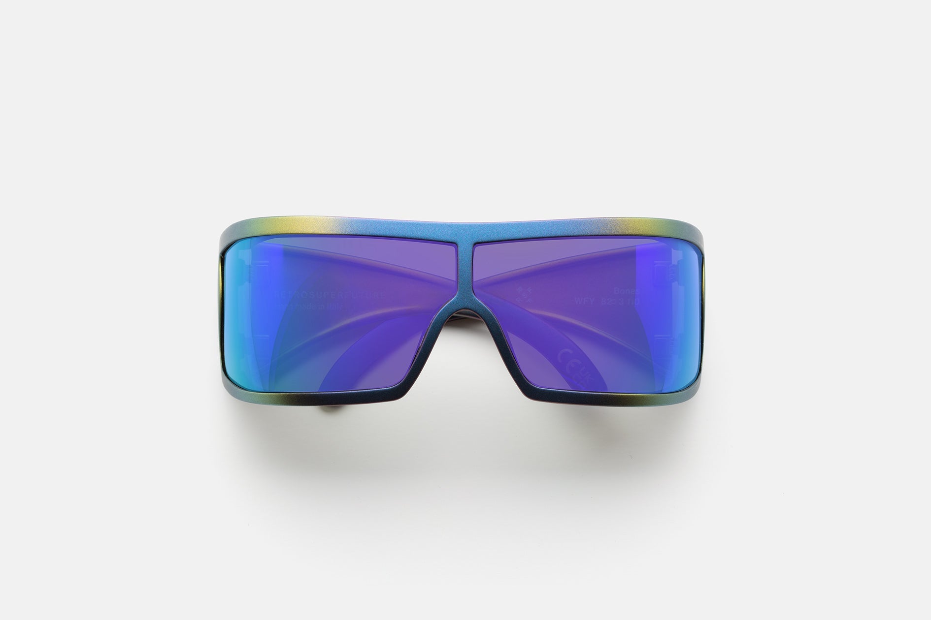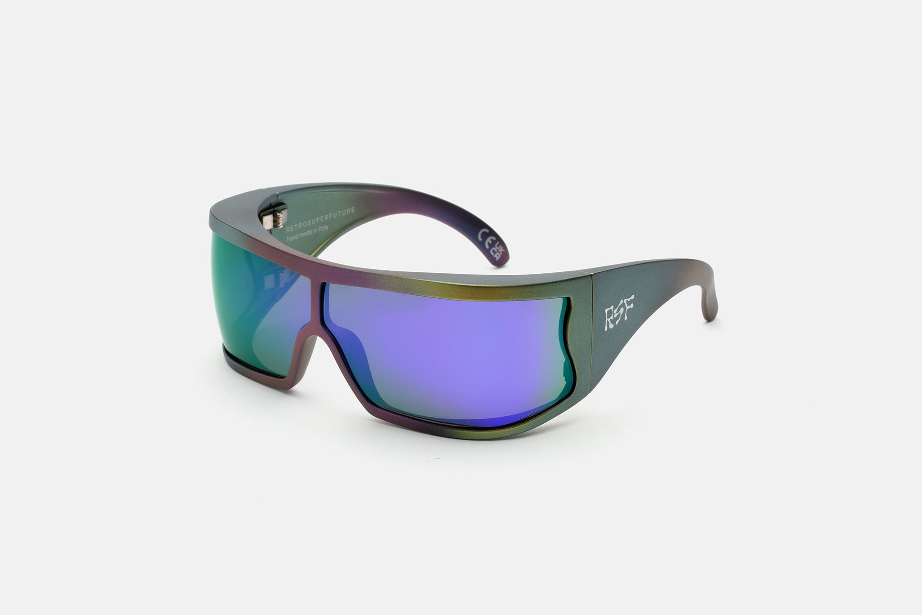 Bones is a unique hybrid between an oversized embracing sports shield, a unique high fashion frame and a raver’s dream. Bones’ thick yet functionally lightweight structure is composed of TR90 material. This thermoplastic material is commonly used in technical performance eyewear due to its ultra-resistant and ultra-lightweight properties. Bones is an eyewear piece of many strong characteristics, from the TR90 as a choice of material, the oversized wrap around design with its fresh curvy details to the selection of the lens. The lens is always s key player in RSF’s game, balancing aesthetic with function. Bones mounts an extra special, extra large Carl Zeiss wrap around ‘toric’ shield in a selection of astounding colored mirror finishes. Available in a unique matte iridescent faded powder coated TR90 with matching faded multicoloured mirrored lenses and silver details.