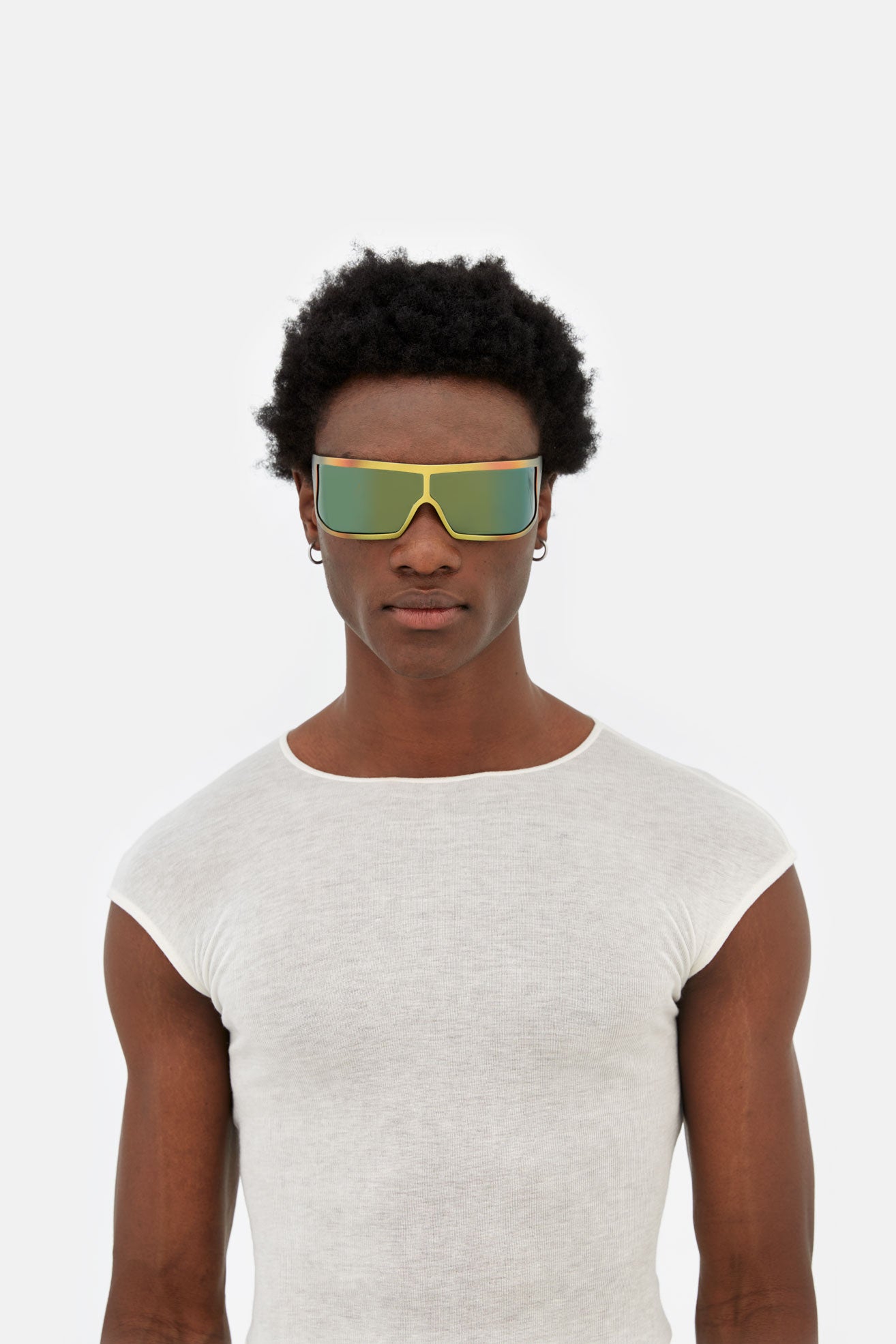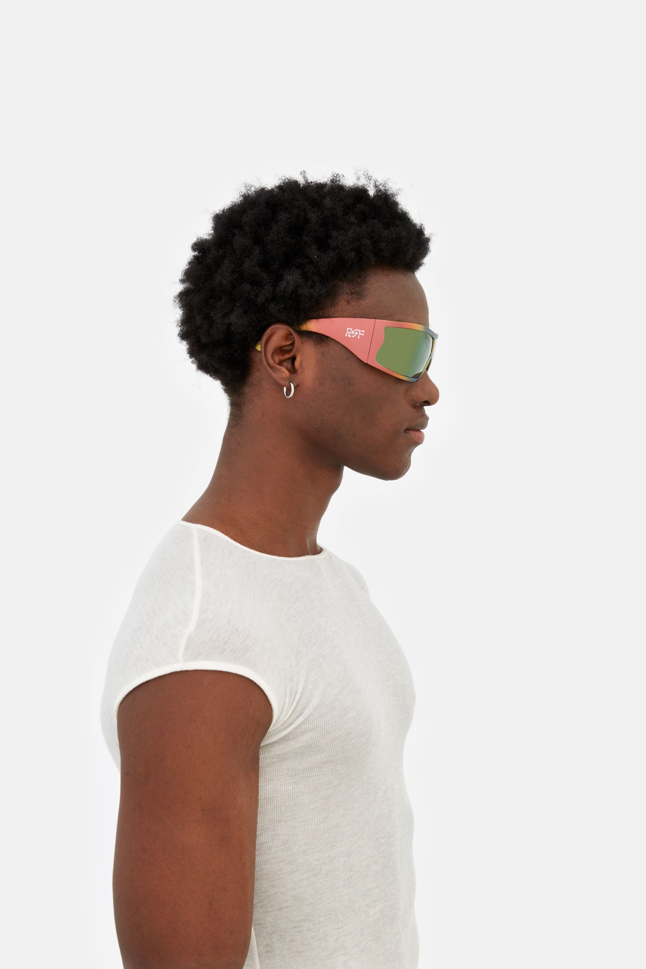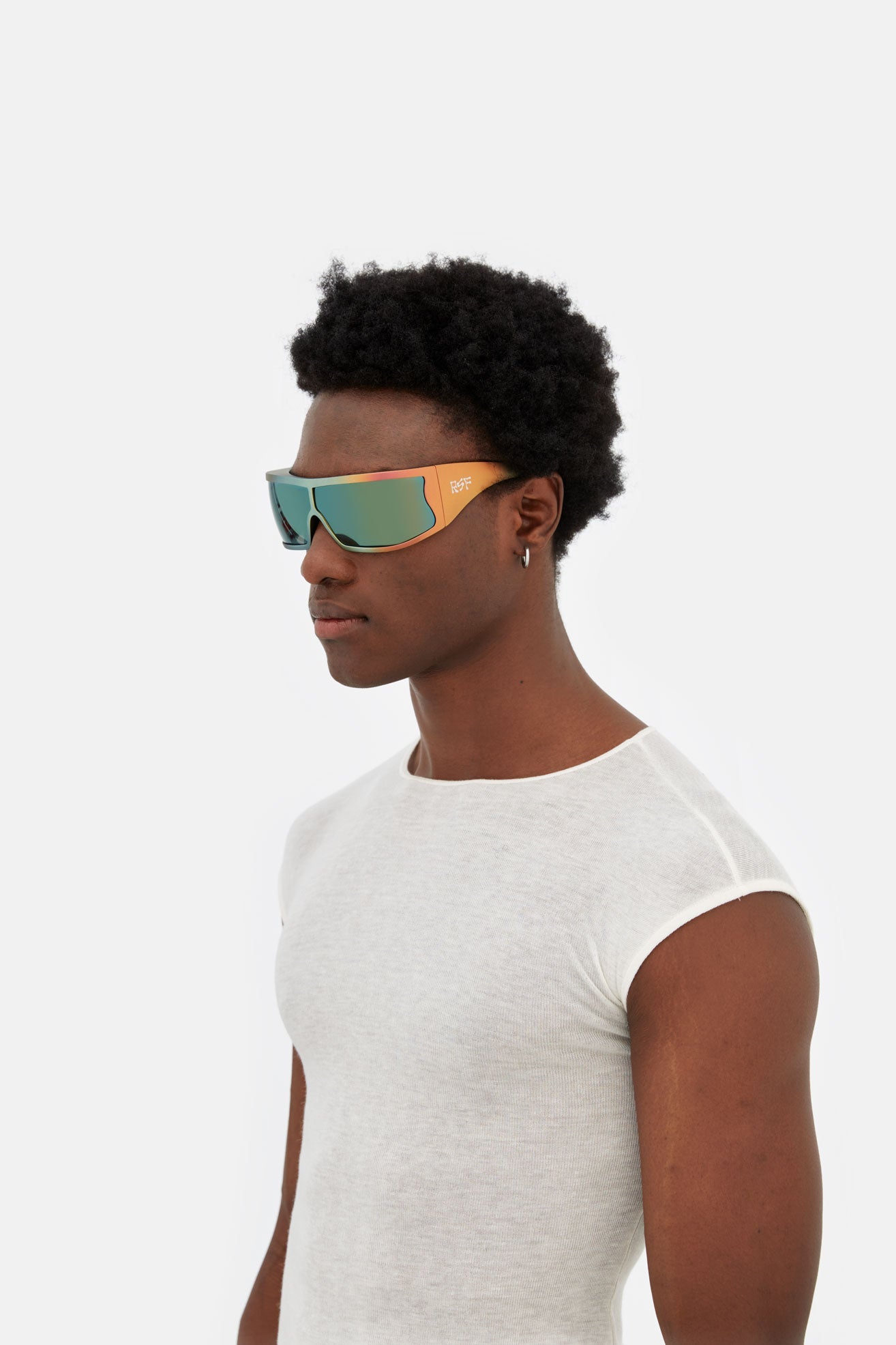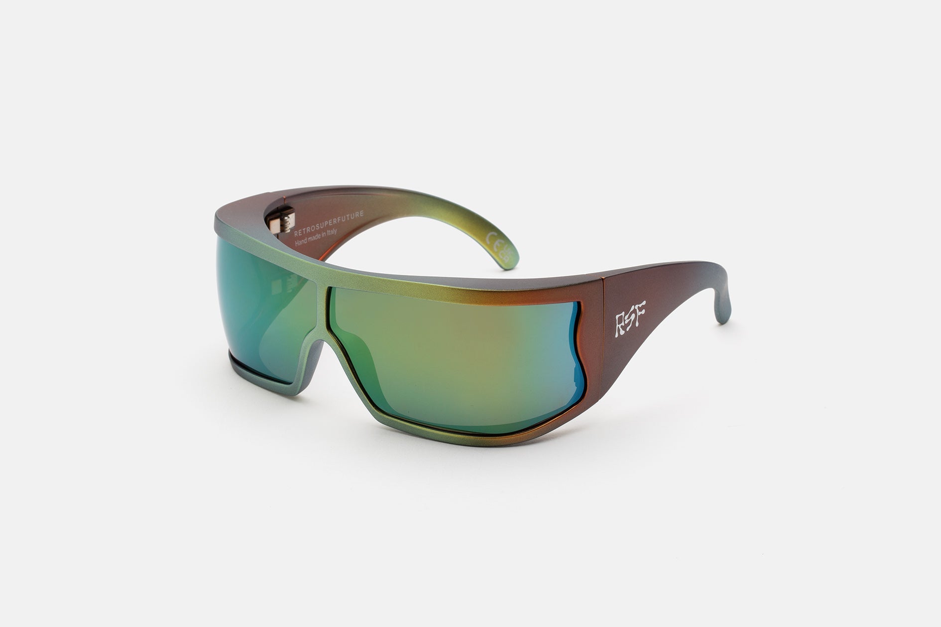 Bones is a unique hybrid between an oversized embracing sports shield, a unique high fashion frame and a raver’s dream. Bones’ thick yet functionally lightweight structure is composed of TR90 material. This thermoplastic material is commonly used in technical performance eyewear due to its ultra-resistant and ultra-lightweight properties. Bones is an eyewear piece of many strong characteristics, from the TR90 as a choice of material, the oversized wrap around design with its fresh curvy details to the selection of the lens. The lens is always s key player in RSF’s game, balancing aesthetic with function. Bones mounts an extra special, extra large Carl Zeiss wrap around ‘toric’ shield in a selection of astounding colored mirror finishes. Available in a unique matte iridescent faded powder coated TR90 with matching faded multicoloured mirrored lenses and silver details.
