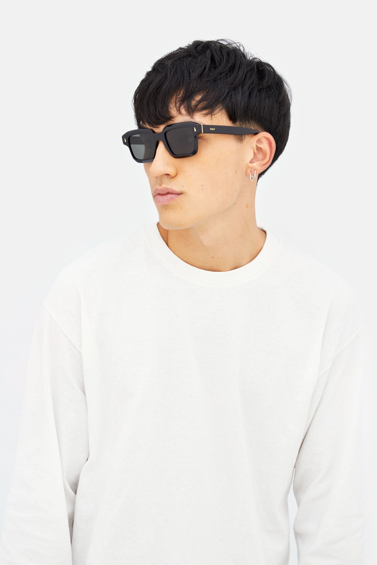 Angular, chunky and bold, Giardino is a unique frame with a determined, precise shape. Characterised by wide rectangular lenses, the model is a reinterpretation of 1950s silhouettes, updated with an emphasis on sculpted acetate rims and essential geometries. Crafted from shiny black acetate, this is an elevated piece of eyewear to be worn day after day. This model comes with black lenses and gold decors.