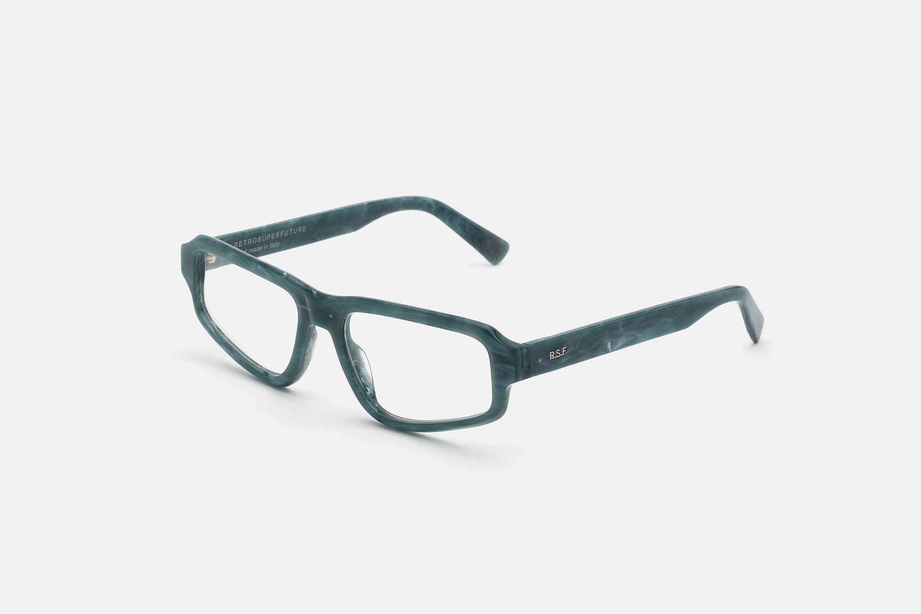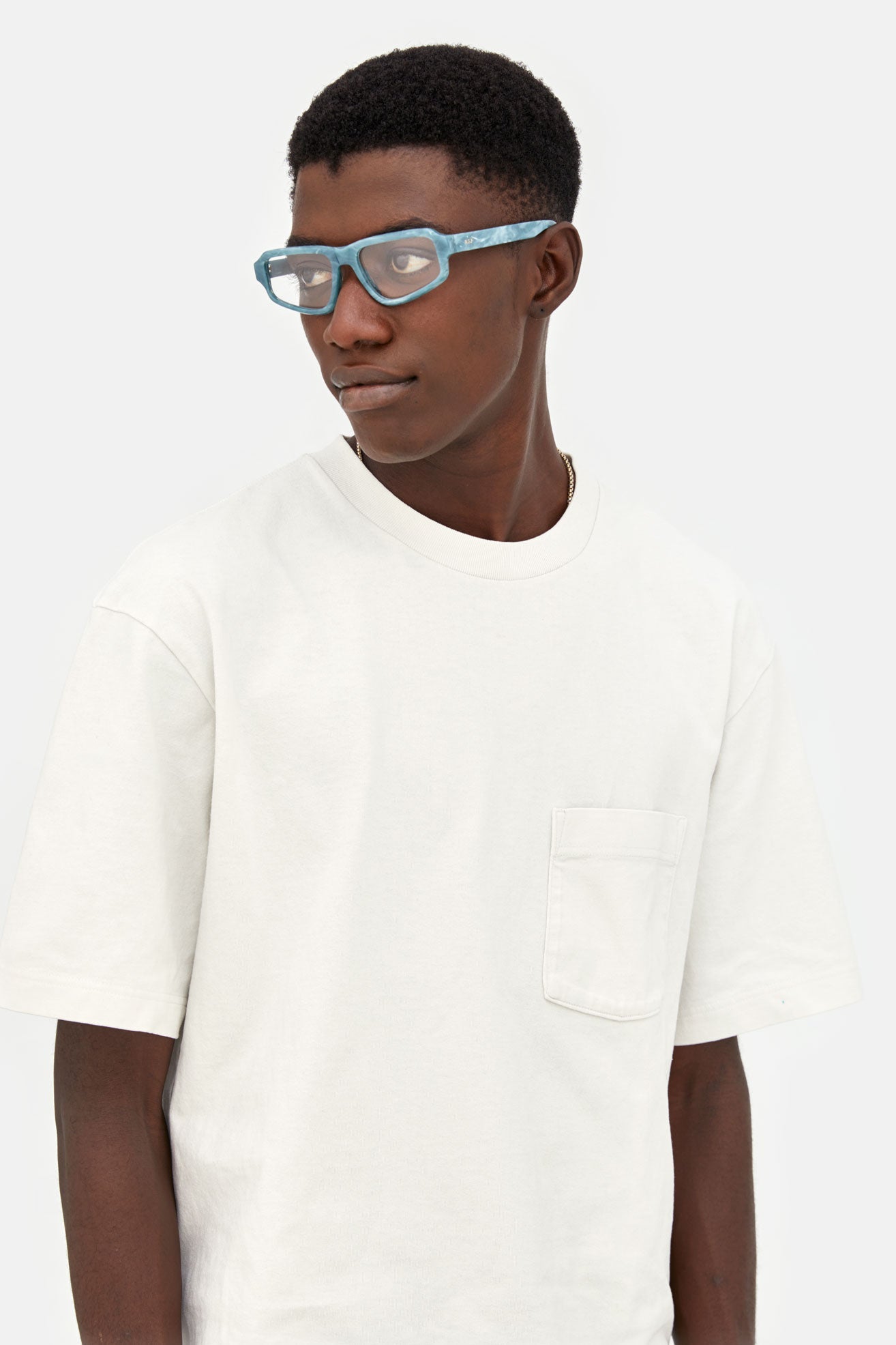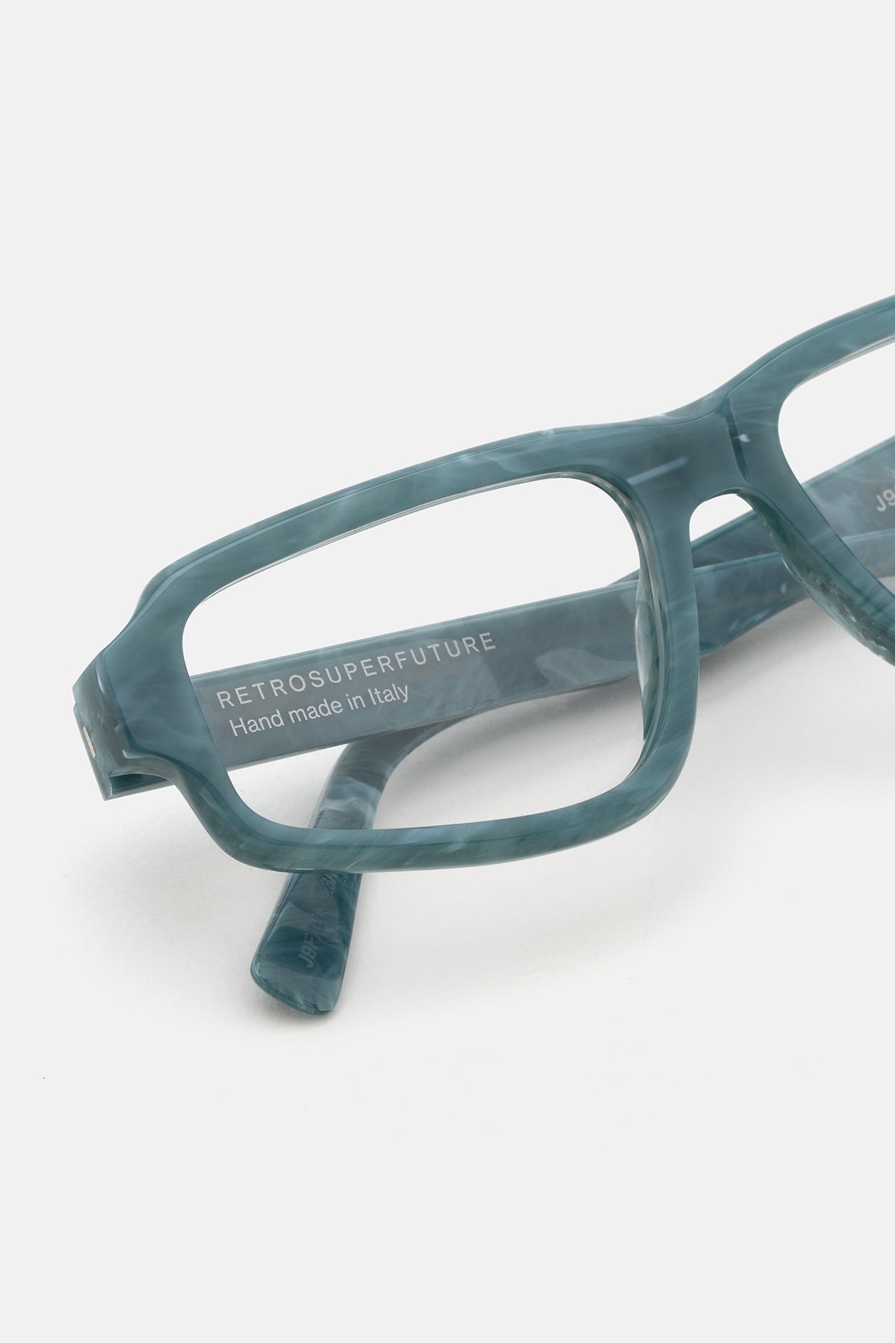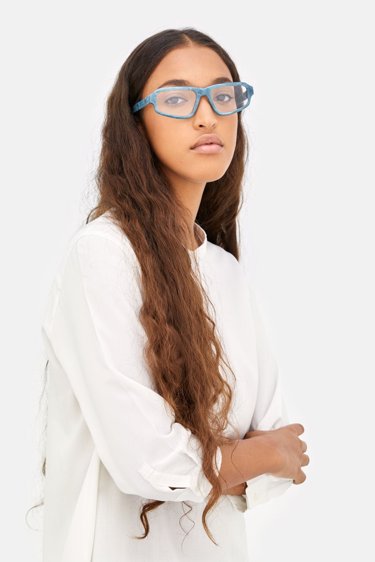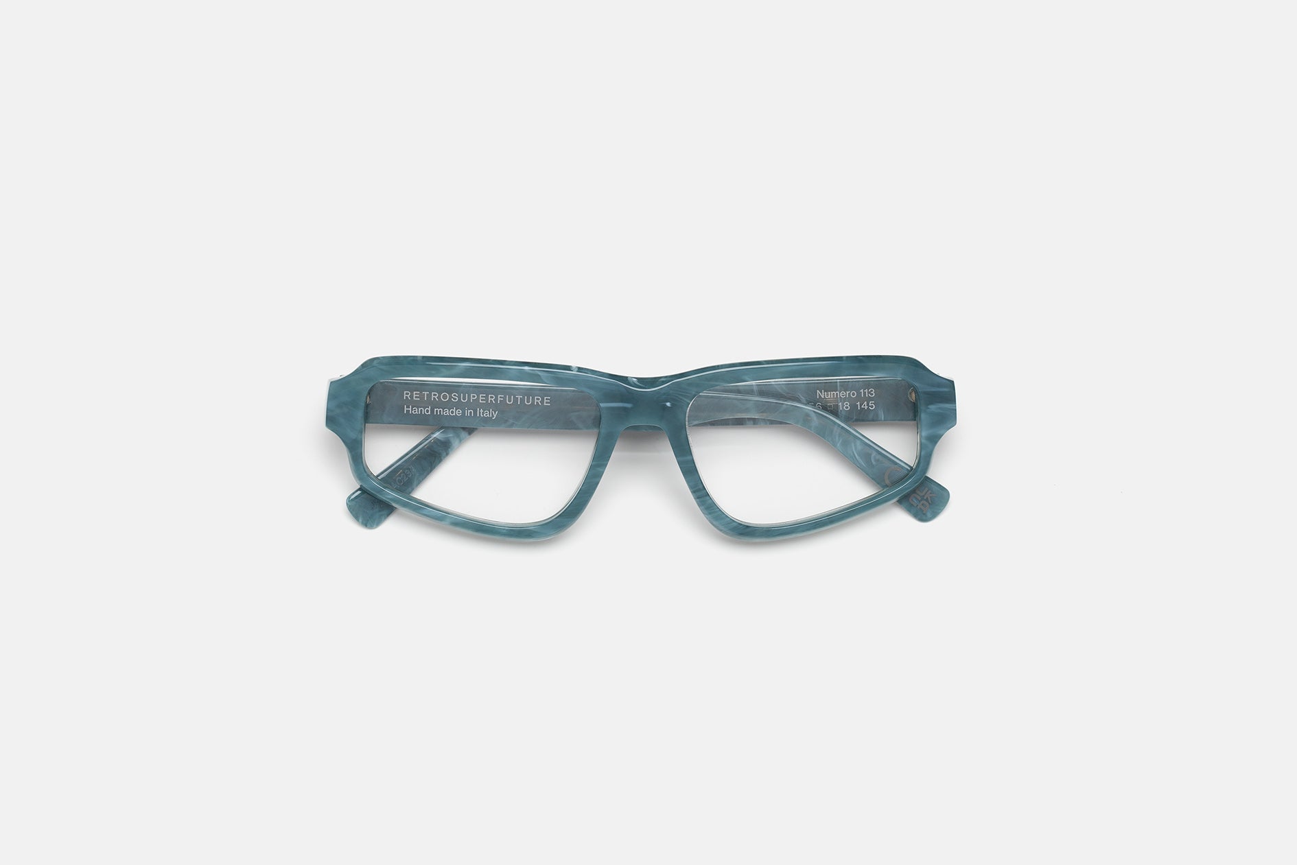 Numero 113 is a bold Optical frame that oozes with character. Inspired by streamlined, sportswear-style pieces, Numero 113 is designed as a compact mask, with a thick brow-line and slanted lenses. Chiselled acetate rims are shaped for lightness in everyday use, while adding an architectural quality to the frame. This version comes in a unique blue marbled acetate.