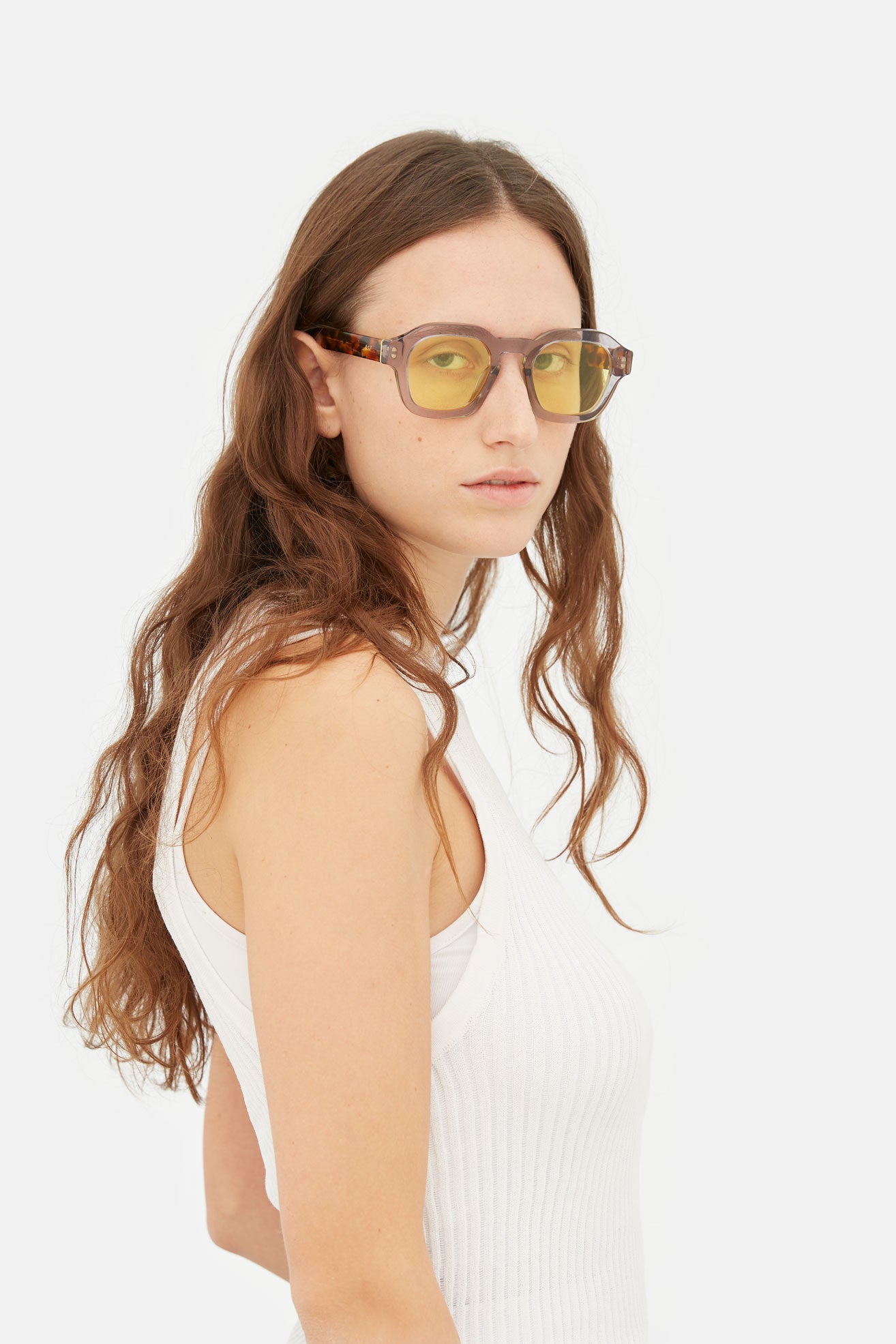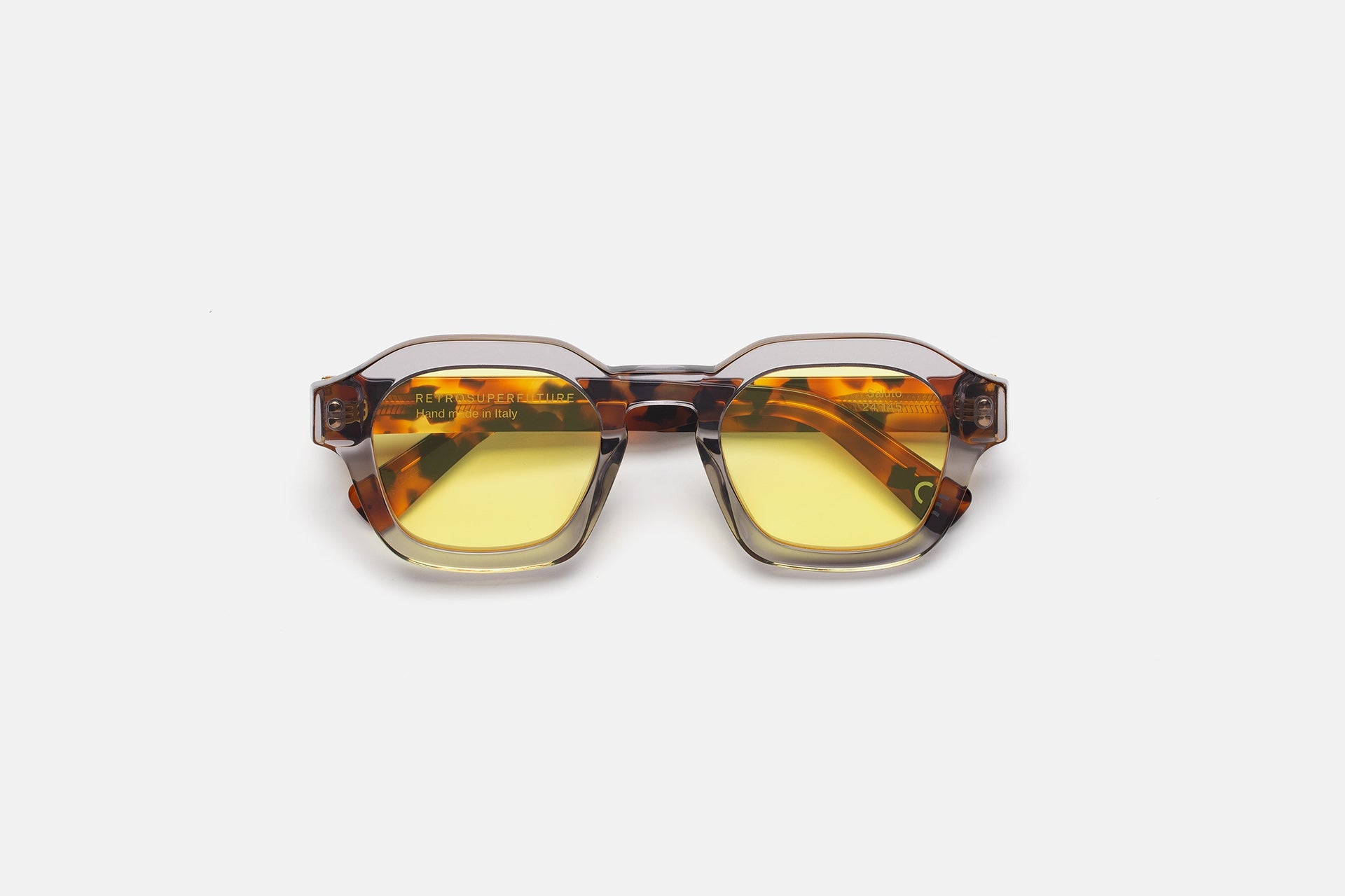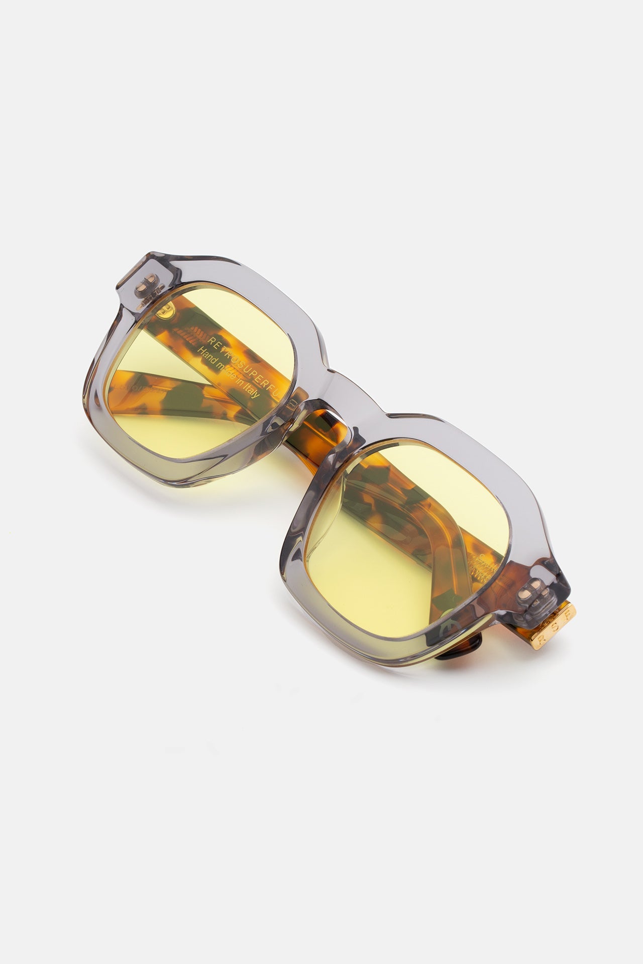 Saluto is a sleek silhouette that underlines the understanding of timeless style: both familiar and essential, yet keeping it fresh and contemporary, this model is conceived as a true instant classic. A more sophisticated version of well-known rounded, fitted shapes, Saluto features a hexagonal design with a raised brow-line for a slightly oversized fit. A bold yet unobtrusive icon for the 21st century, Saluto comes in a crystal grey frame, Havana temples and yellow tinted lenses.