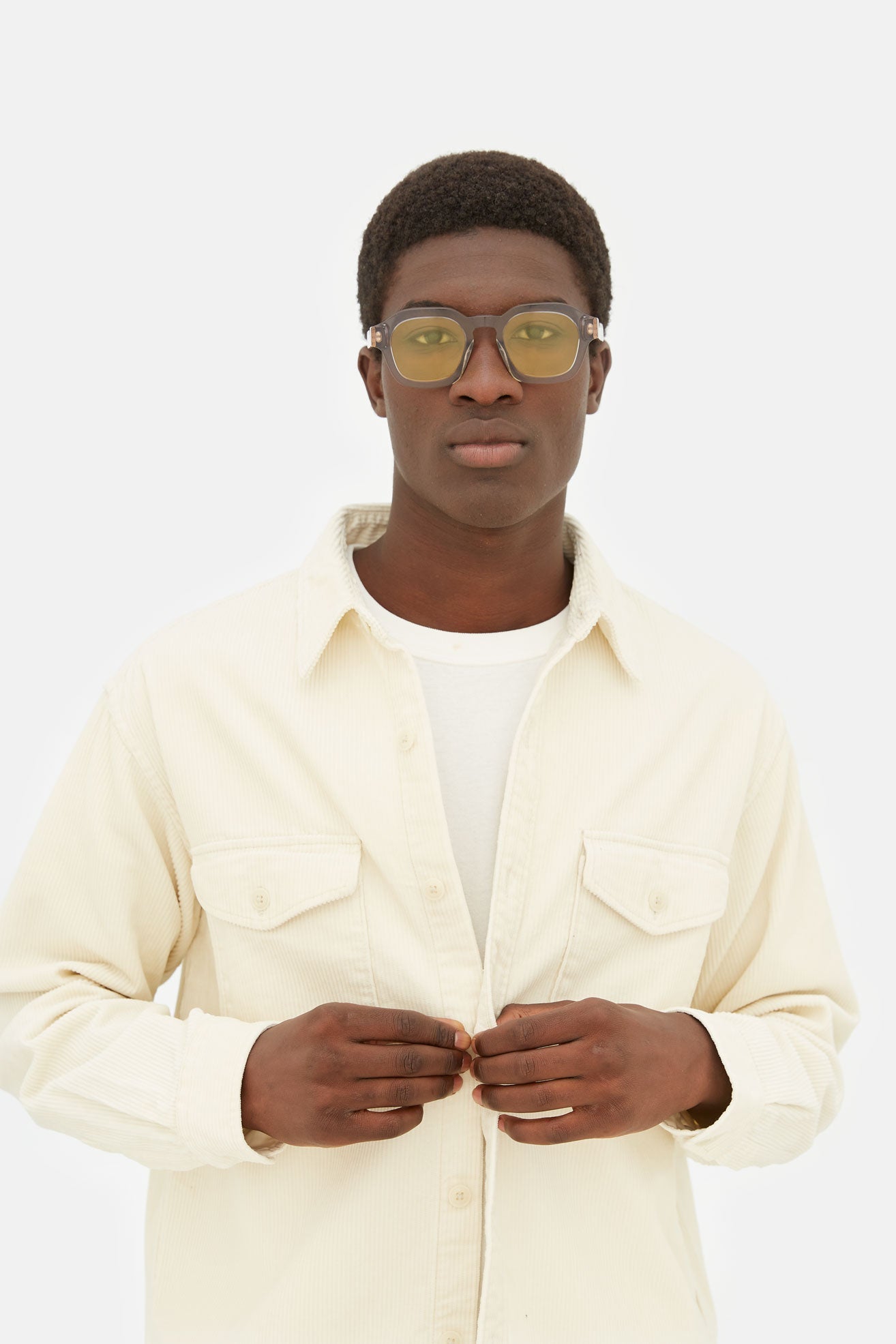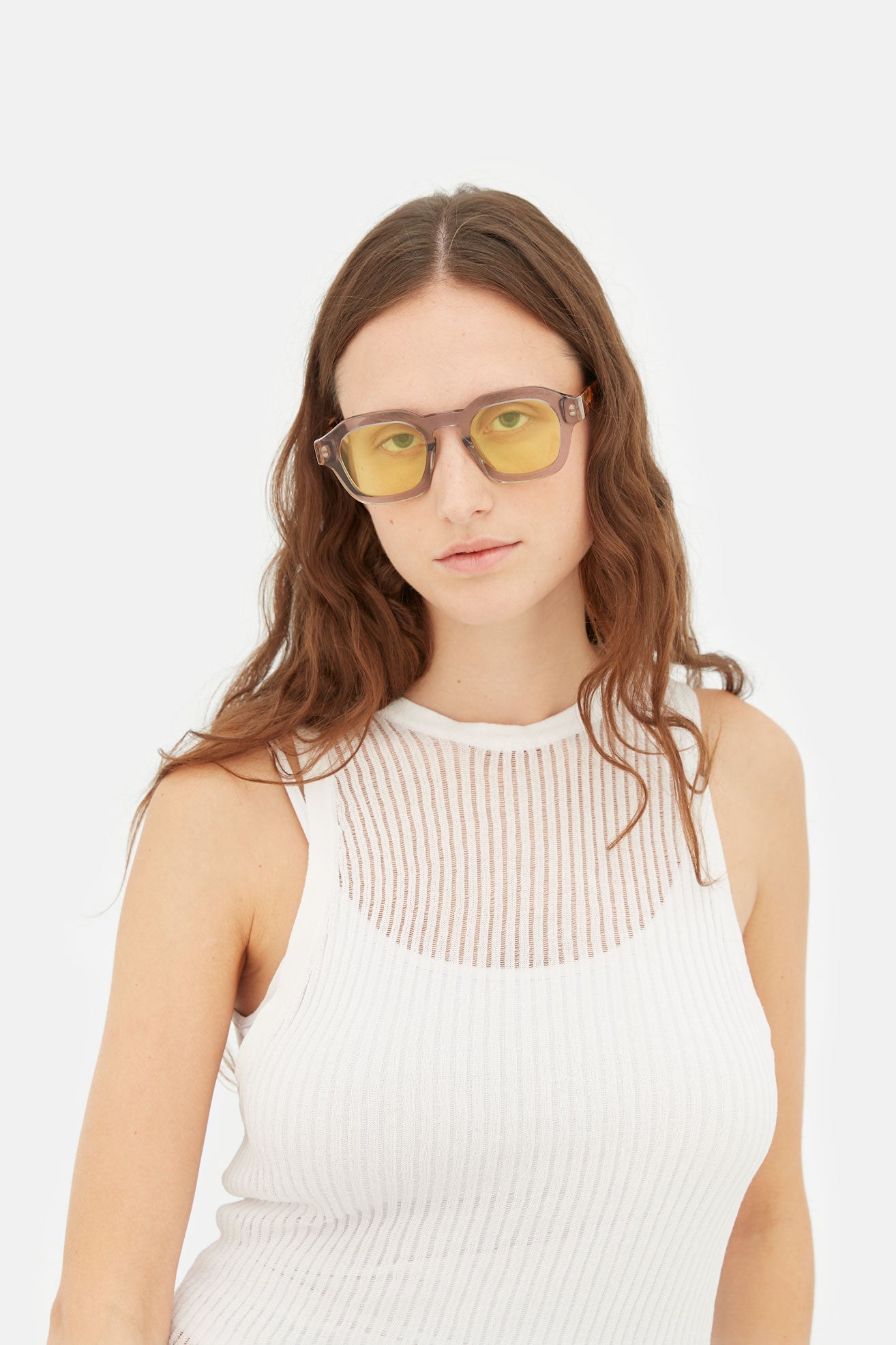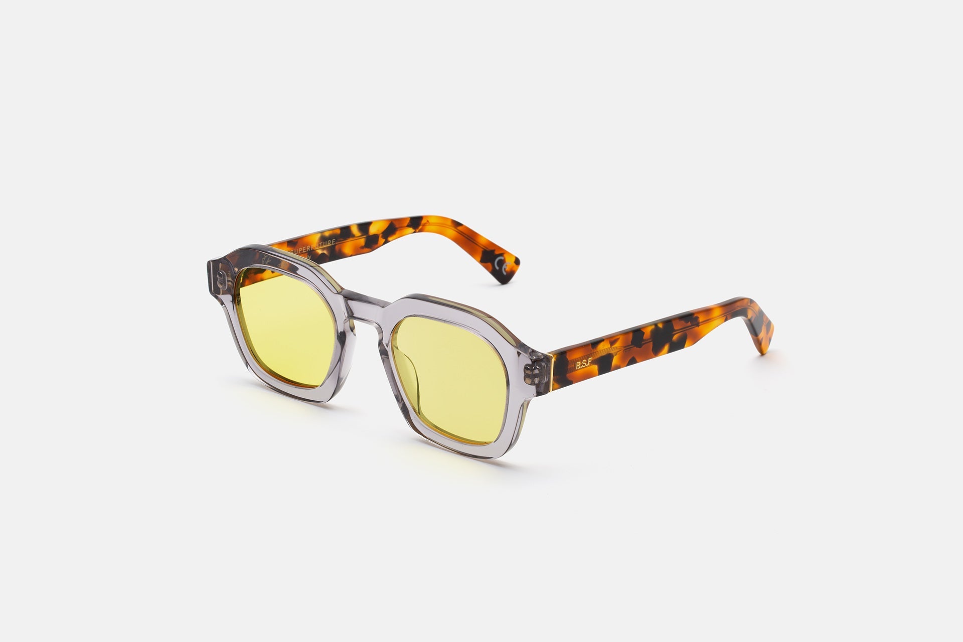 Saluto is a sleek silhouette that underlines the understanding of timeless style: both familiar and essential, yet keeping it fresh and contemporary, this model is conceived as a true instant classic. A more sophisticated version of well-known rounded, fitted shapes, Saluto features a hexagonal design with a raised brow-line for a slightly oversized fit. A bold yet unobtrusive icon for the 21st century, Saluto comes in a crystal grey frame, Havana temples and yellow tinted lenses.