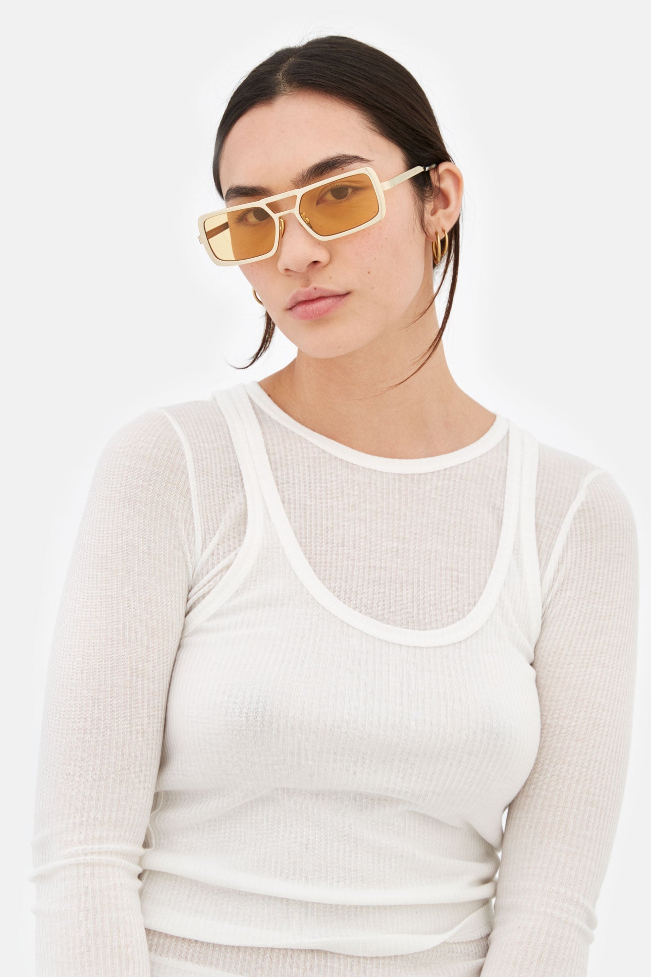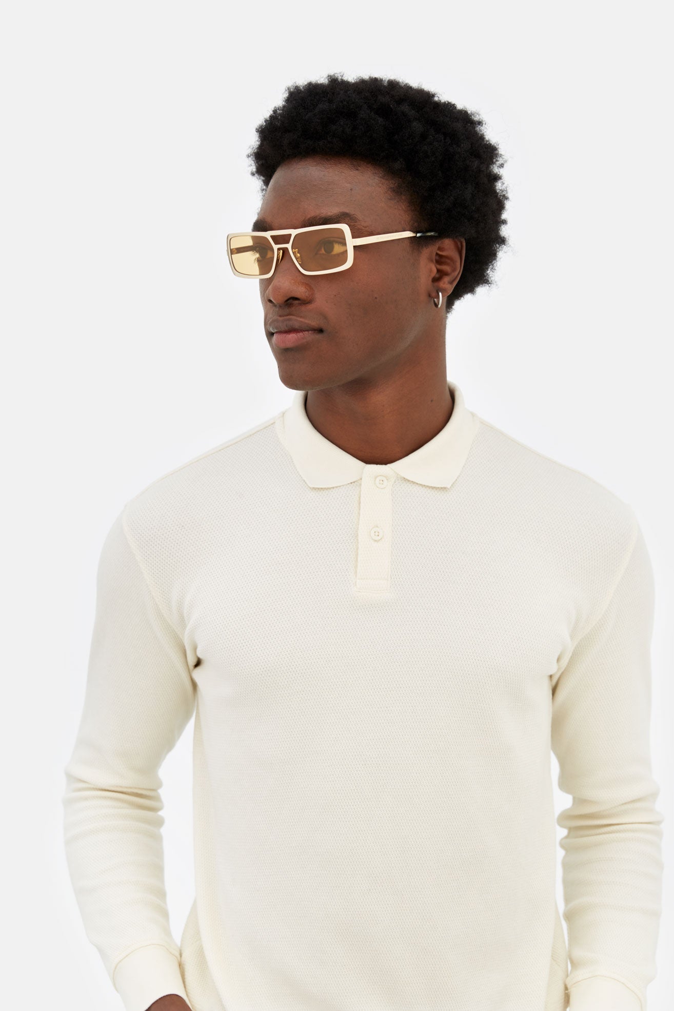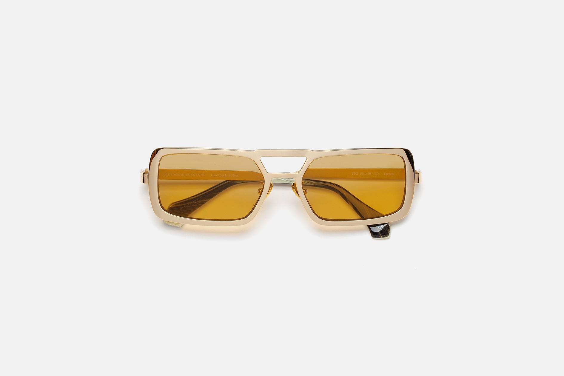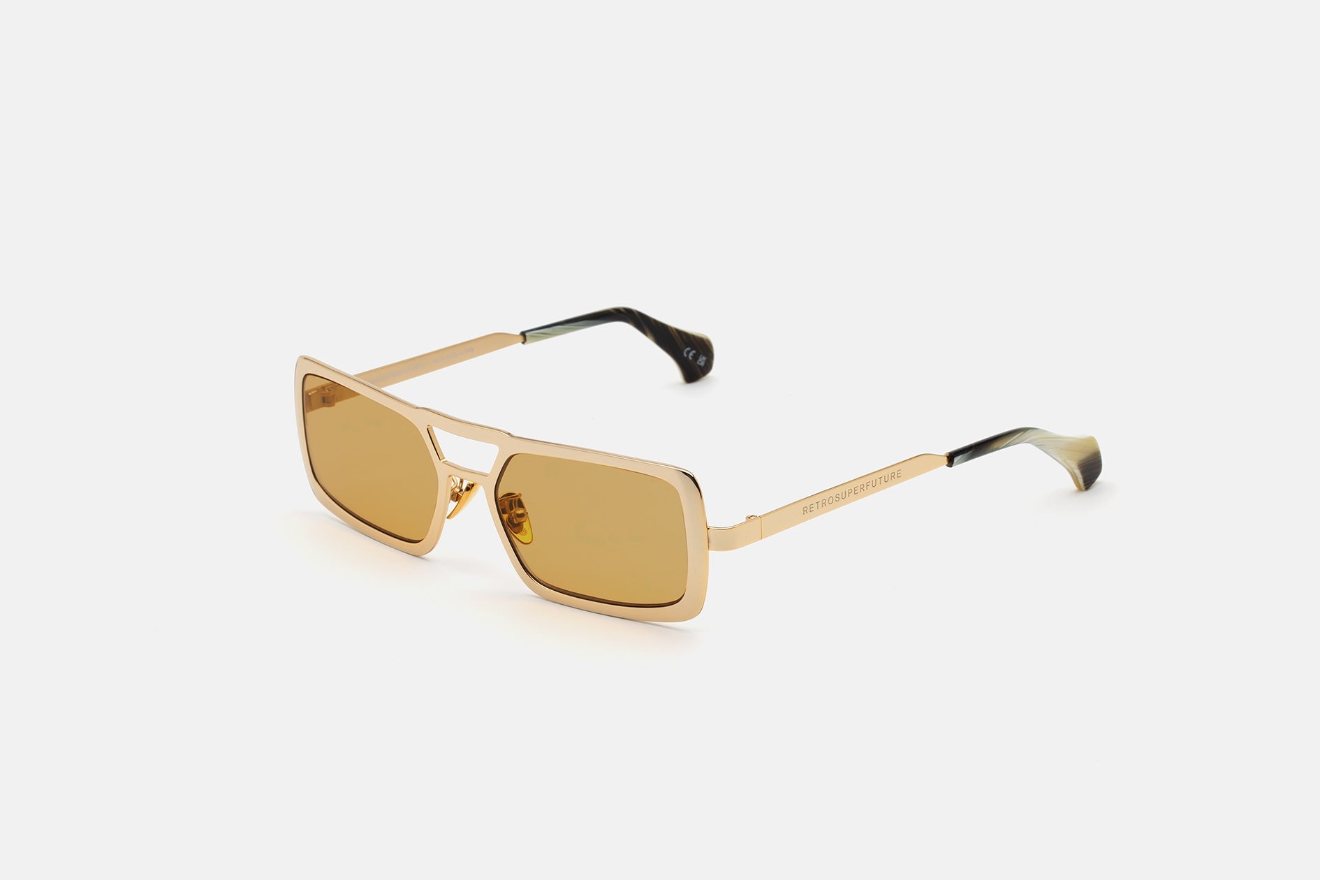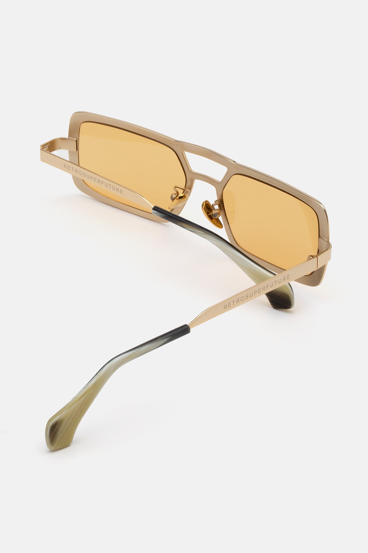 Stereo works on elevating the concept of metal designs with its unique design, structure and sophisticated finishes. The model is conceived as a retrosuperfuturistic interpretation of timeless metal sunglasses, with its prominent double nose-bridge and thick rims. Its wide, oversized geometries are highlighted by fresh and playful chromed finishes: a shiny gold polish paired with mustard yellow lenses for a tone-on-tone retro-haze statement.