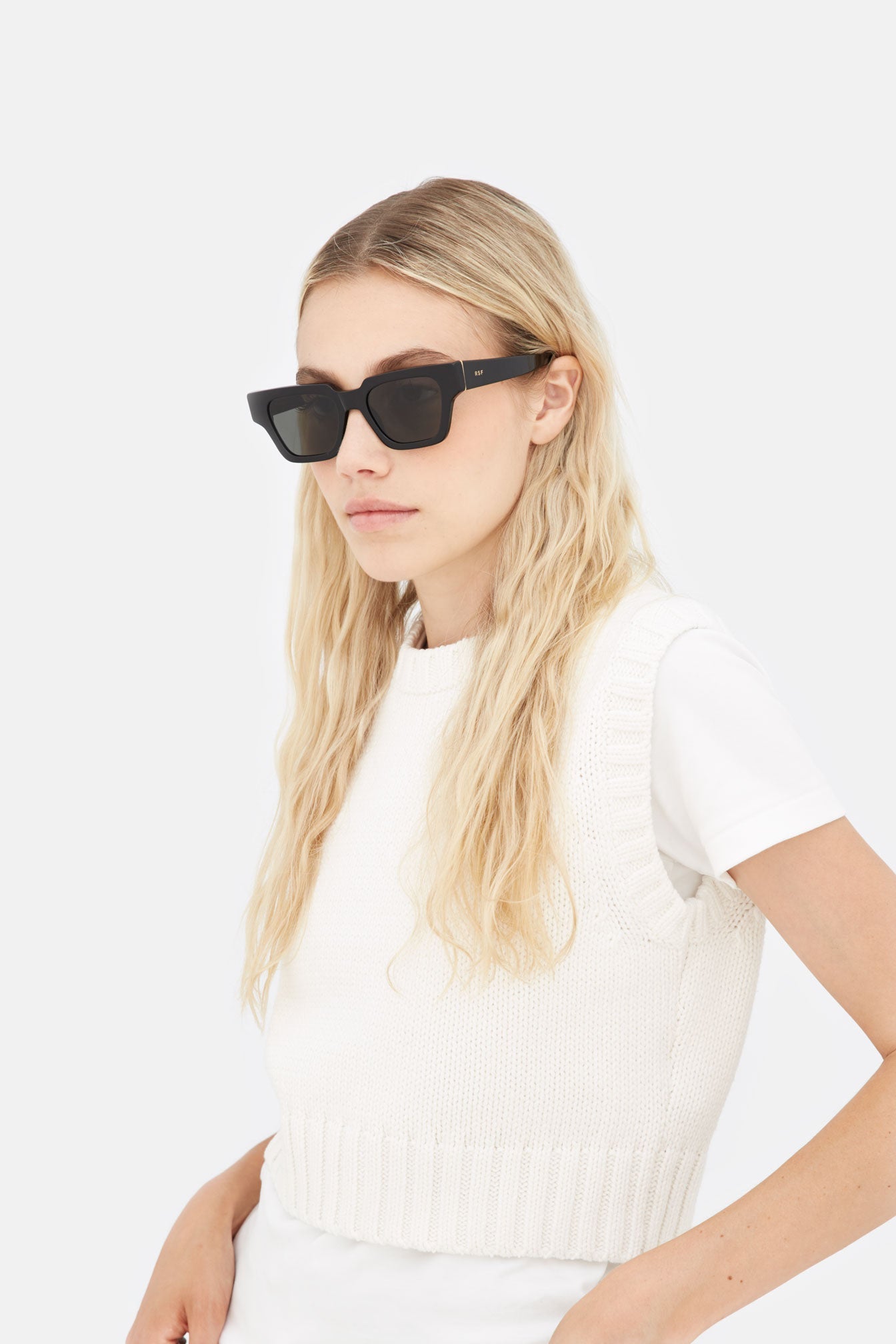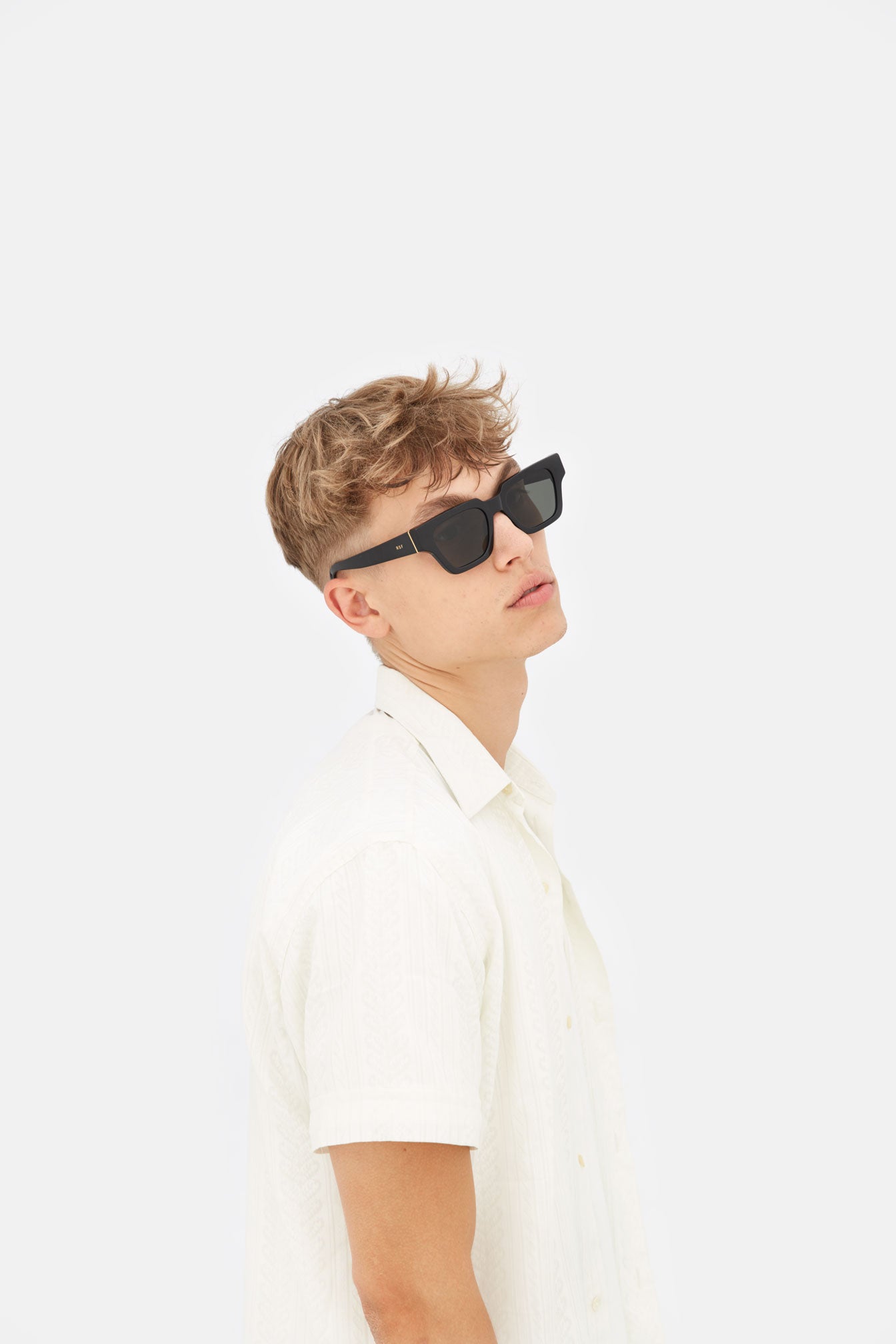 An iconic model designed to transcend seasonal trends, Storia matches the timeless elegance of casual style with a sharp street edge. Storia is a cool, sleek angular silhouette characterized by a geometric brow-line, with precise angles sculpted around its low nose-bridge and defined lines around its thick temple-tips. This is a quintessential unisex model that comes in black acetate with matching lenses.