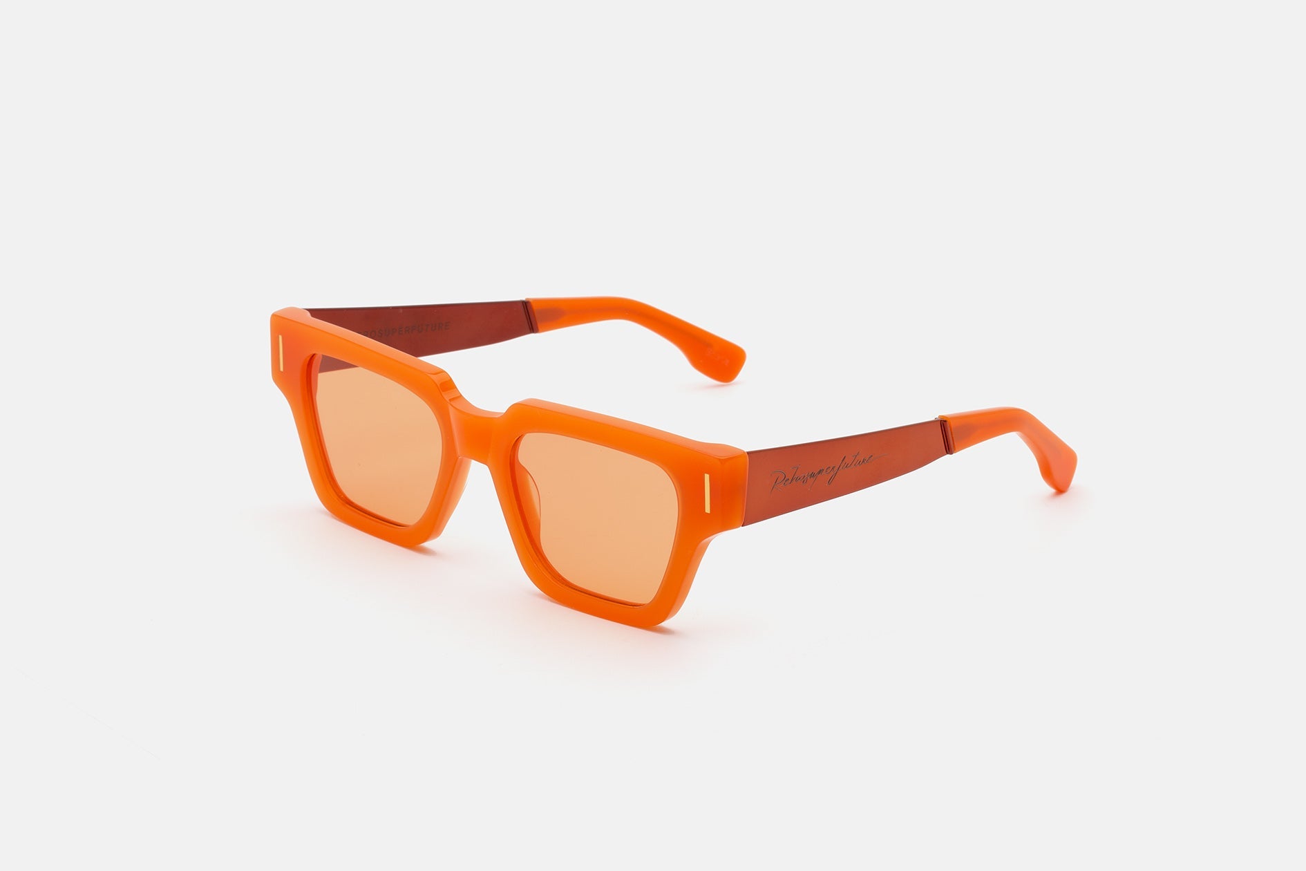 Storia is a cutting-edge yet classic contemporary silhouette that has been updated to celebrate RSF’s exclusive Francis series. This version of Storia was reinterpreted with the iconic Francis touch – the signature full-metal temples get a chromed color finish, elevating the model’s acetate construction. First released 10 years ago, the Francis series has been given a colourful twist for a fresh take on contemporary style with Storia’s unique profile and sharp geometries. This version features a fresh tone-on-tone orange acetate, chromed orange metal and matching lenses.