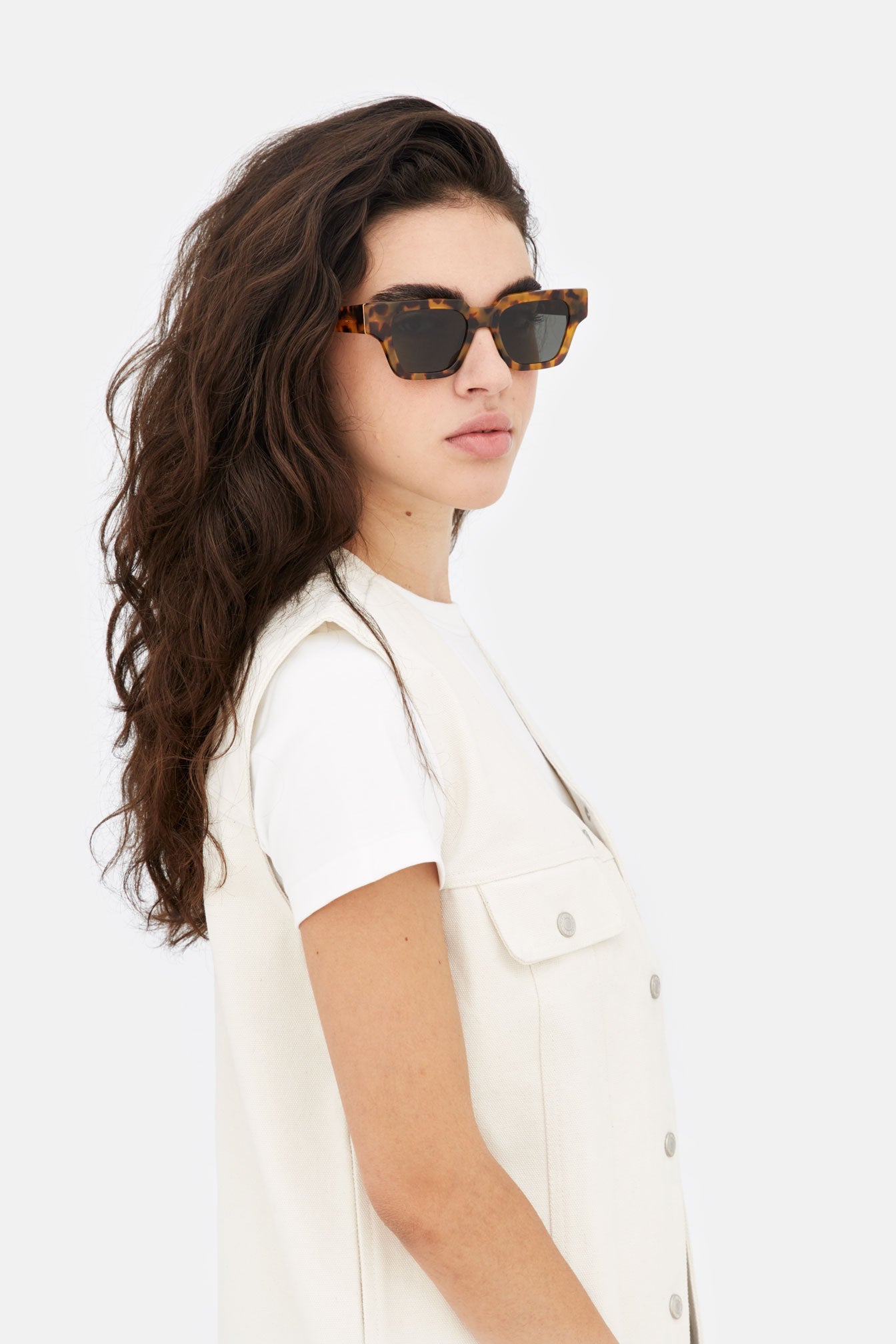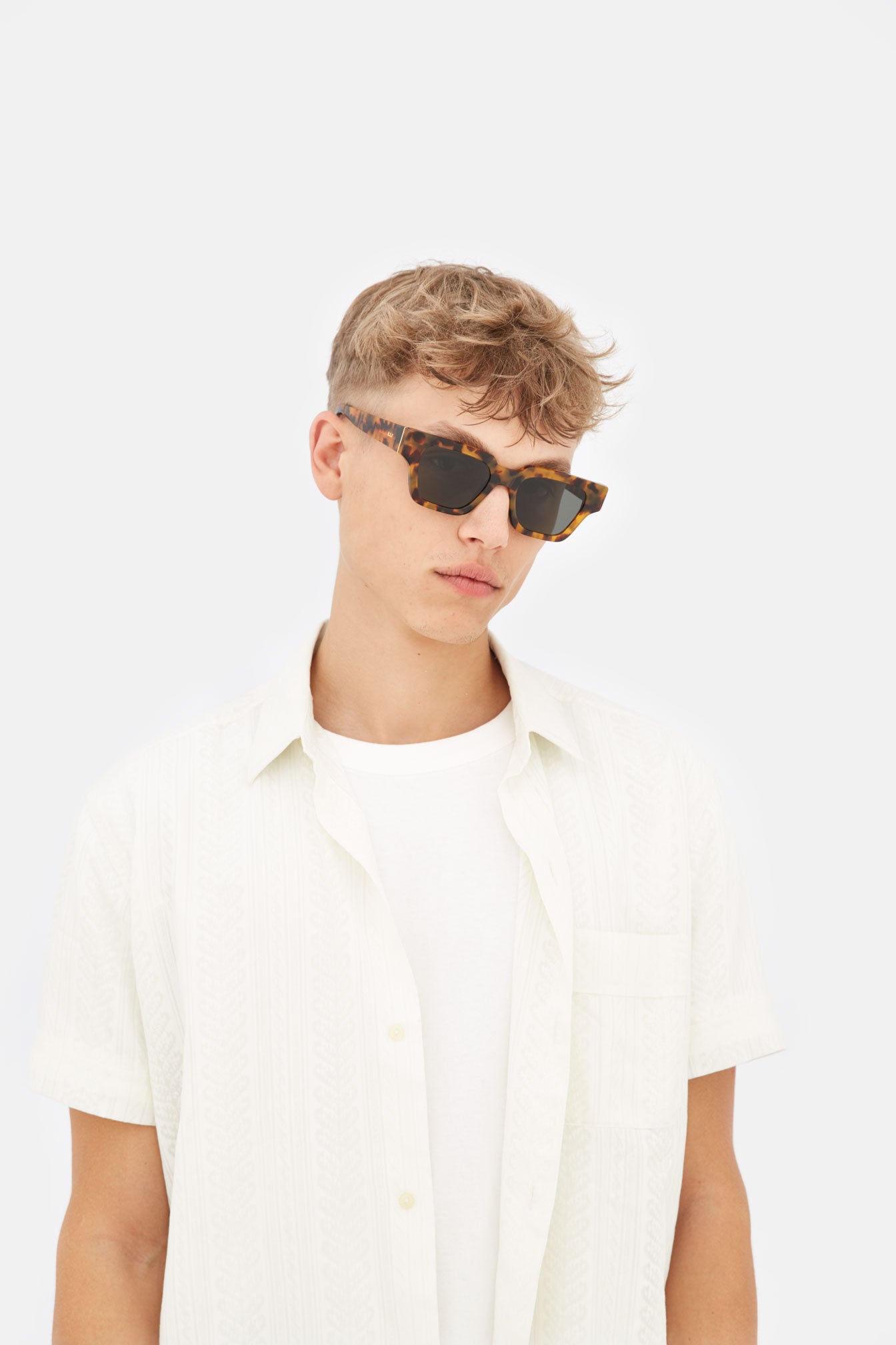 An iconic model designed to transcend seasonal trends, Storia matches the timeless elegance of casual style with a sharp street edge. Storia is a cool, sleek angular silhouette characterized by a geometric brow-line, with precise angles sculpted around its low nose-bridge and defined lines around its thick temple-tips. This is a quintessential unisex model that comes in warm Havana acetate with black lenses.
