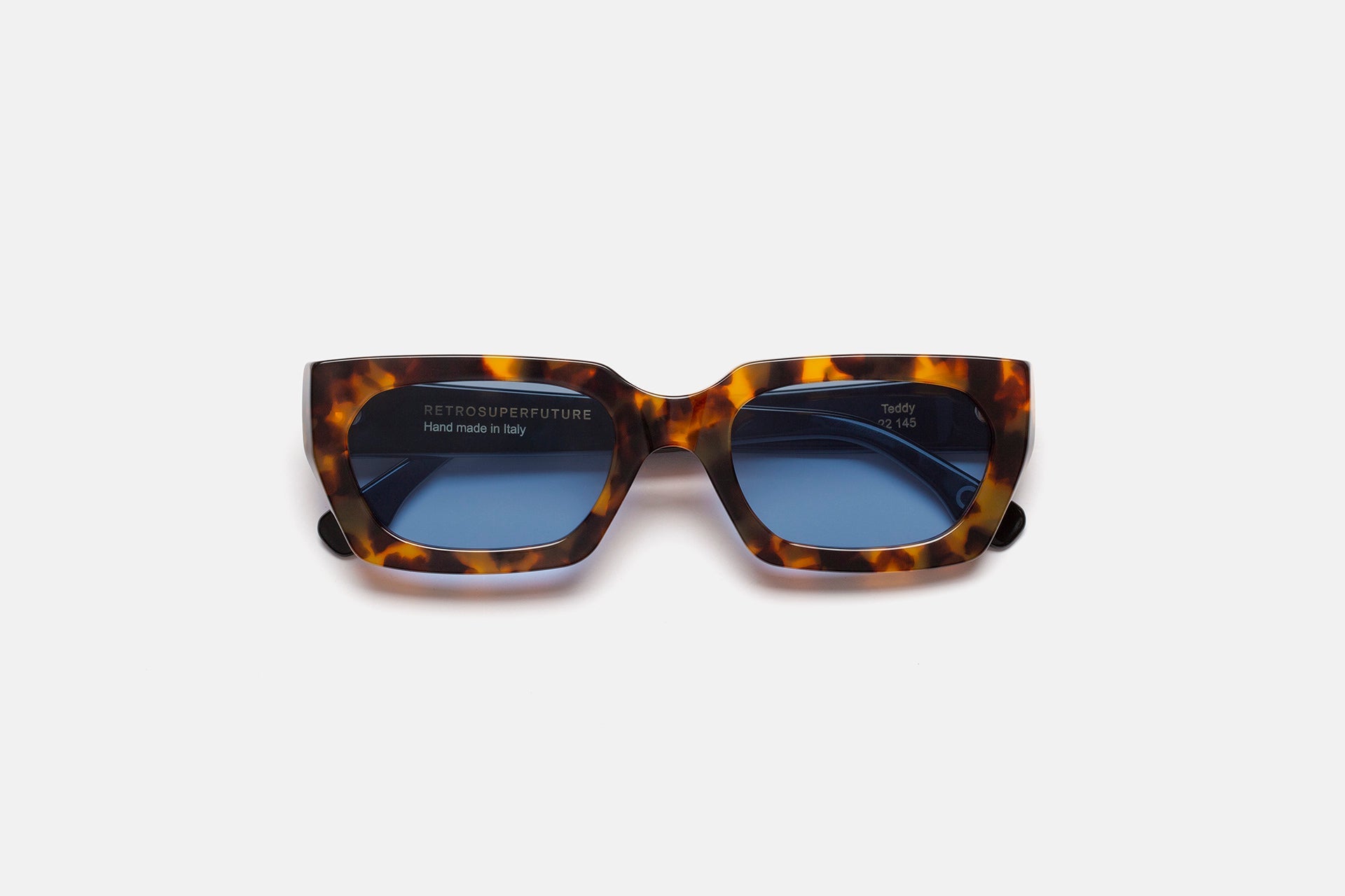 Teddy is a silhouette with a clean-cut and sharp edge. A determined wide frame with thick and bold acetate construction, Matching style with functionality. This model comes with a spotted Havana frame, black temples and blue lenses.