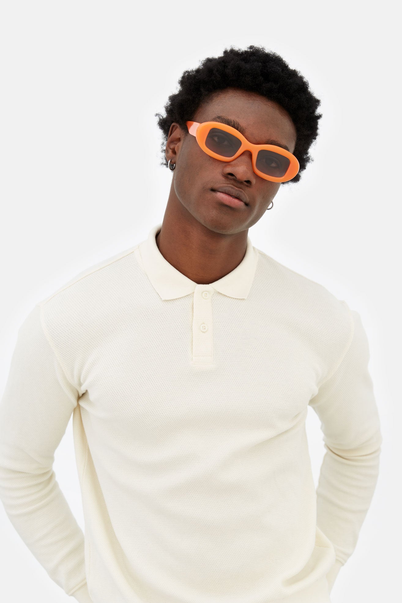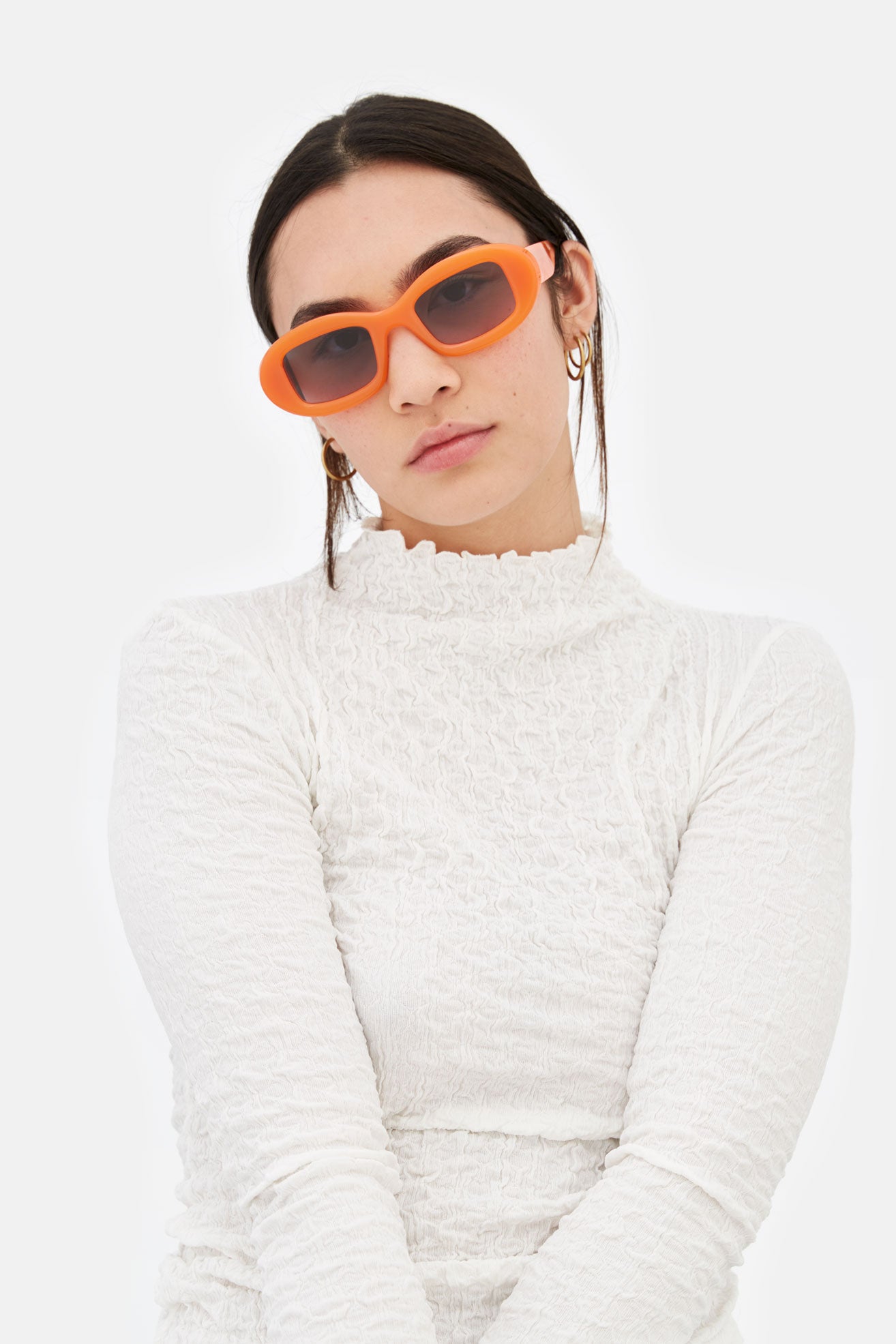 Contrasting geometries and sleek design characterise this modern icon: Tutto is a wide, horizontal shape featuring tick and curvy rims encasing squared lenses. Conceived as a playful yet ultra stylish silhouette, the Tutto embraces the timeless glamour of 1960s feminine shapes with a grungy contemporary unisex edge. This version of the Tutto features a bold orange acetate with purple fading lenses.