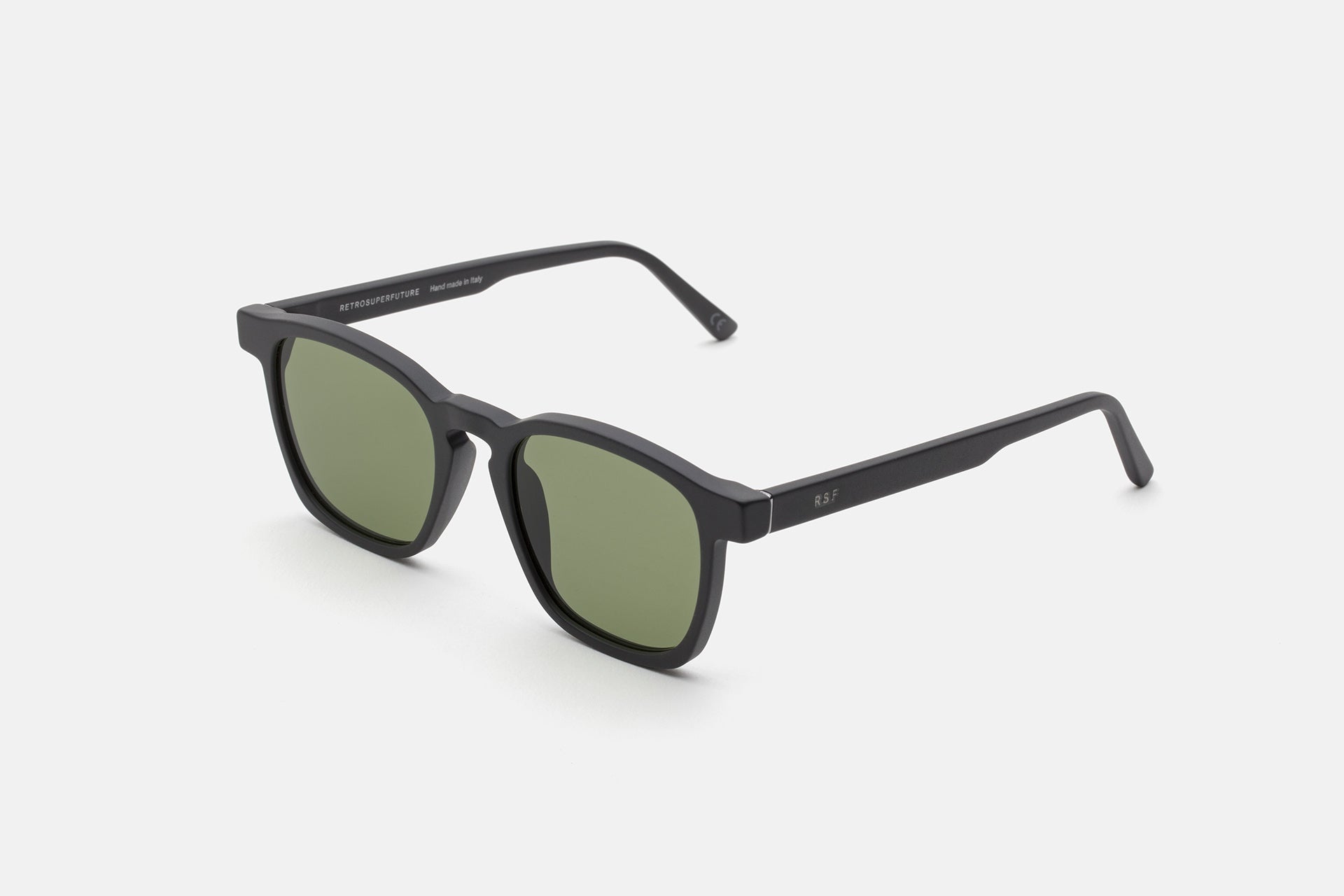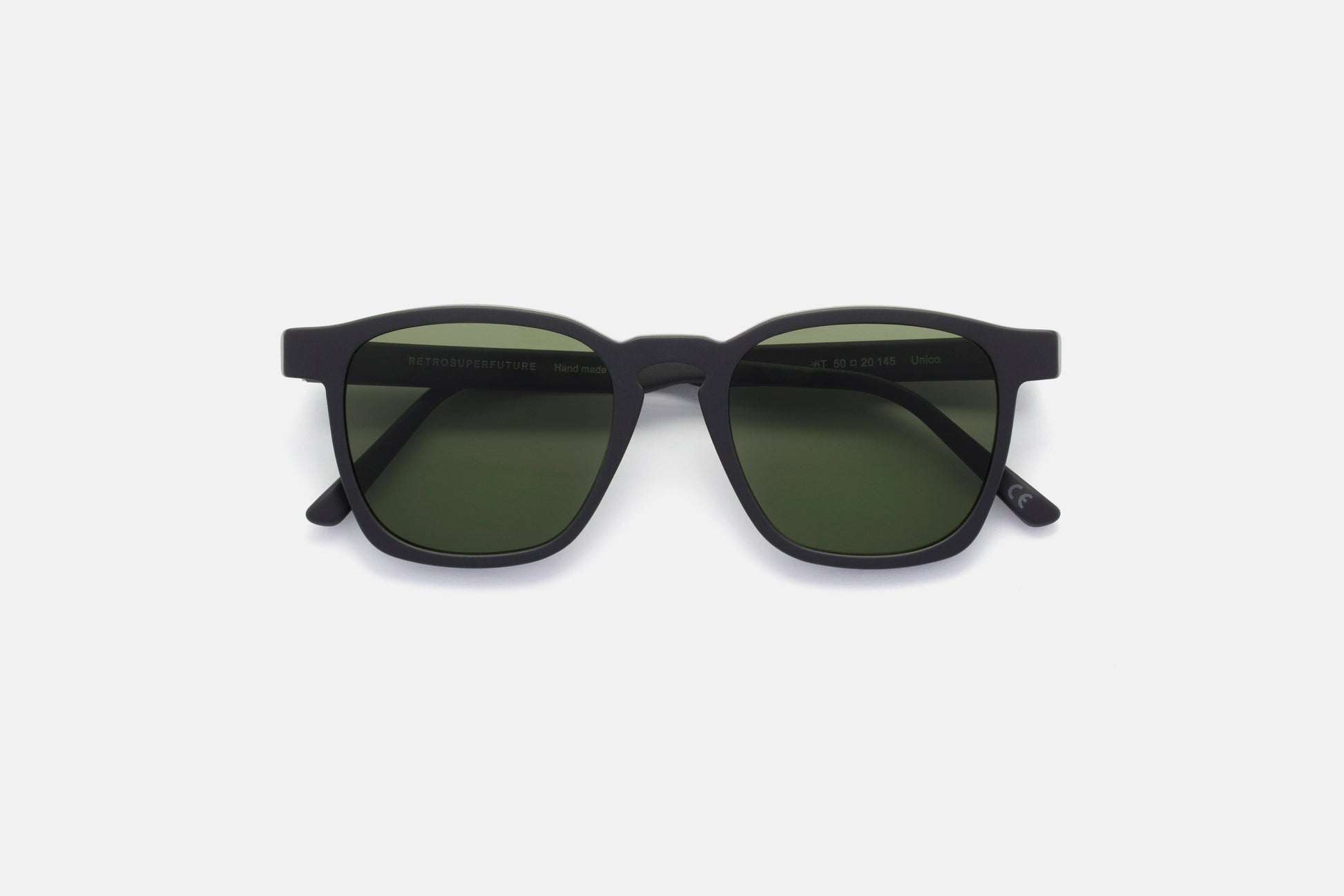 This edition of Unico captures cool tones and vibrant graphic finishes. Unico is an essential acetate shape with squared lenses, a keyhole nose-bridge and sharp temple tips. This version of Unico was pairs a matte black acetate with classic bottle green lenses. The box contains a semi-hard case and a cleaning cloth.