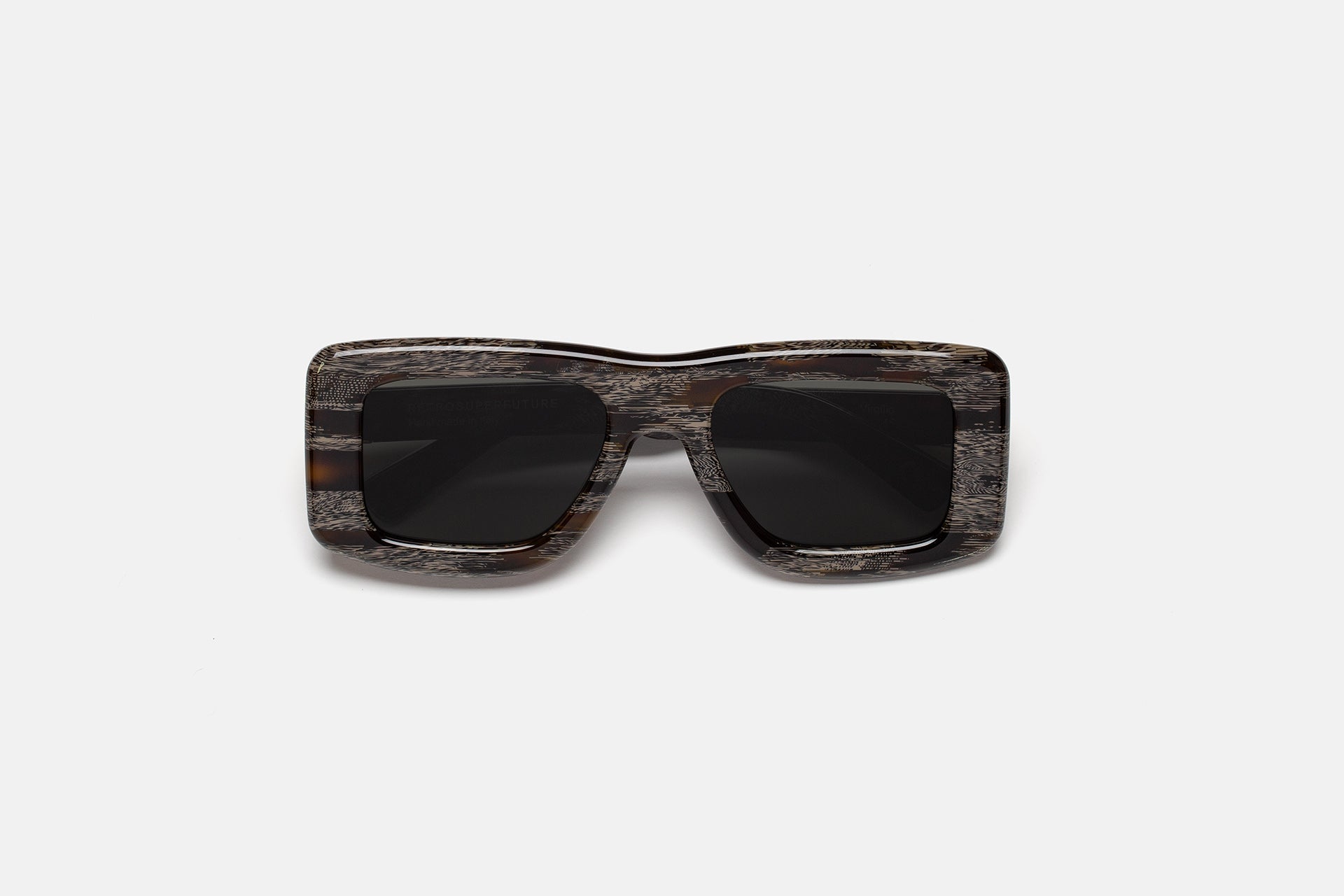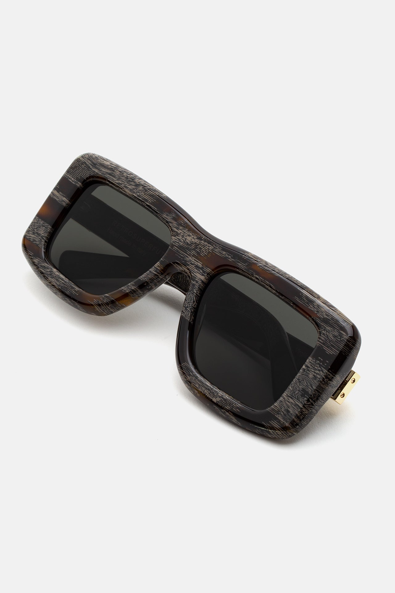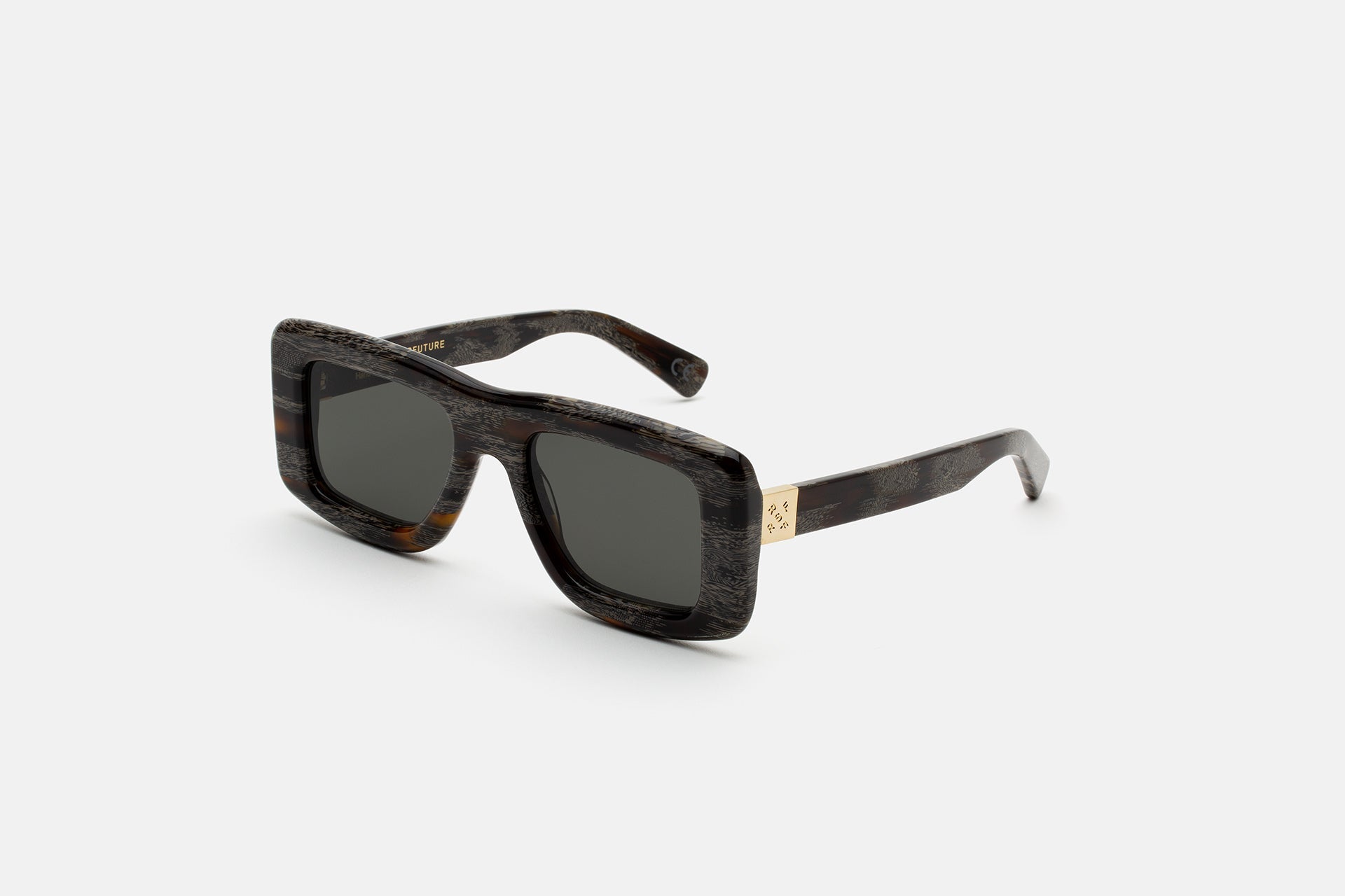 Virgilio is a design with a whole lot of meaning, starting from its name and origin of the shape. Other than the black, the two color-ways have been created using rare and ultra-limited dead-stock acetate, because even the most special things in life come to an end. This mask-like piece mounts a limited edition, dead-stock vintage acetate in grey marble, black lenses and sophisticated gold detailing on the temples.