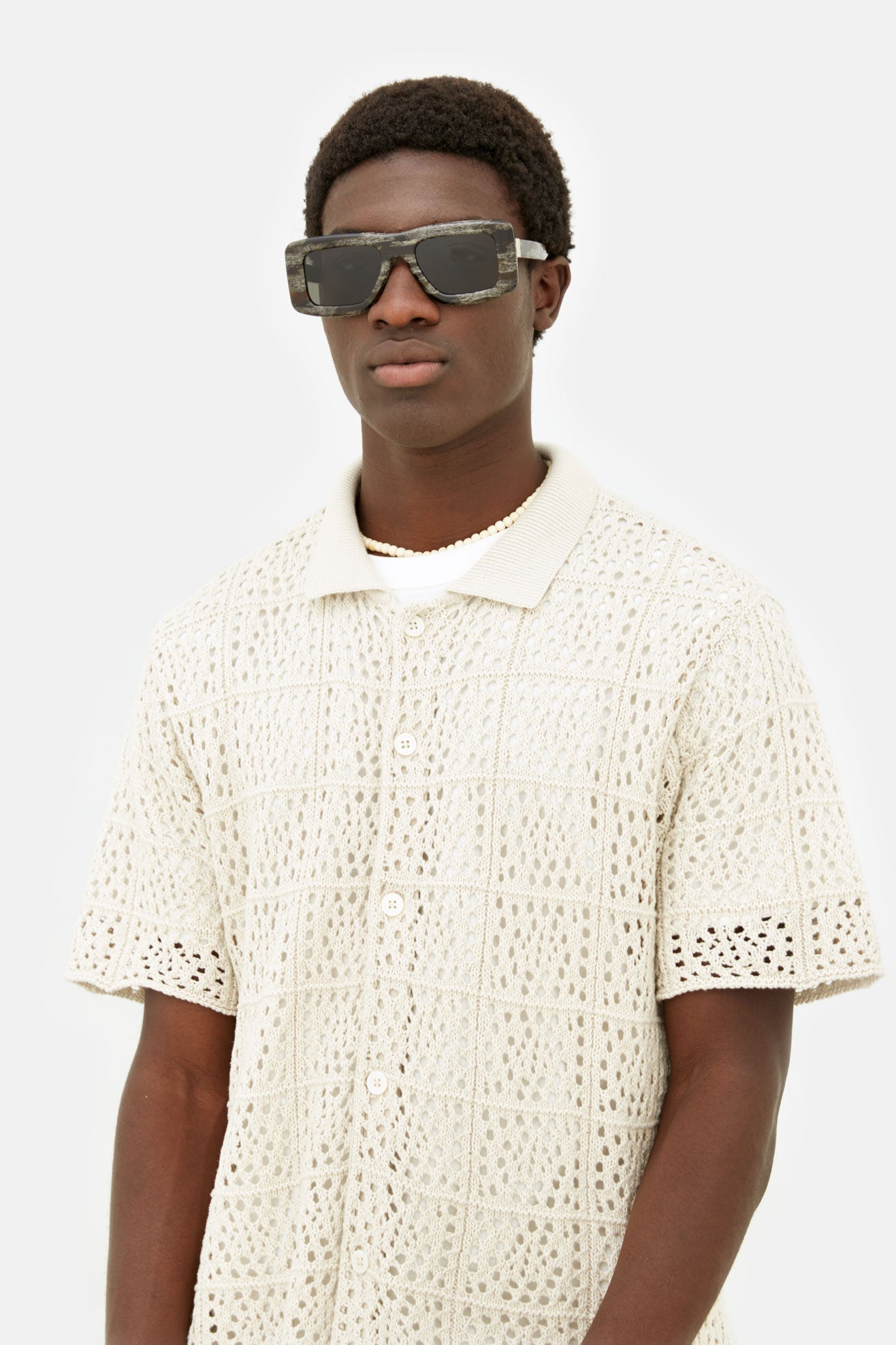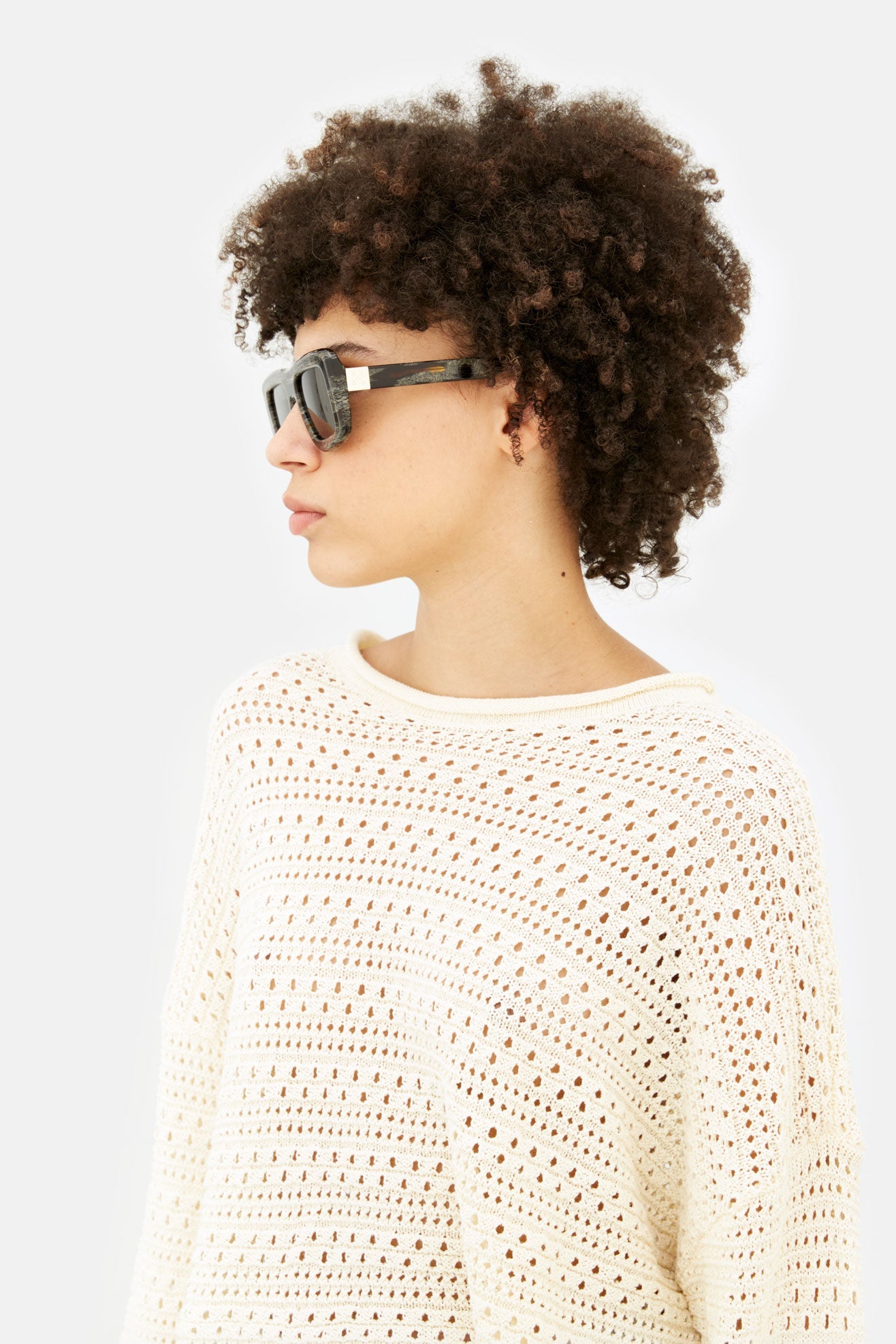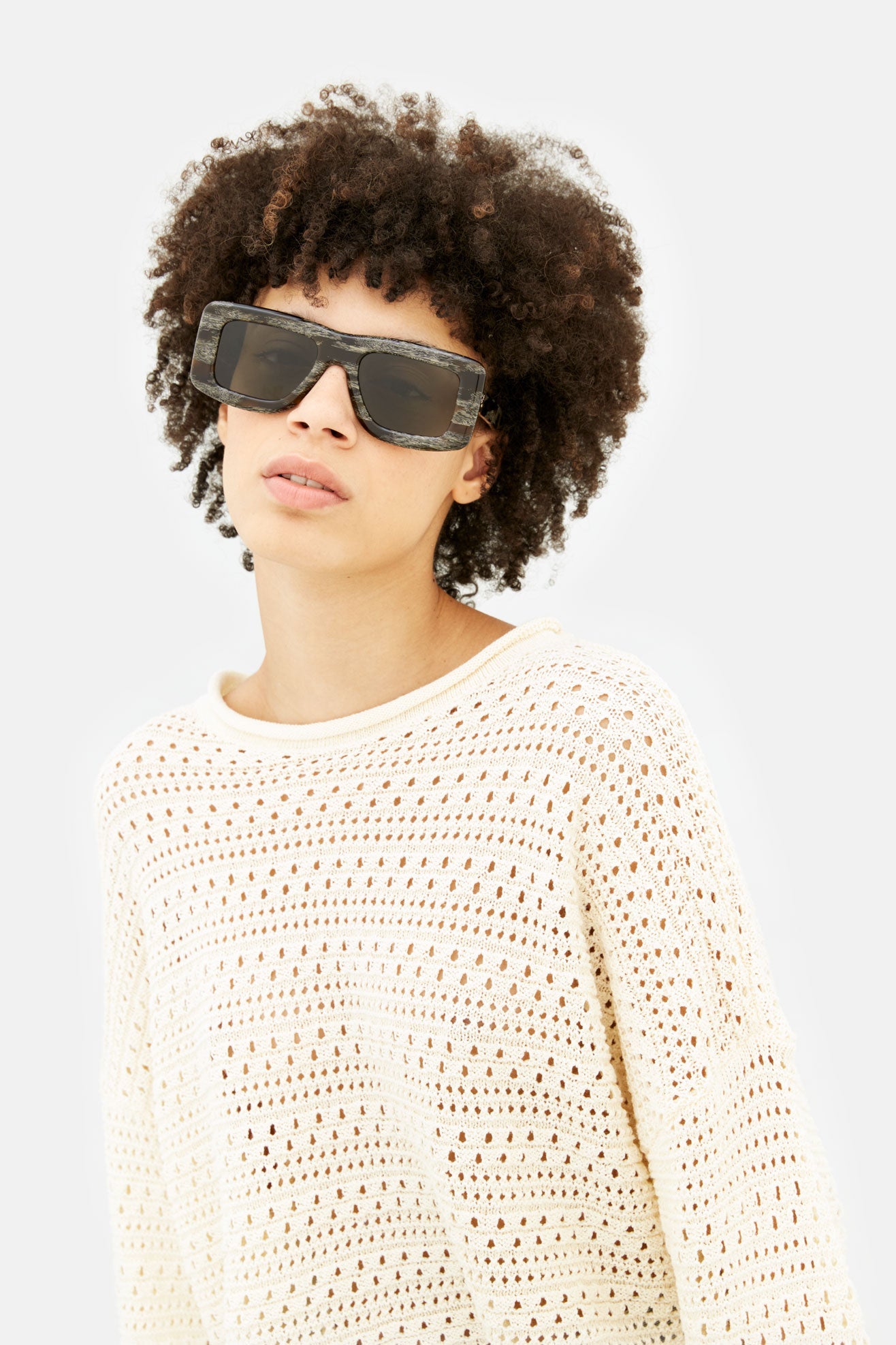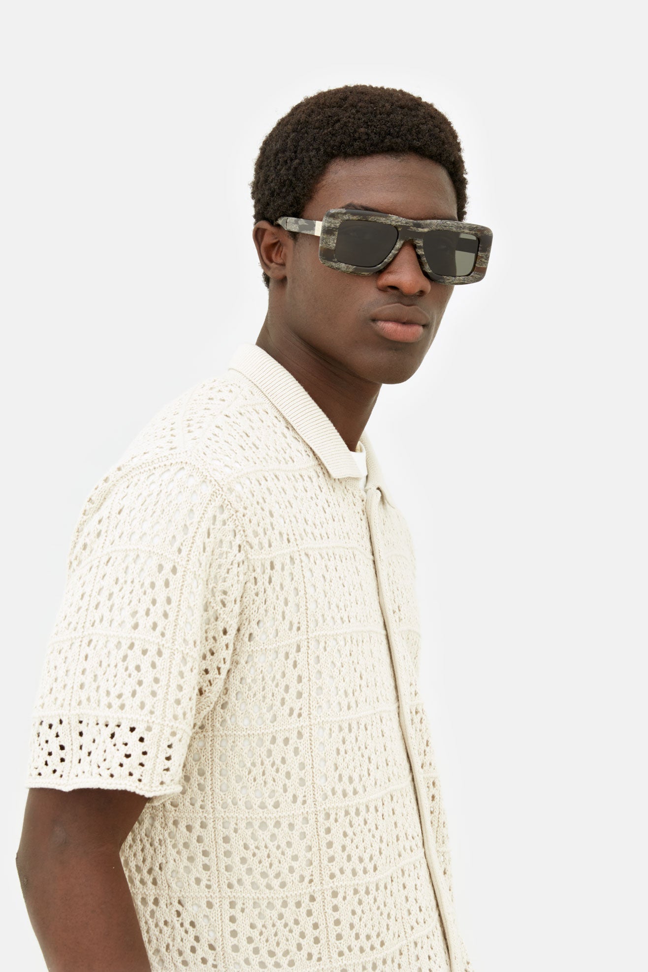 Virgilio is a design with a whole lot of meaning, starting from its name and origin of the shape. Other than the black, the two color-ways have been created using rare and ultra-limited dead-stock acetate, because even the most special things in life come to an end. This mask-like piece mounts a limited edition, dead-stock vintage acetate in grey marble, black lenses and sophisticated gold detailing on the temples.