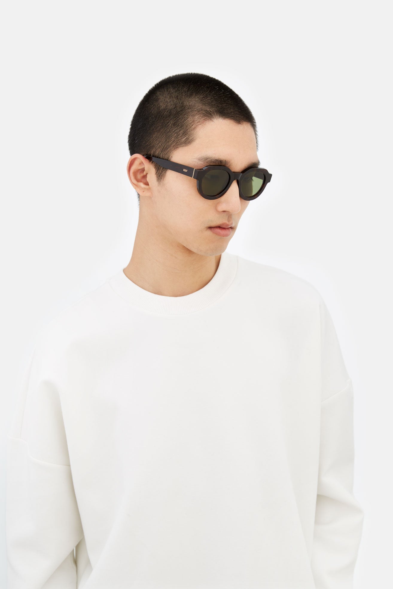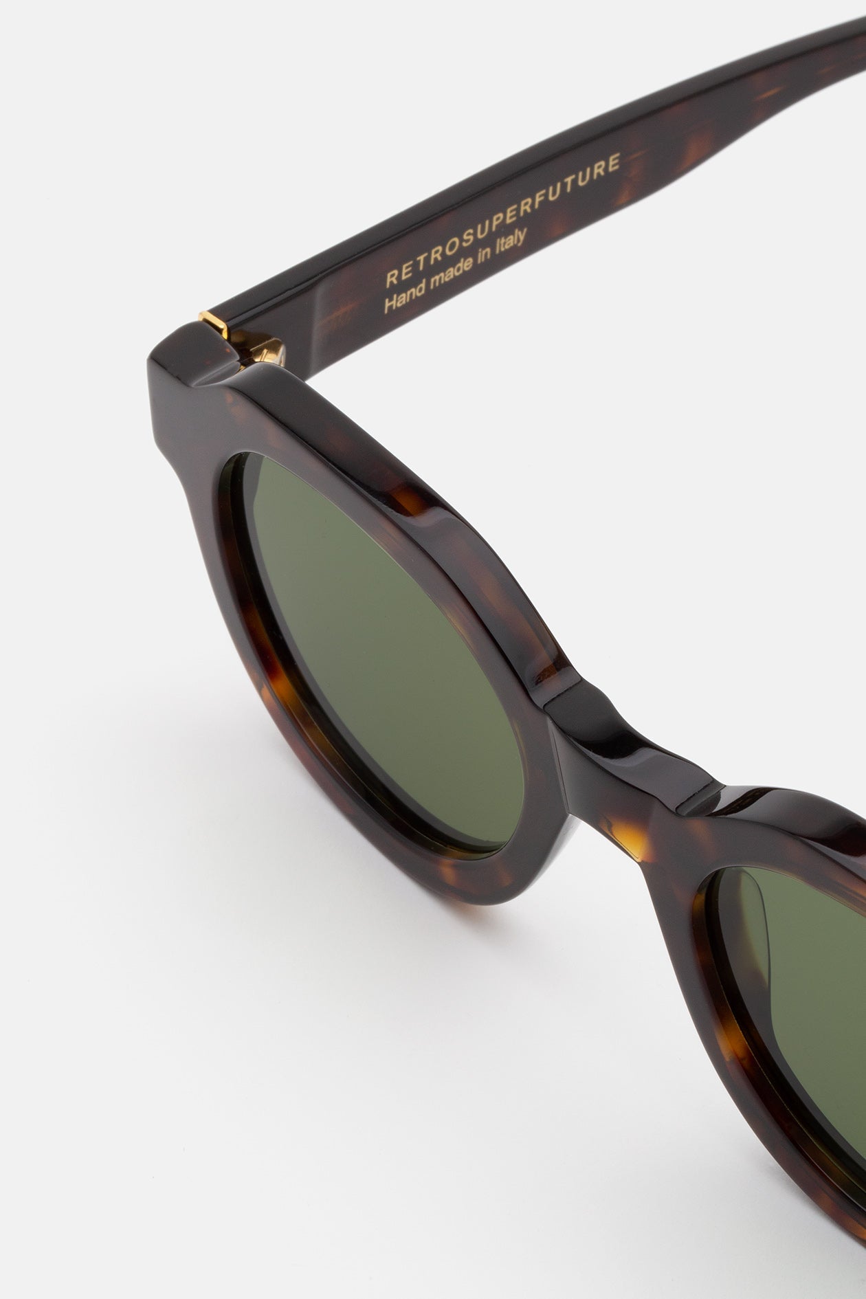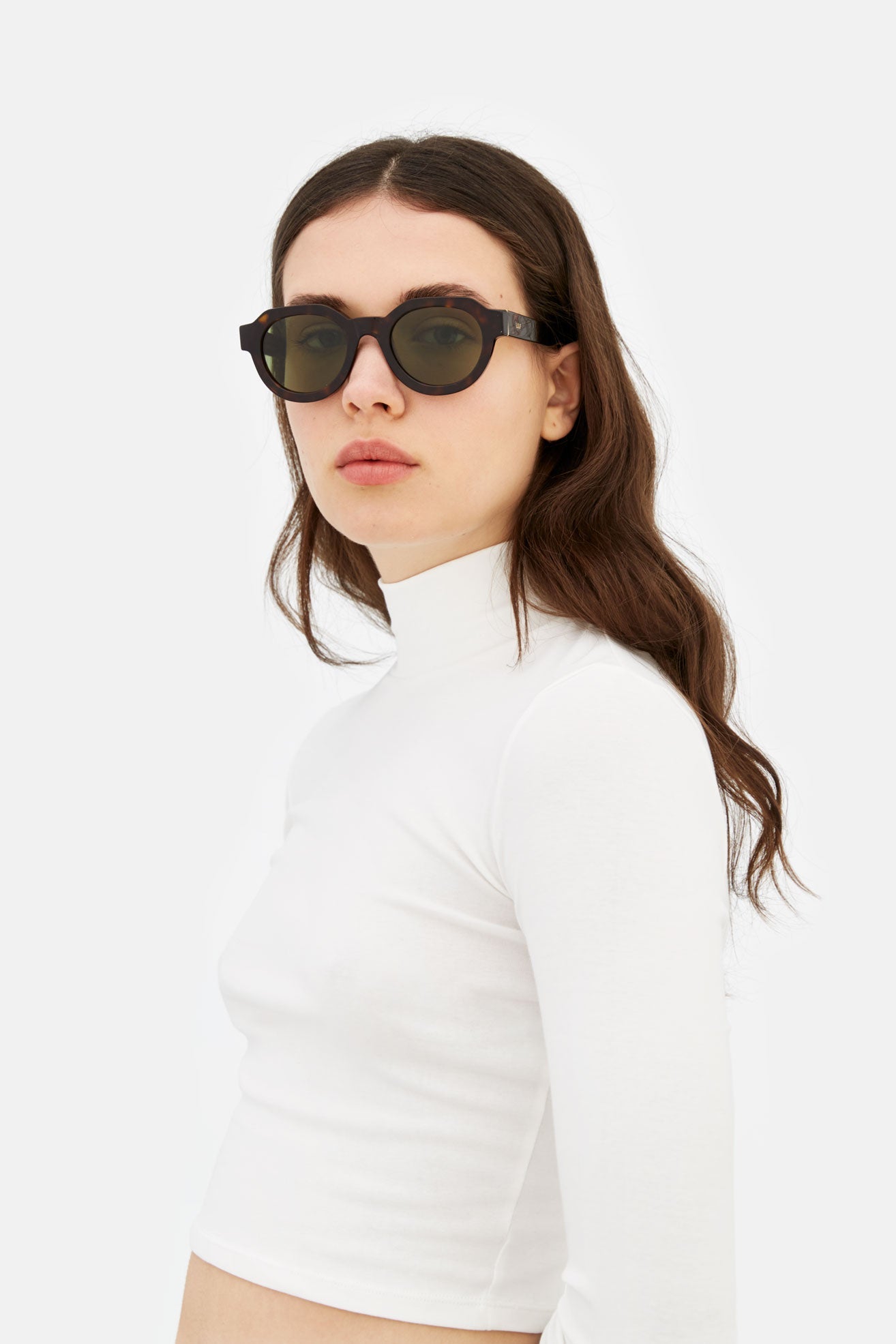 Vostro is a sleek rounded shape that captures the essence of timeless style, updating it with a contemporary design twist. Sharp, geometric rims are matched with soft oval lenses as an elevated version of classic rounded sunglasses. The model’s design is characterised by pentagonal shaped rims, with sturdy temple tips and a lowered nose-bridge for an essential yet determined, elegant piece. This version of Vostro features a dark 3627 Havana acetate and bottle green lenses.
