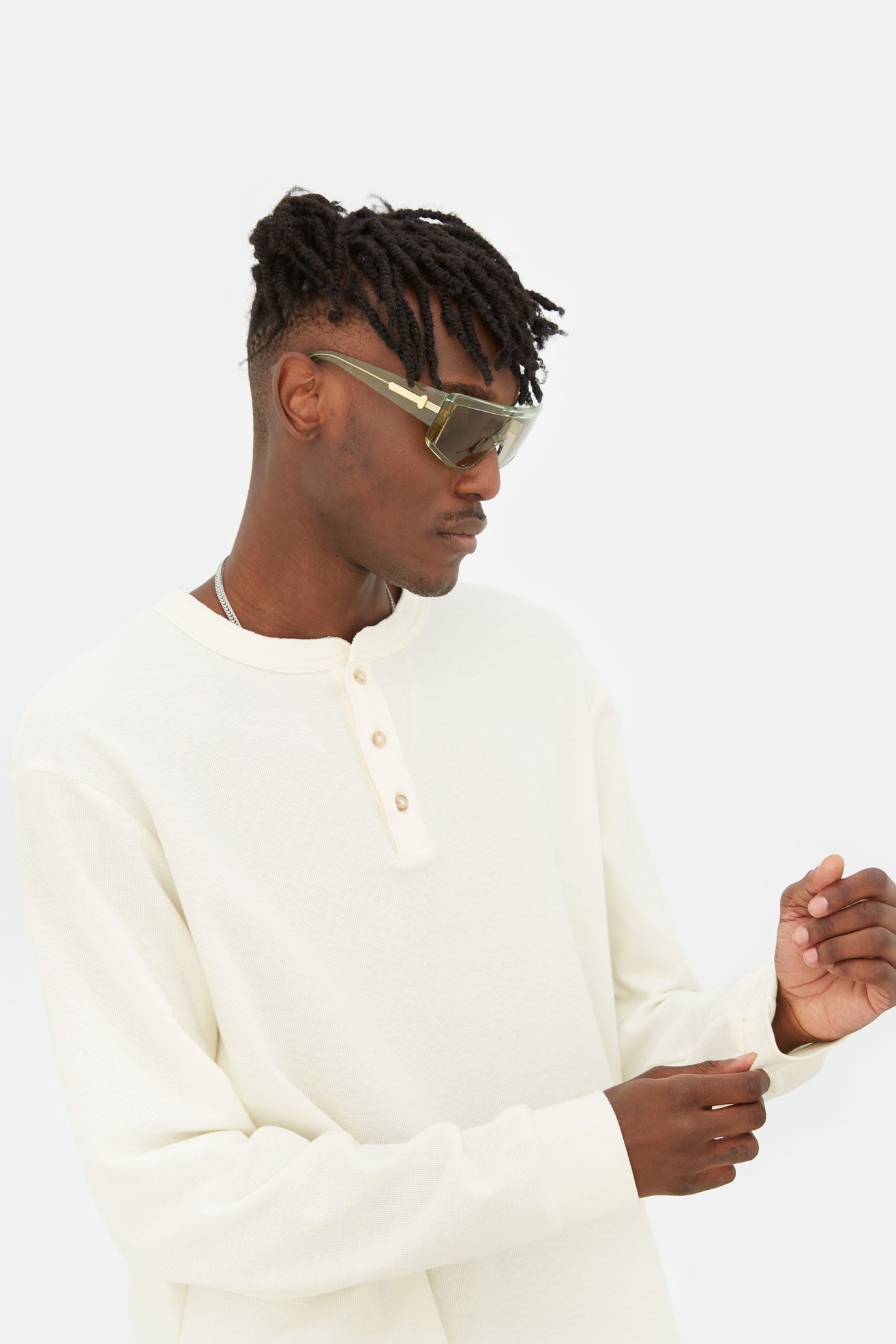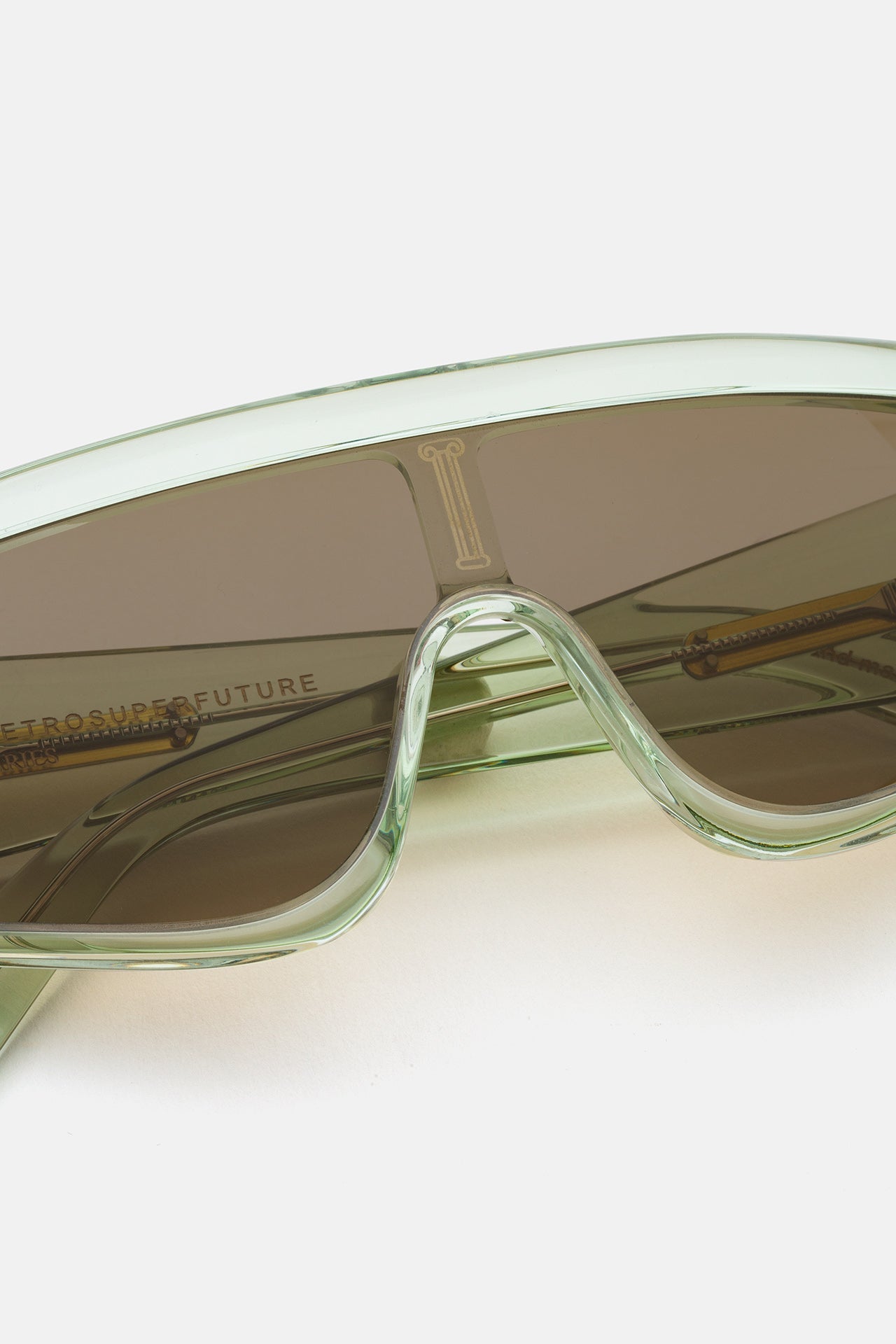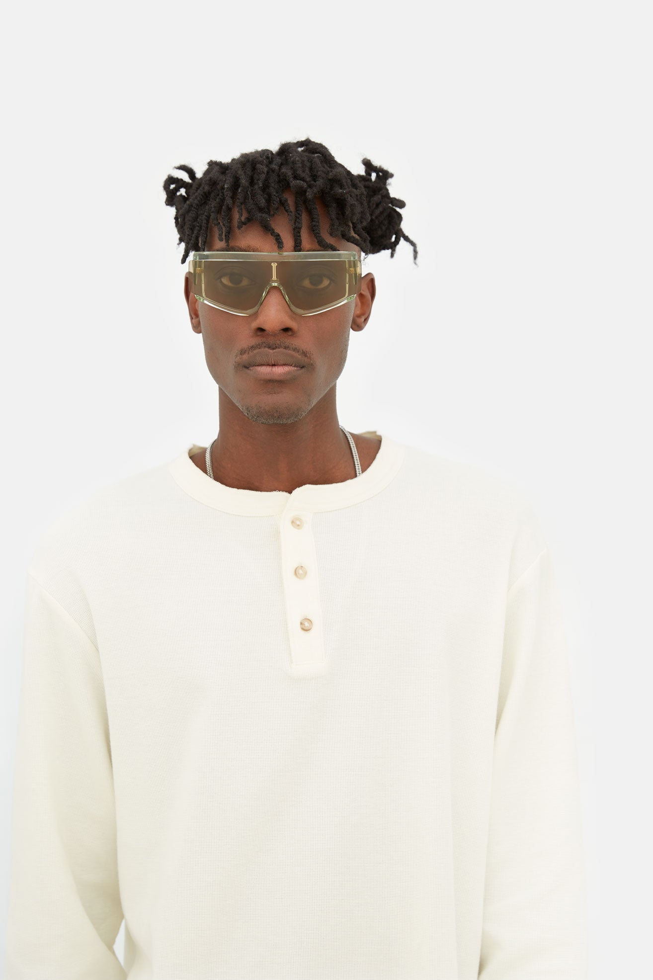 Developed for the exclusive collaboration with the cult British brand Aries, Zed was conceived as a genderless silhouette that mixes diverse conceptual references, from high-tech sportswear to sleek aesthetics of contemporary design. This approach encapsulates Aries’ disruptive and multi-faceted visual language. With its bold streamlined design, this eyewear piece features a single high-grade shield lens mounted in a thick acetate structure, the technical flex hinges allow extra comfort for the design’s wide temples. The final touch was given by Aries, whom customised the piece with its signature broken Roman column, creating two gold metal decors for the temples and a central graphic on the frame’s prominent shield. This version comes in a light sage crystal acetate paired with a tinted camel colored lens.
