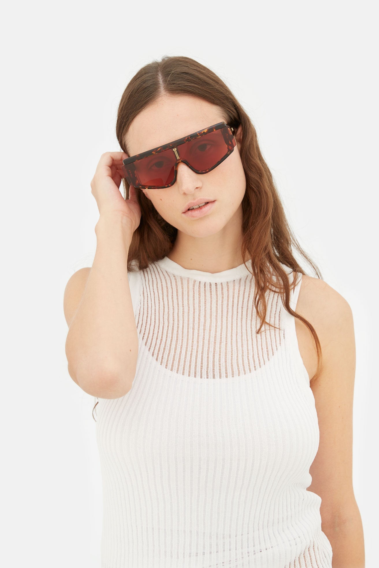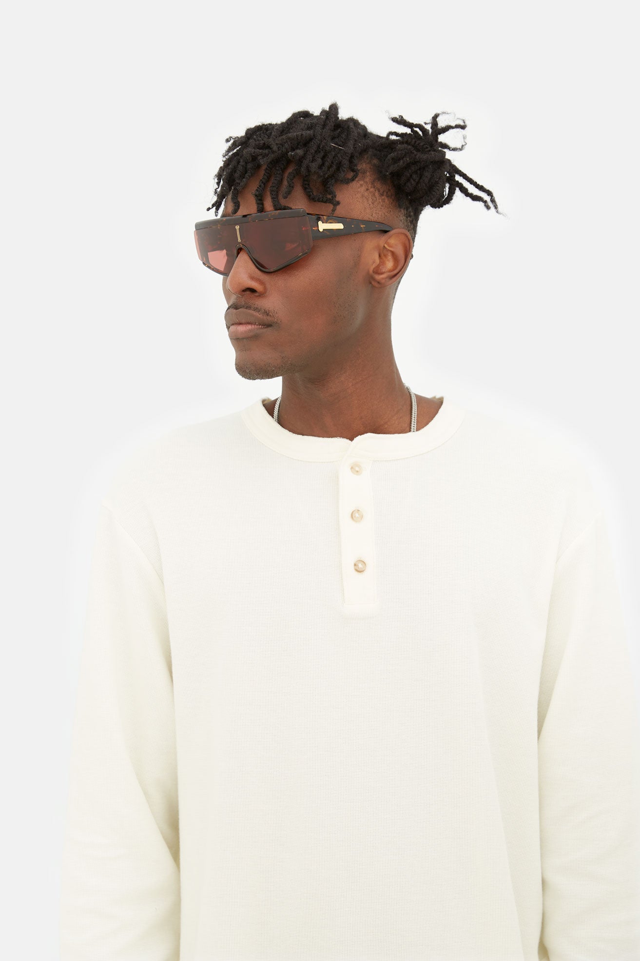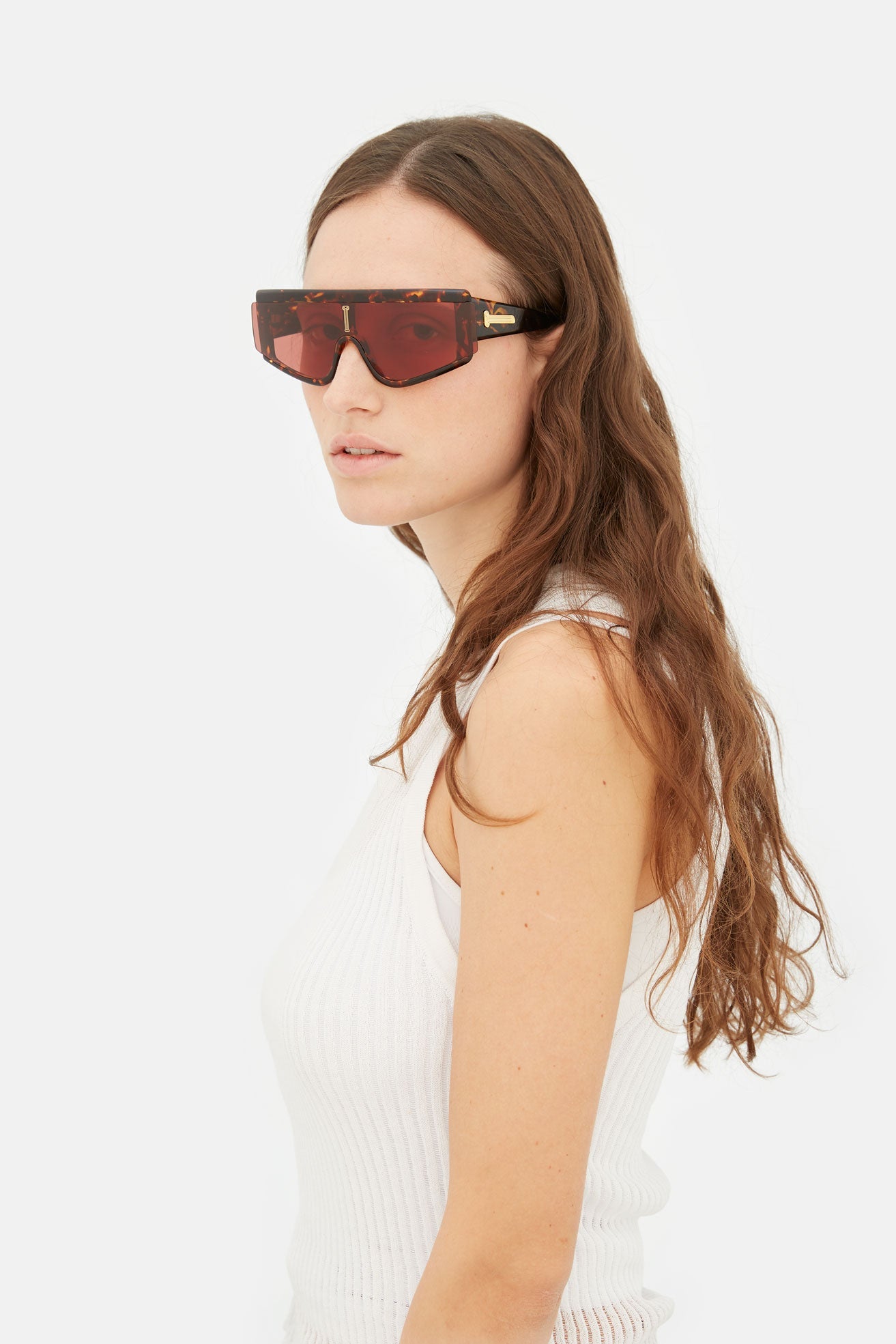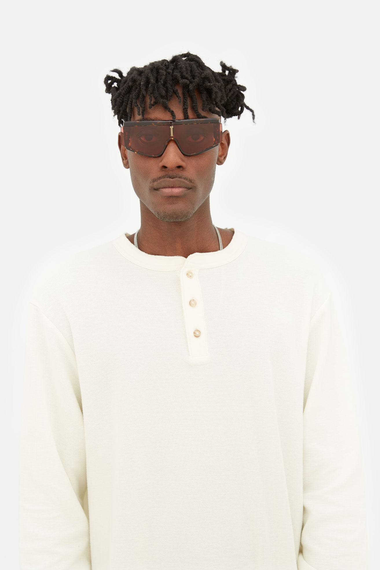 Developed for the exclusive collaboration with the cult British brand Aries, Zed was conceived as a genderless silhouette that mixes diverse conceptual references, from high-tech sportswear to sleek aesthetics of contemporary design. This approach encapsulates Aries’ disruptive and multi-faceted visual language. With its bold streamlined design, this eyewear piece features a single high-grade shield lens mounted in a thick acetate structure, the technical flex hinges allow extra comfort for the design’s wide temples. The final touch was given by Aries, whom customised the piece with its signature broken Roman column, creating two gold metal decors for the temples and a central graphic on the frame’s prominent shield. This version comes in a light sage crystal acetate paired with a tinted camel colored lens.