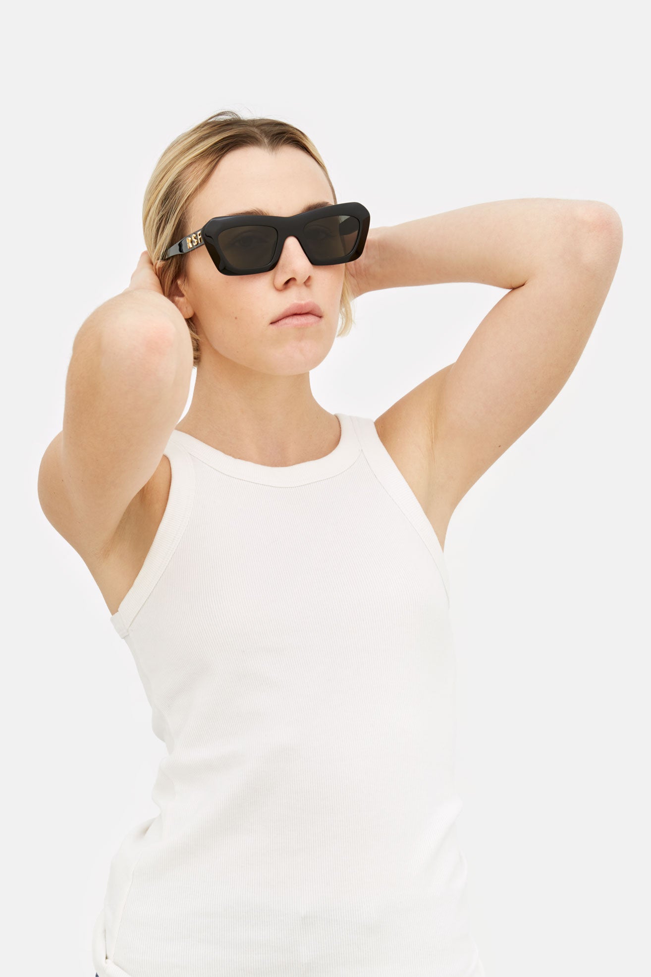 Zenya is a statement piece of eyewear: a chunky, oversized frame, designed as a modern interpretation of timeless cat-eye frames. The v-shaped brow-line gives a unique flair to these sunglasses for an unmistakably cool piece that will elevate any style. A highly recognisable, iconic silhouette, you can imagine seeing Zenya everywhere during the summer months. This version of Zenya comes in a black acetate with matching black lenses.