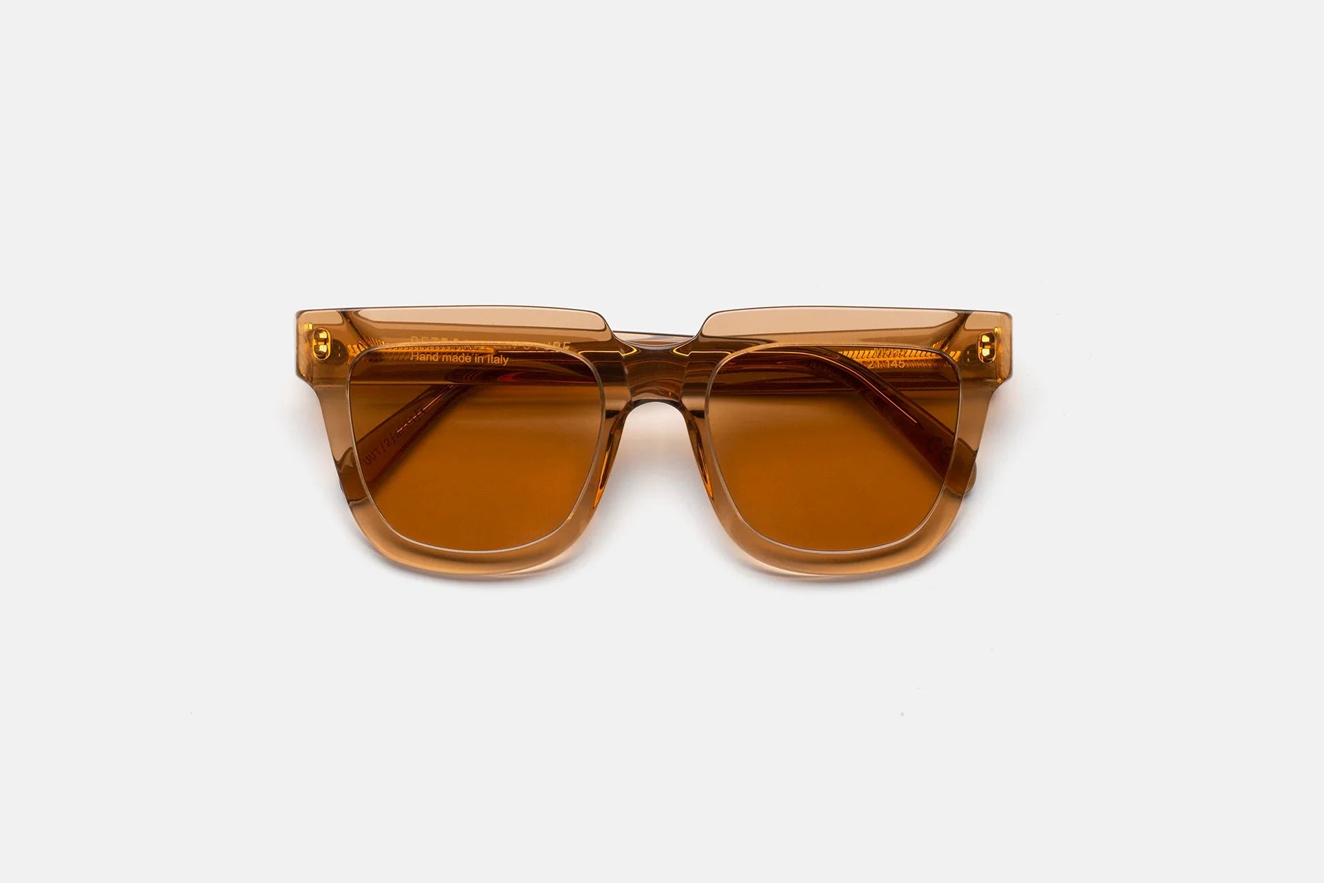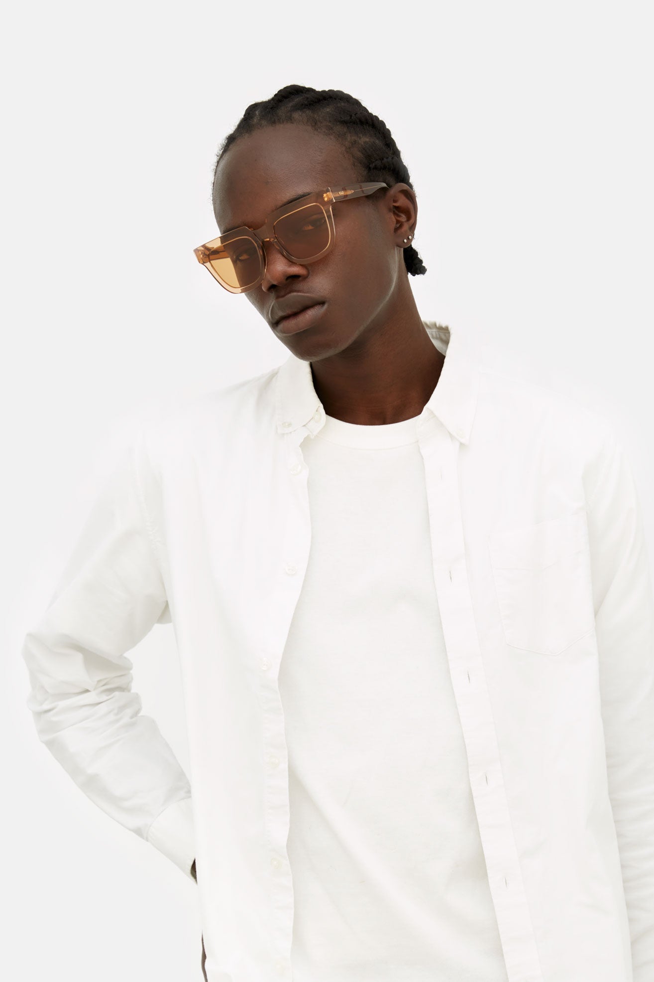 Modo is a chunky oversized piece that captures the essence of Italian glamour: bold and iconic yet casual and essential. Characterized by squared lenses and thick rims this silhouette is all about clean lines and carefully defined detailing. Modo goes back to RSF’s roots – using the exceptional Italian acetate to craft modern sunglasses. This is an earthy tone-on-tone version with ochre crystal tinted acetate and matching lenses.