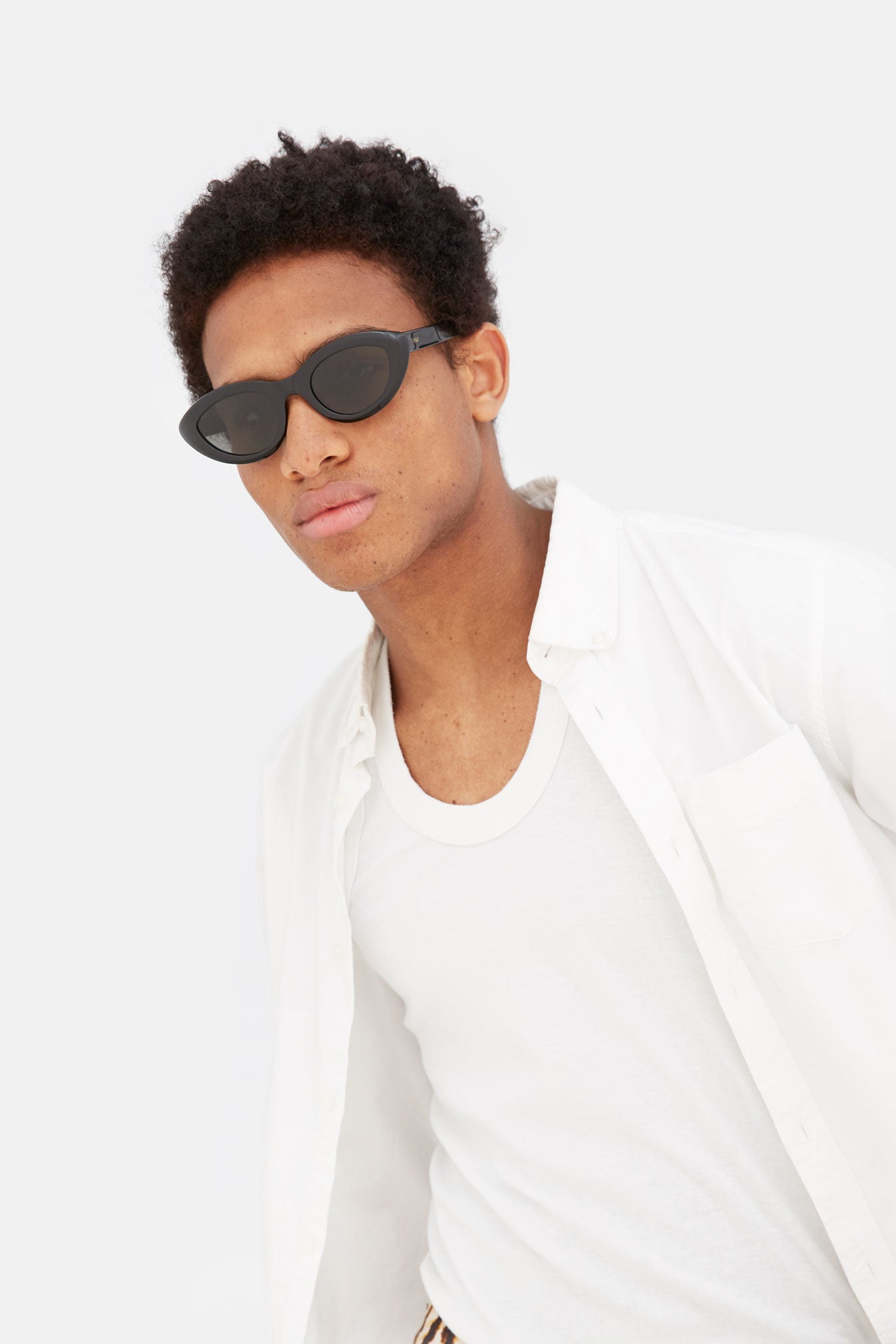 Cocca is a playful silhouette characterized by its thick curvaceous lines and features. A fresh interpretation of cat-eye vintage frames, with thick acetate construction, low nose-bridge and wide lenses. This model comes in a black acetate with black lenses.